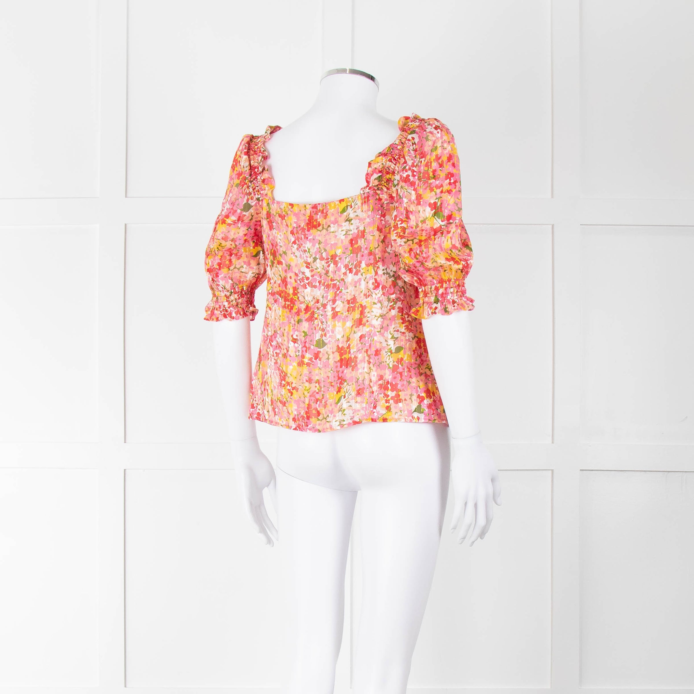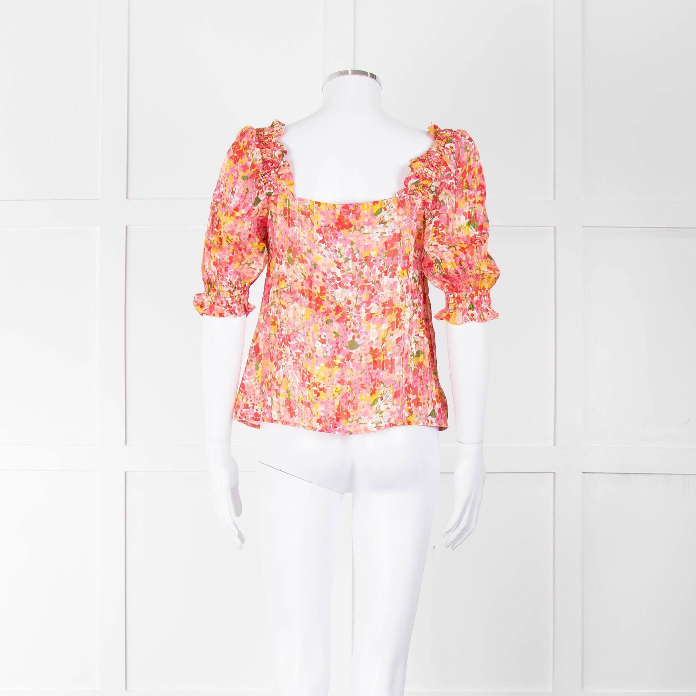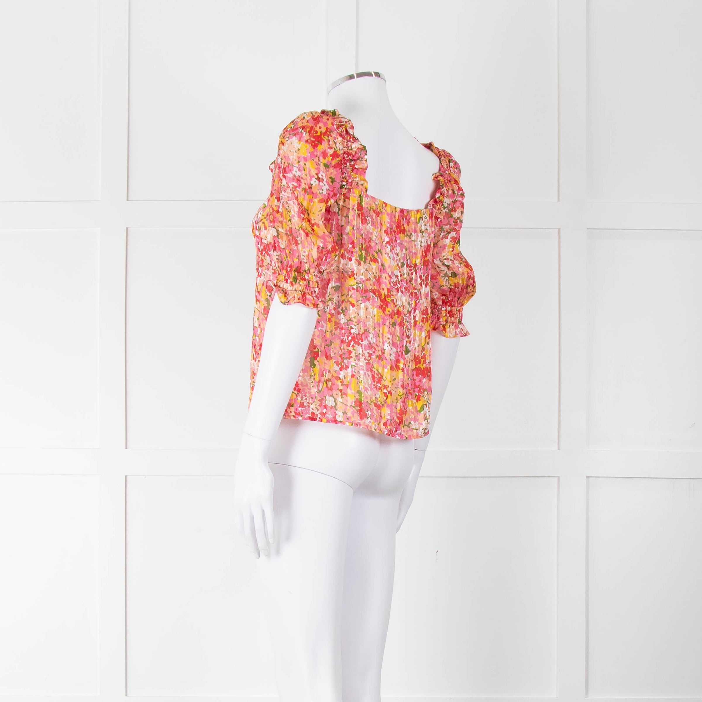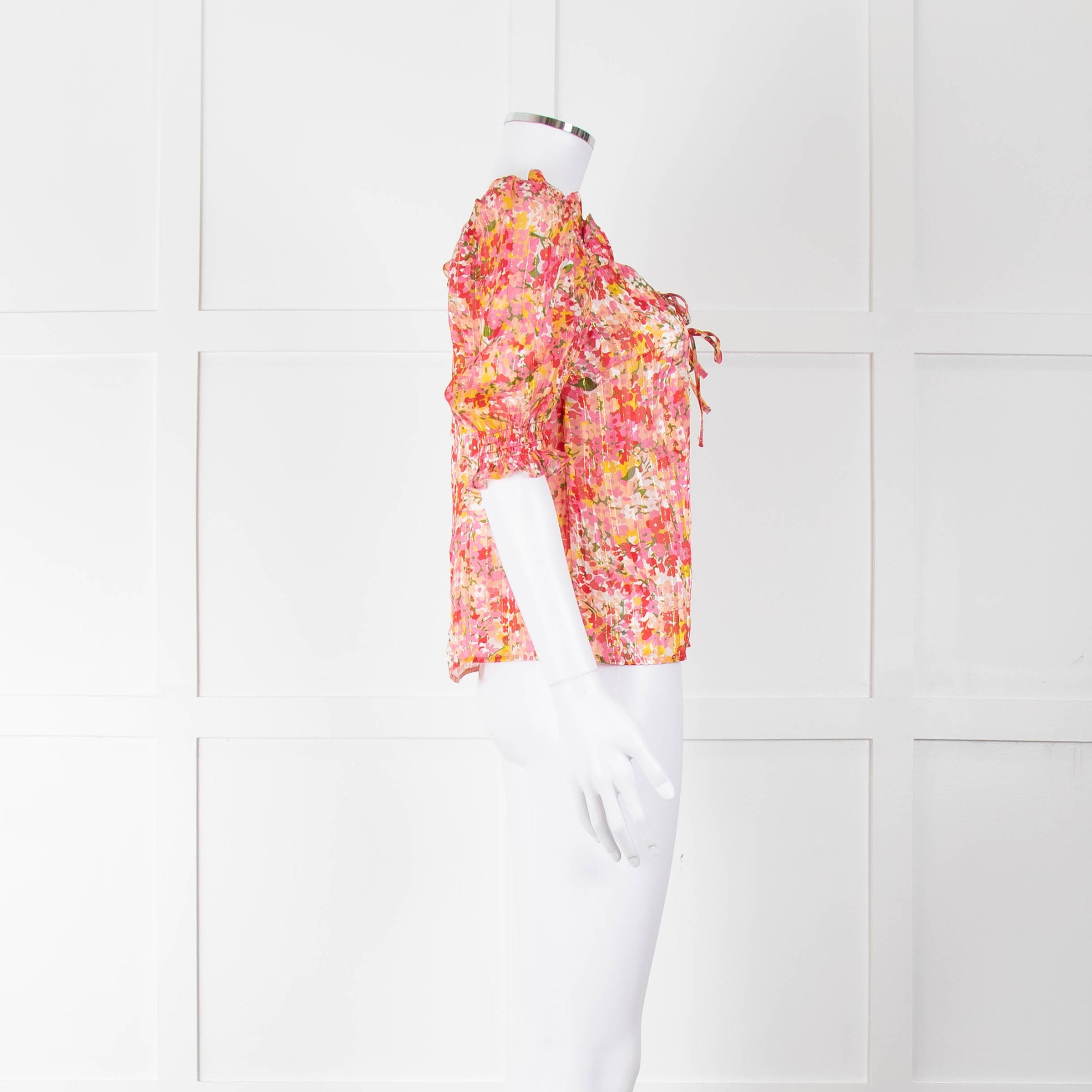 Sezane pink, red and green floral silk gold lurex stripe top with a v-shaped tie neckline and elasticated frilled sleeve cuffs.