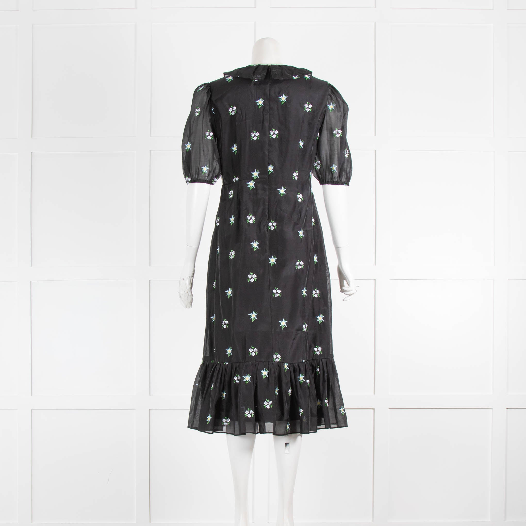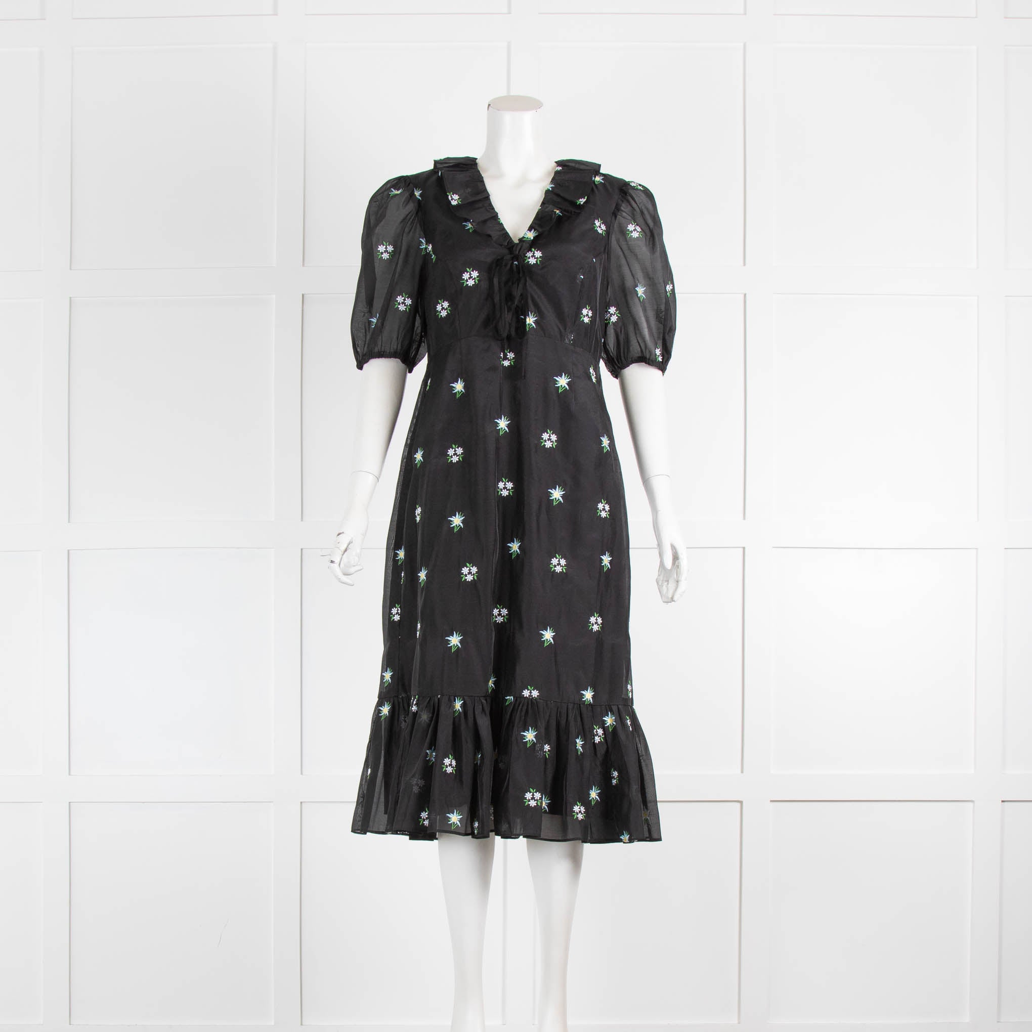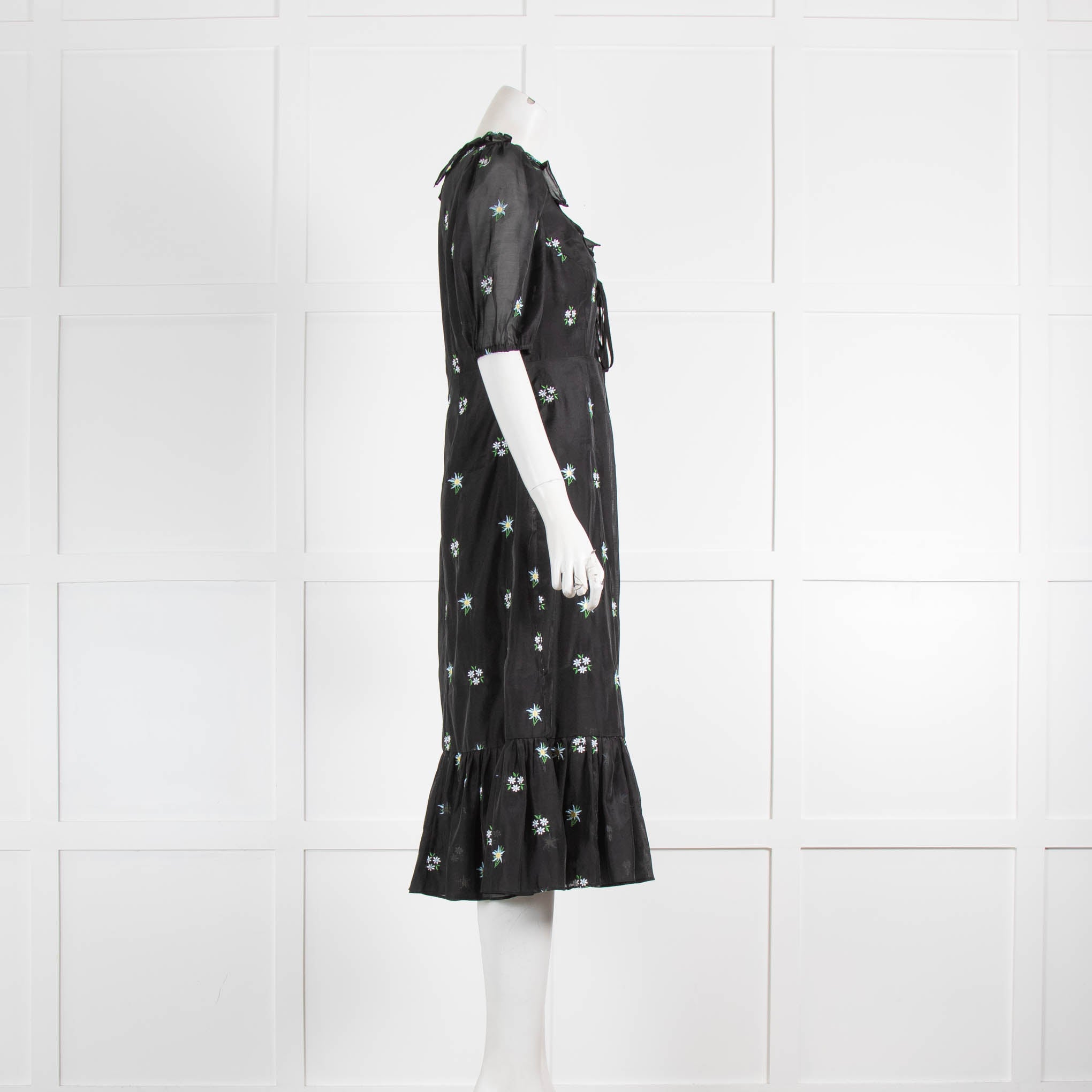 Shrimps black embroidered floral puff sleeve midi dress fully lined with a lace-up front, frill collar detail, frill at the hem and invisible zip at the back.