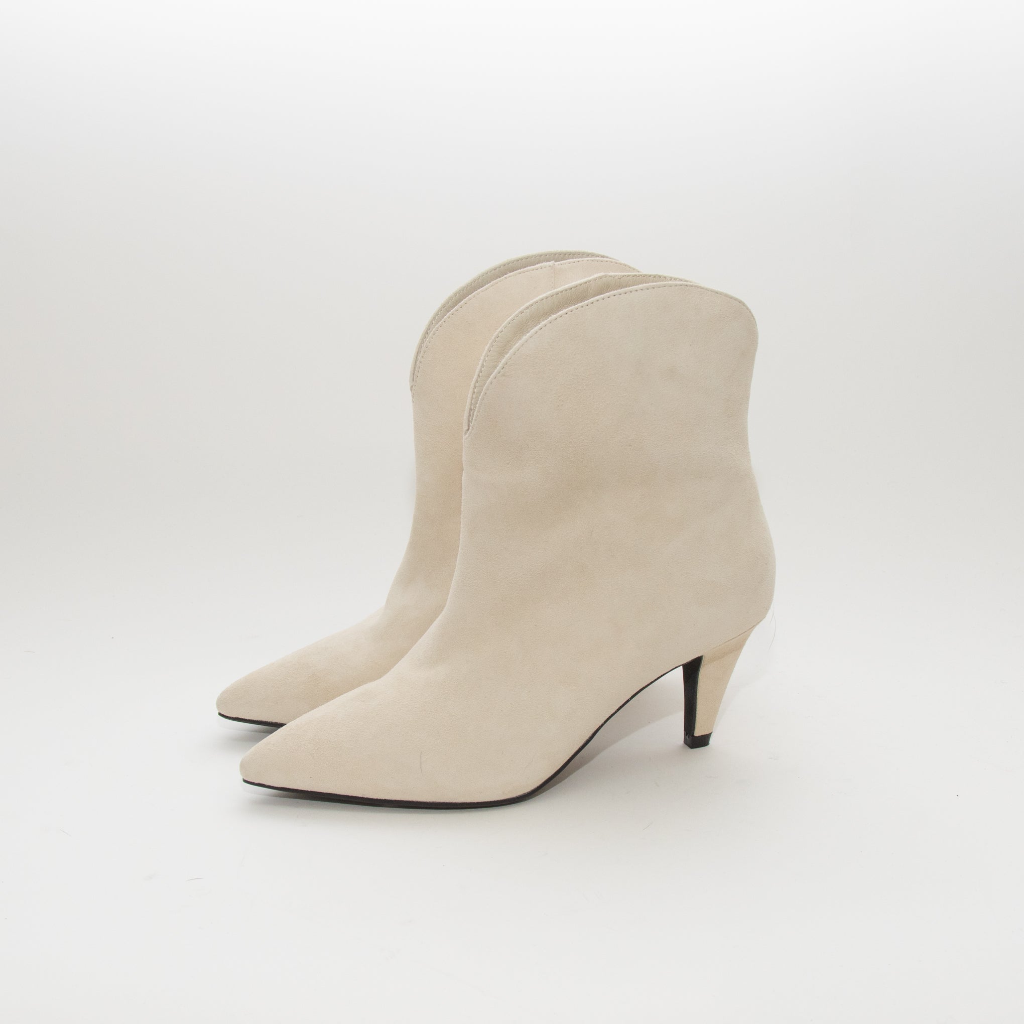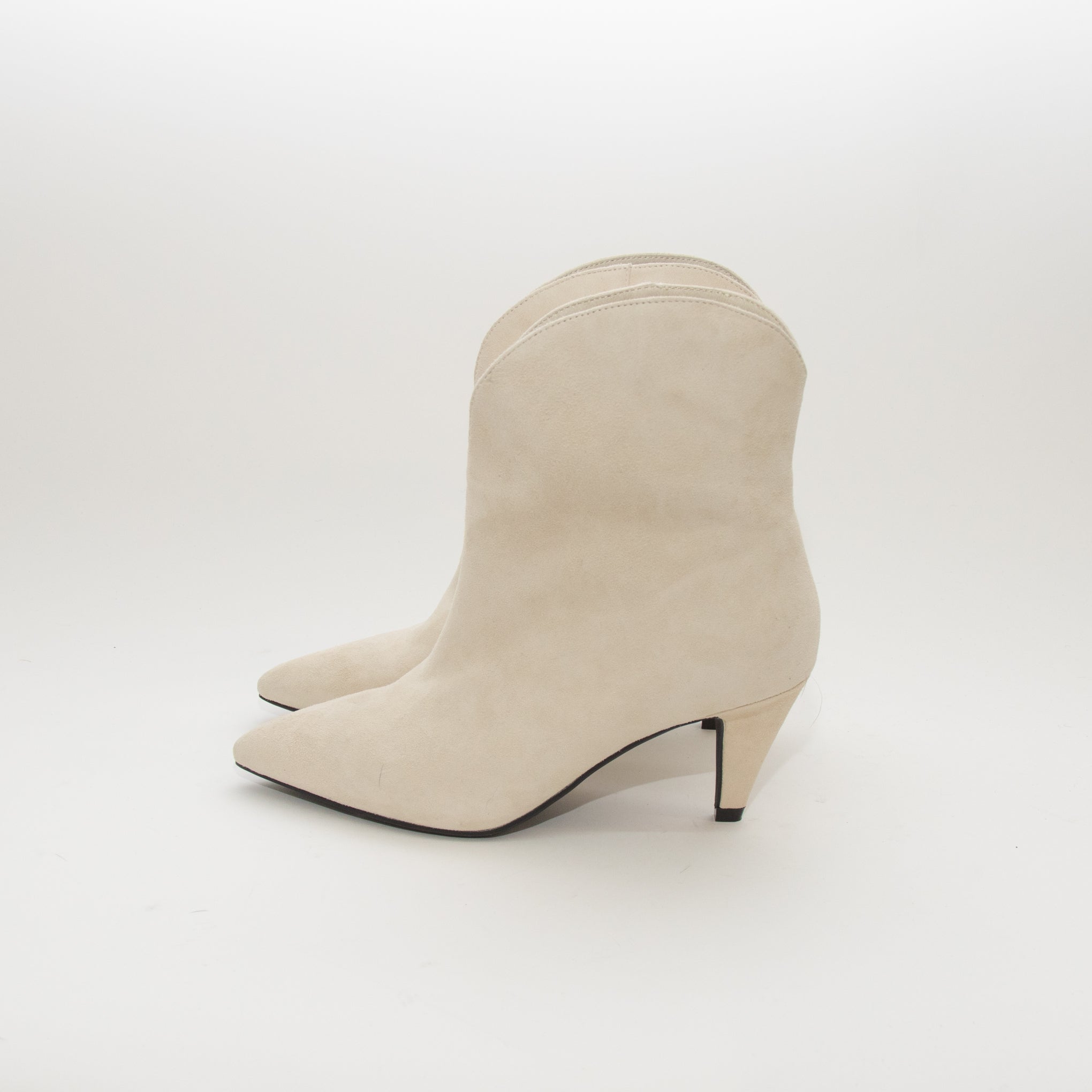 Sofie Schnoor cream suede pointy toe ankle boots with a curved top opening, tonal top stitching, a 70mm tapered heel, and rubber soles. Accompanied by the original dust bag.