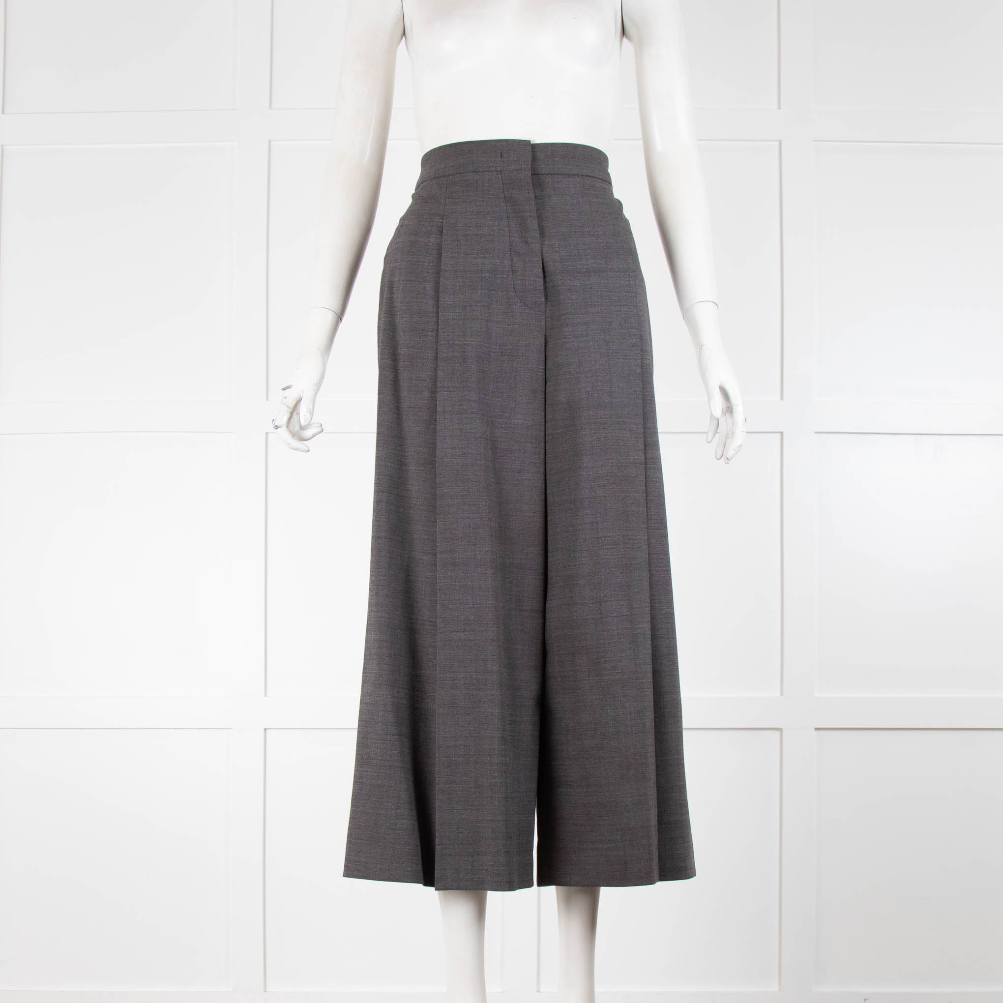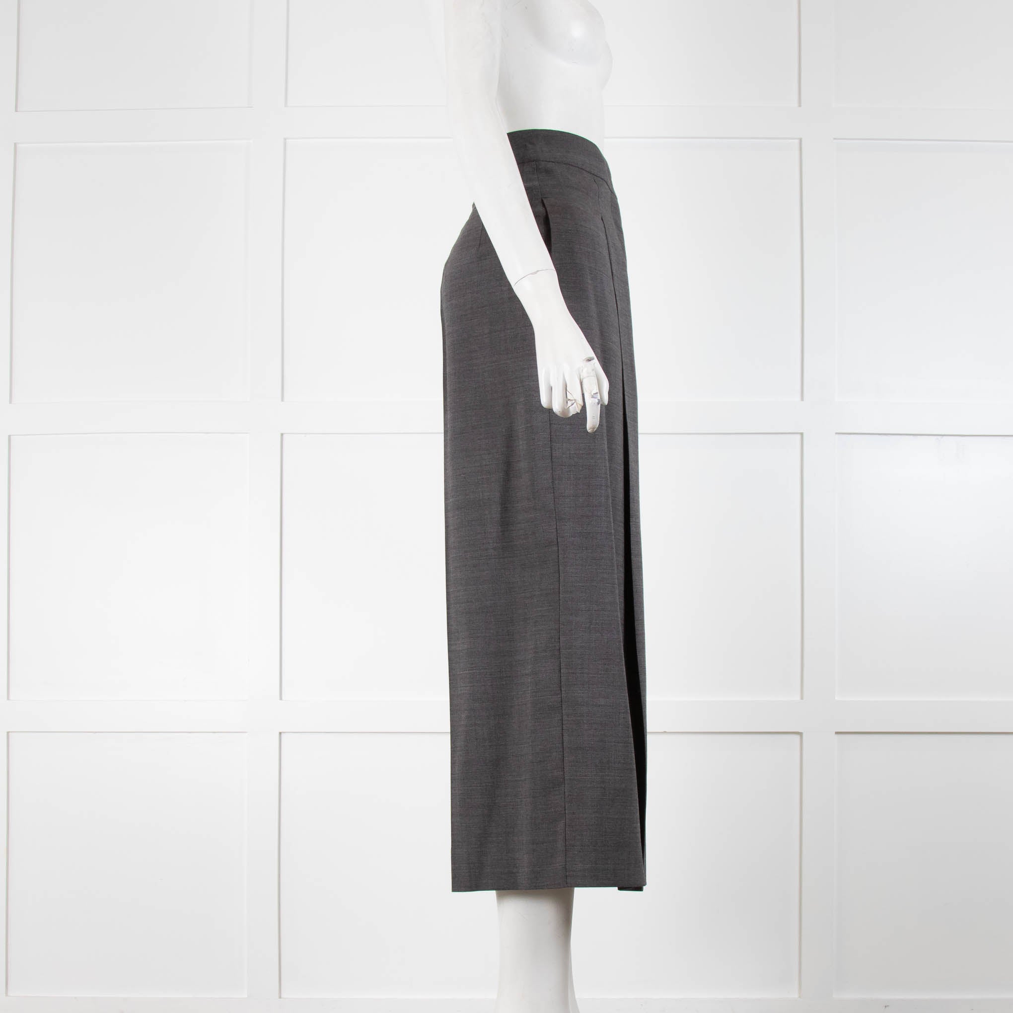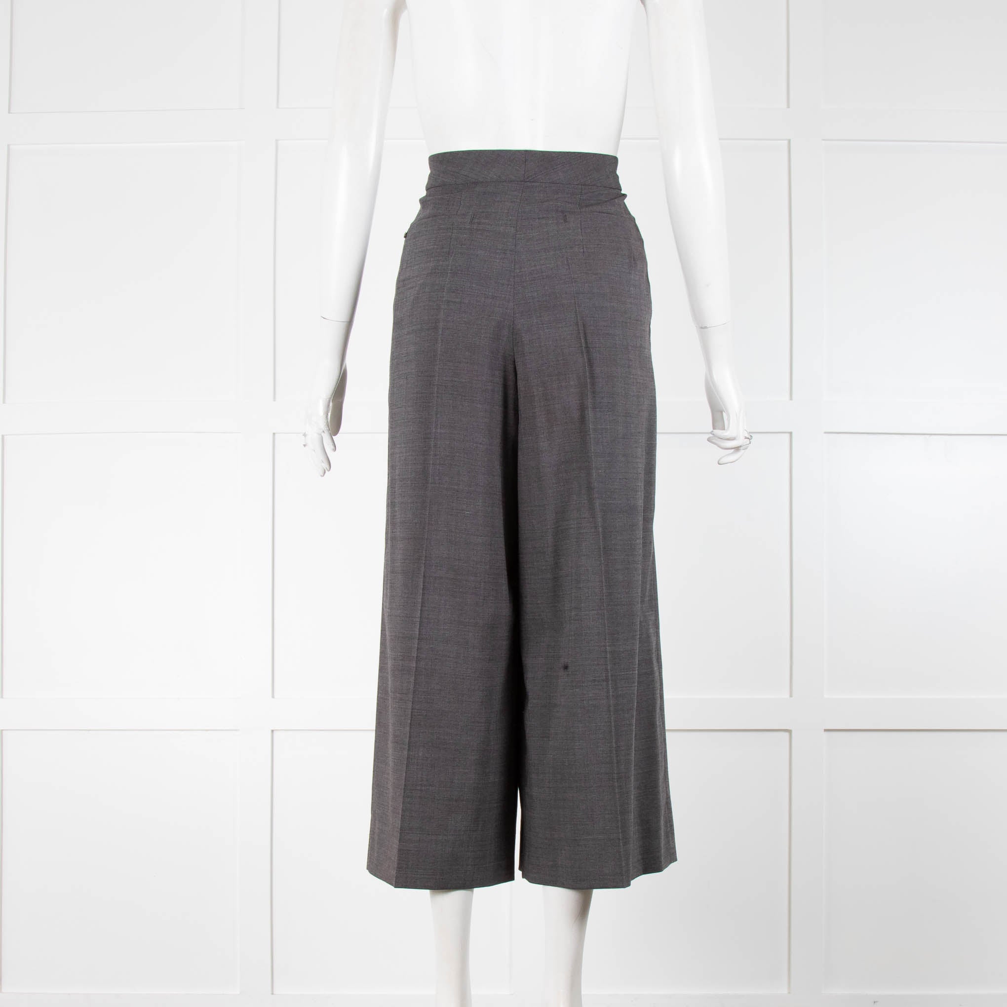 Sportmax grey culottes with concealed front zip, metal clip, and button closure. Features soft pleating on the leg and has two rear faux slip pockets.