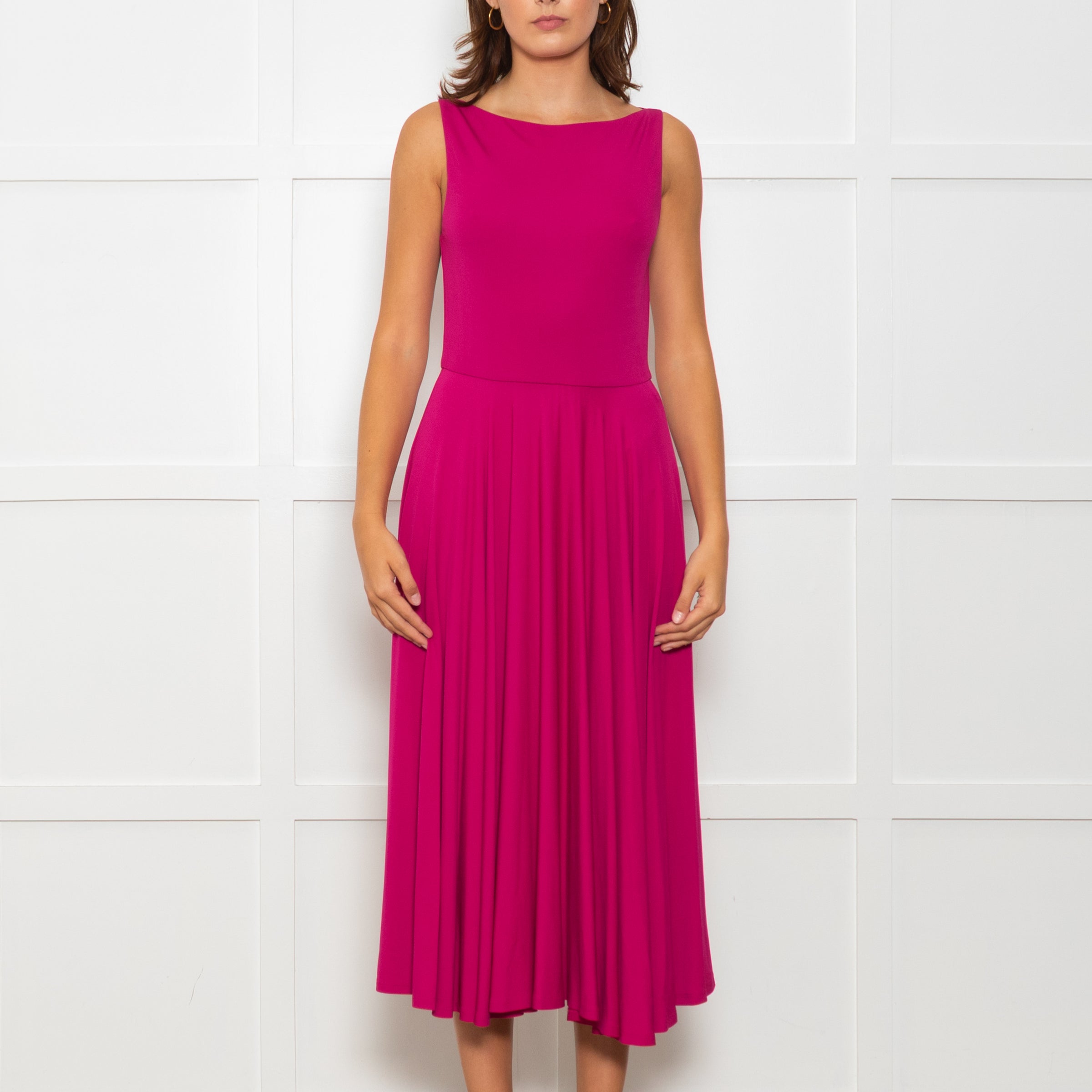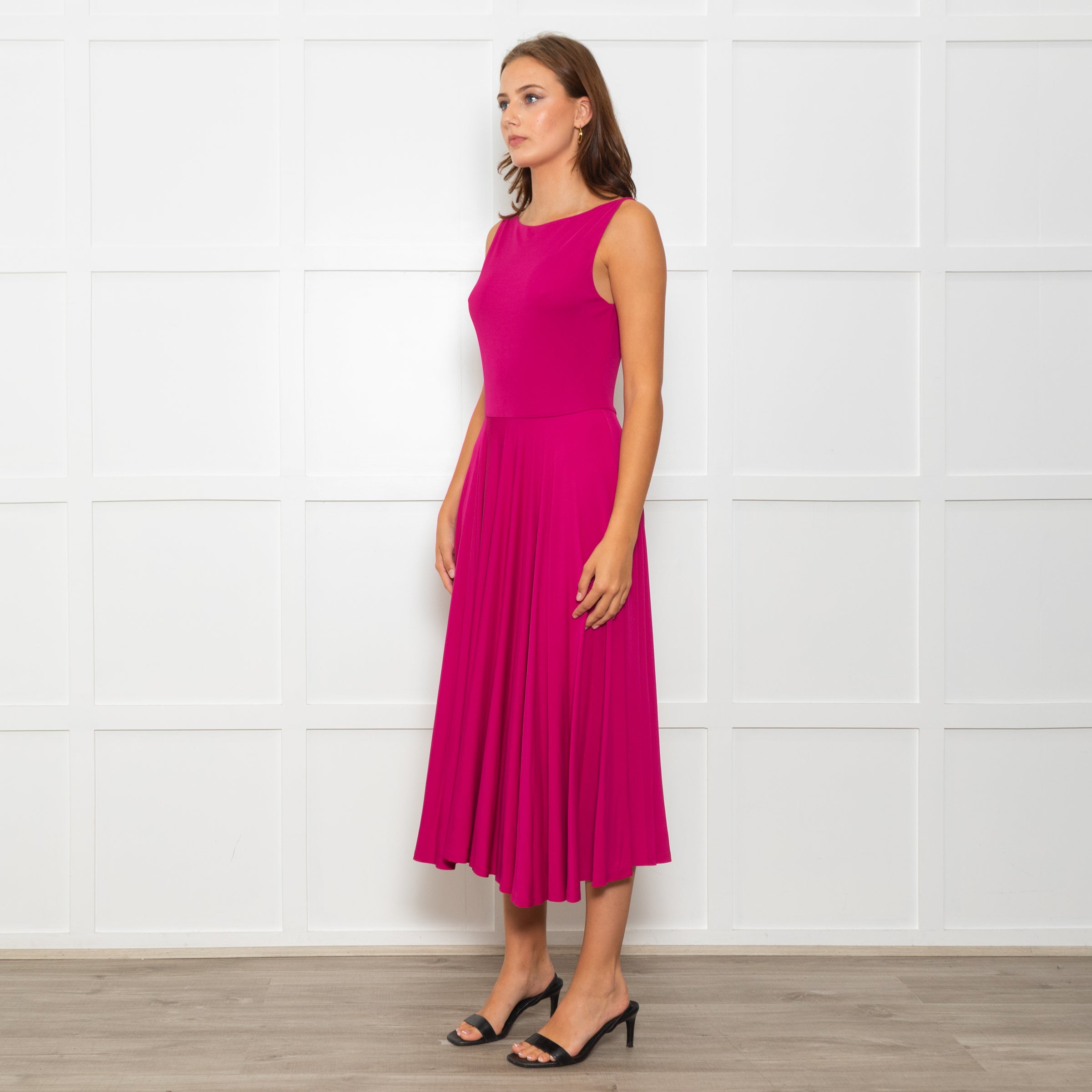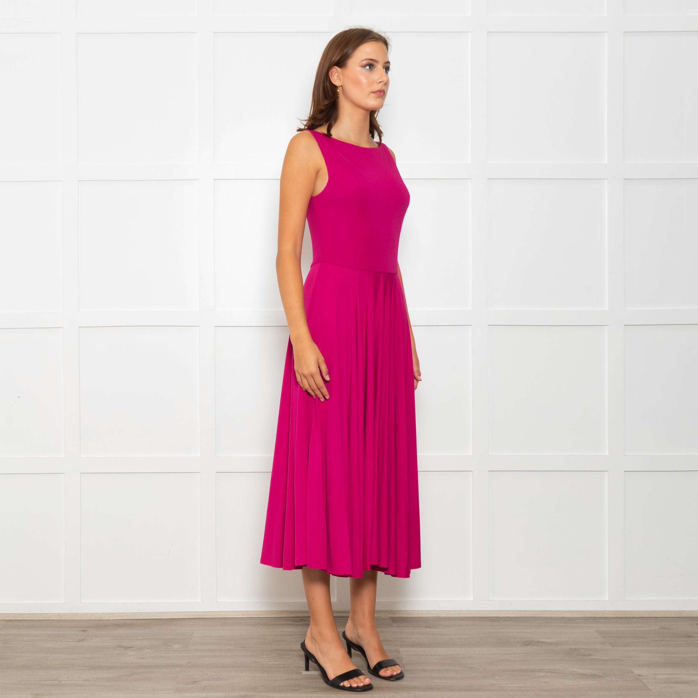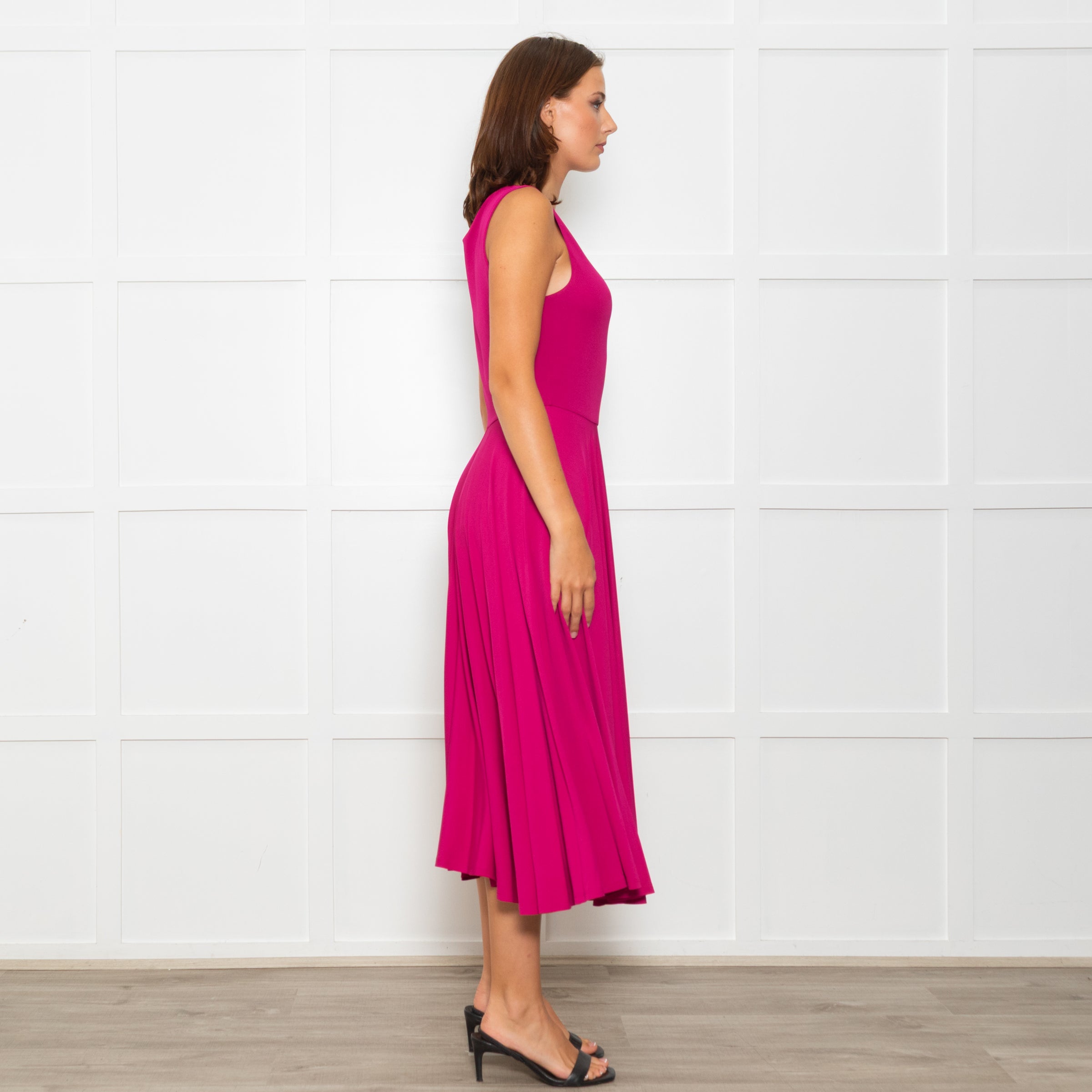 Sportmax pink stretch jersey sleeveless midi dress with a rounded neckline and pleated skirt.