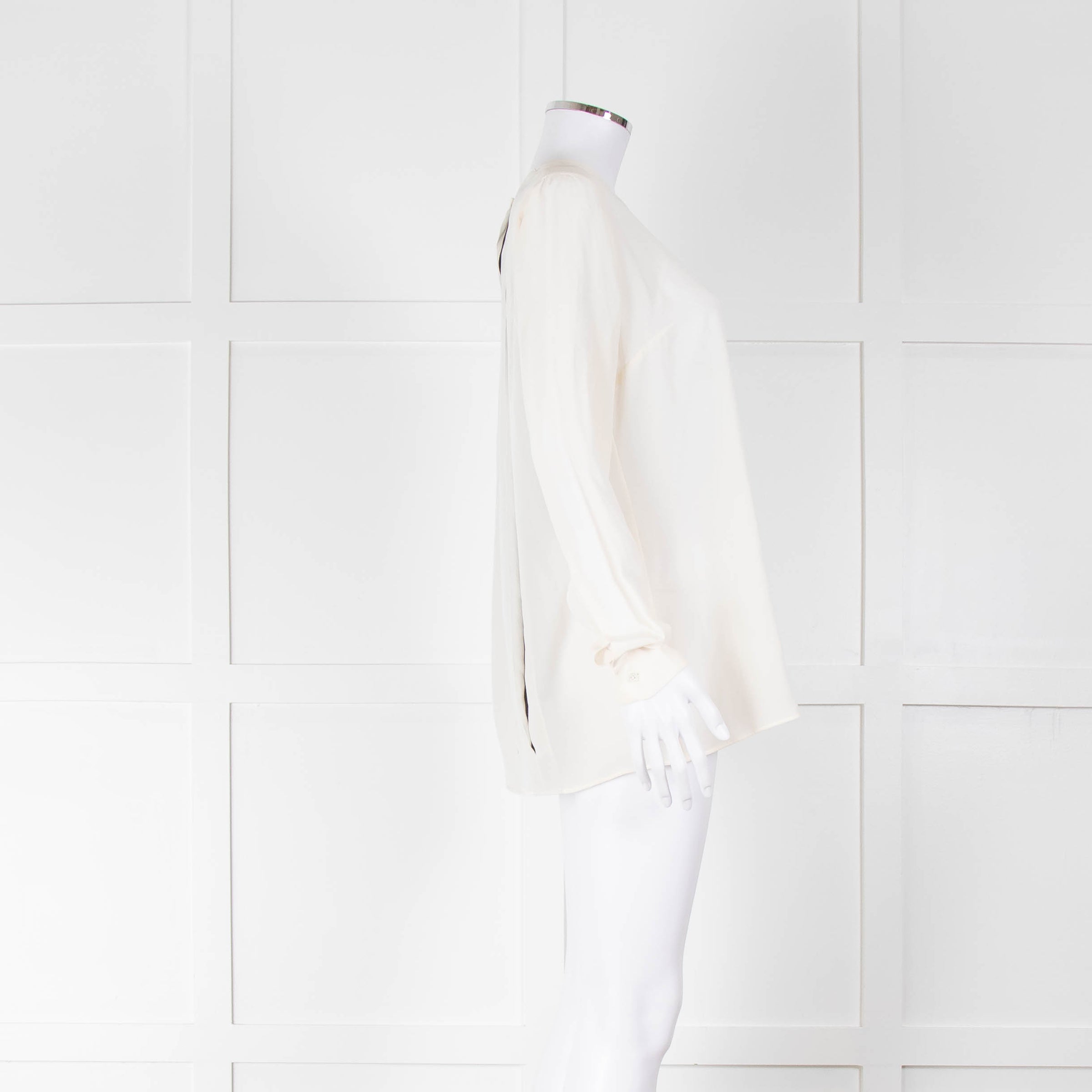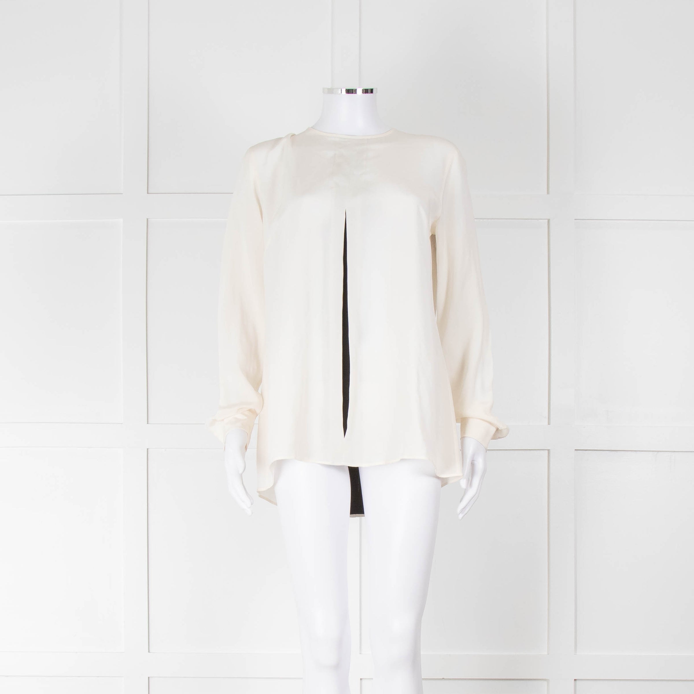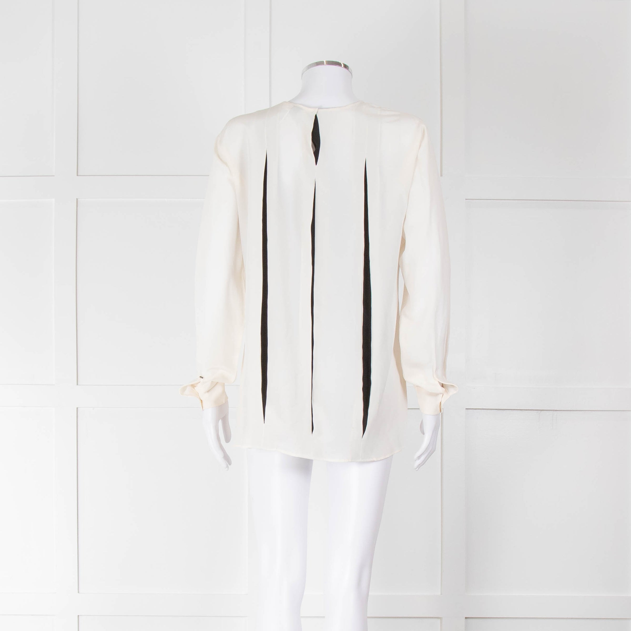 Sportsmax cream silk blouse with box pleat detailing and hidden black panels. This top has long sleeves, buttoned cuffs, a rounded neckline, and a button fastener at the back of the neck.