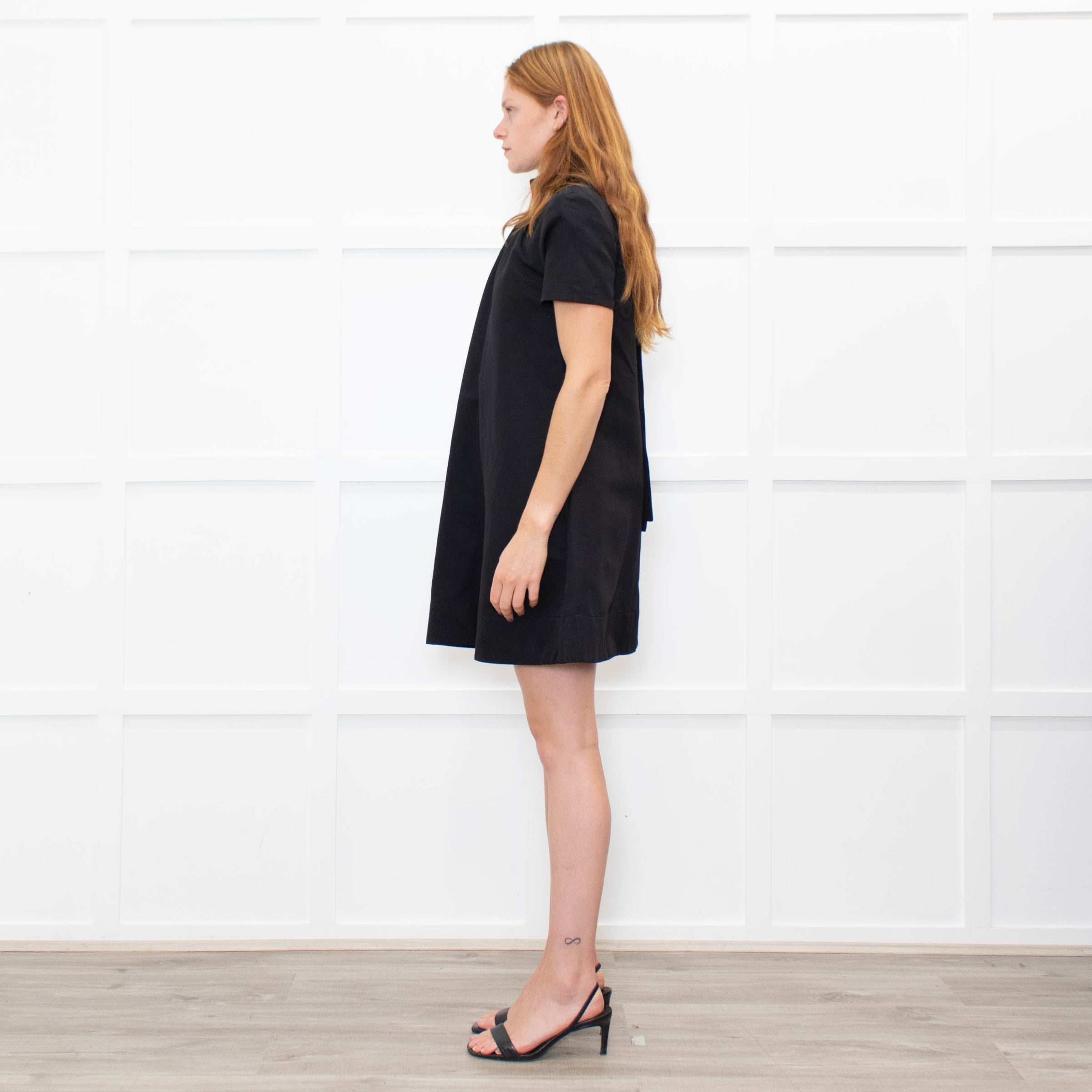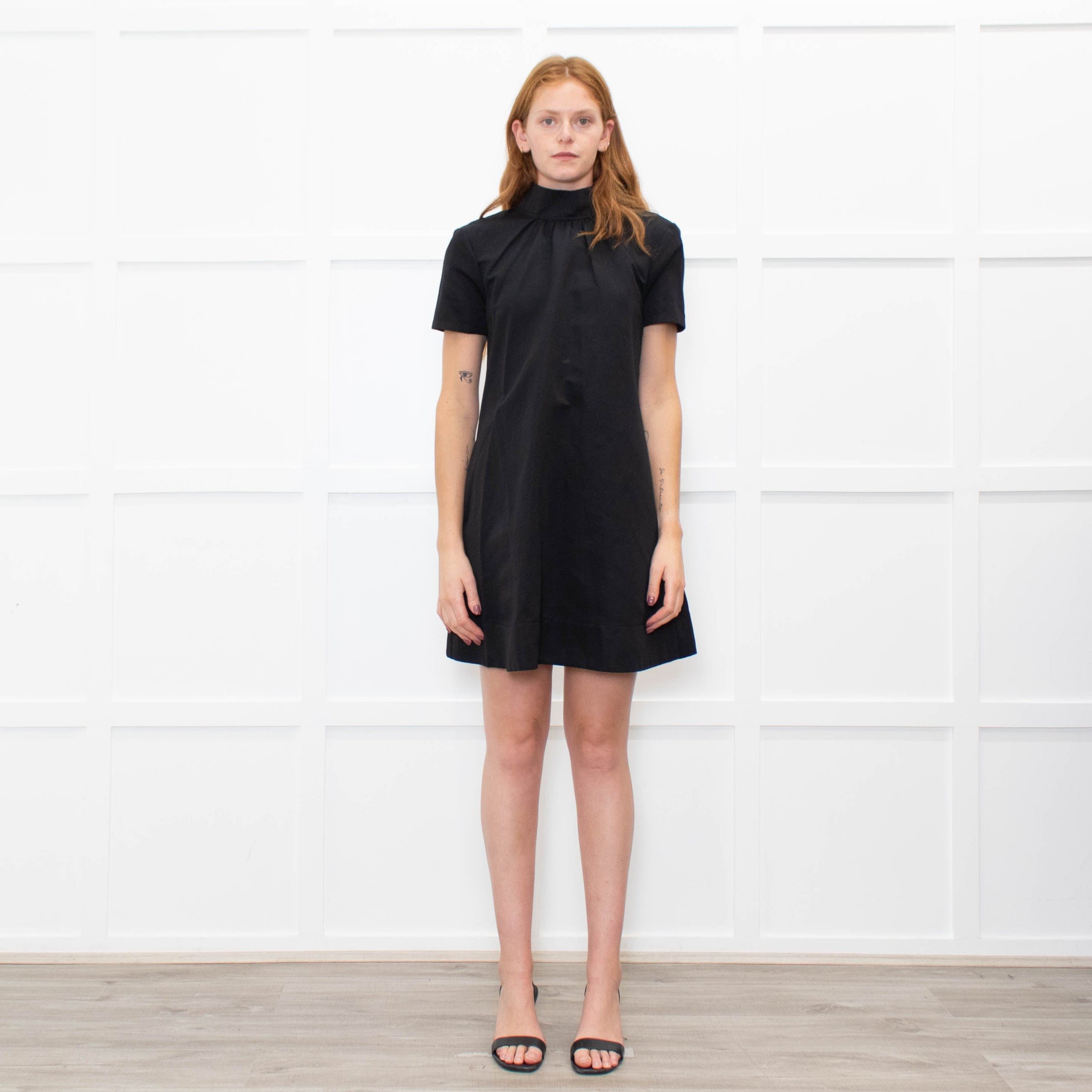 Staud black short-sleeve pleated mini dress with a high-neck, key-hole back opening, and rear neck tie. New with tags.