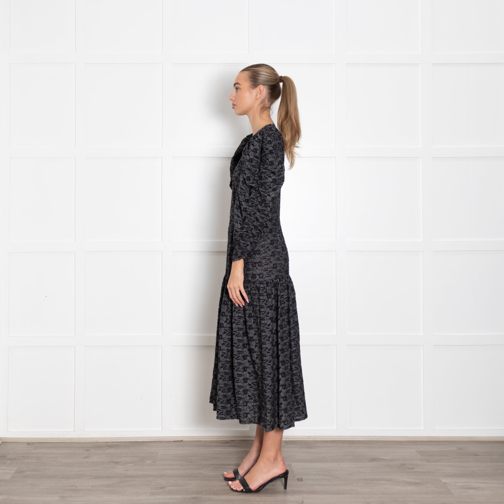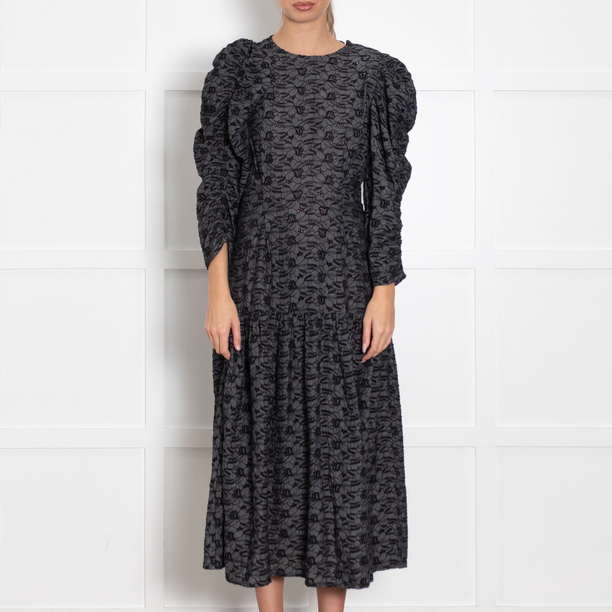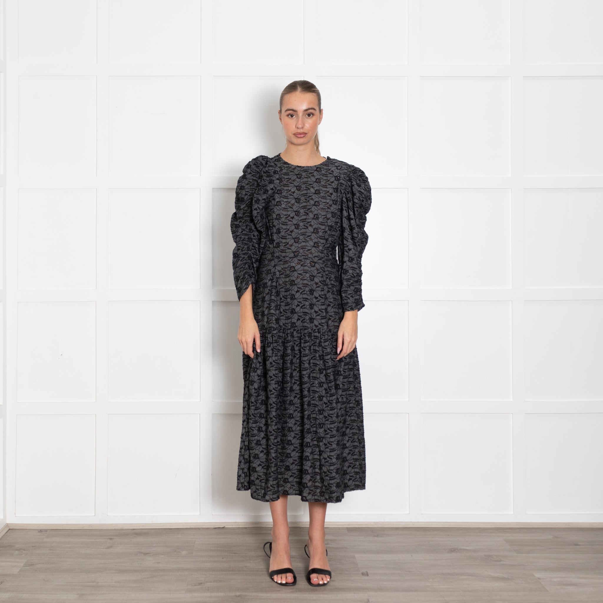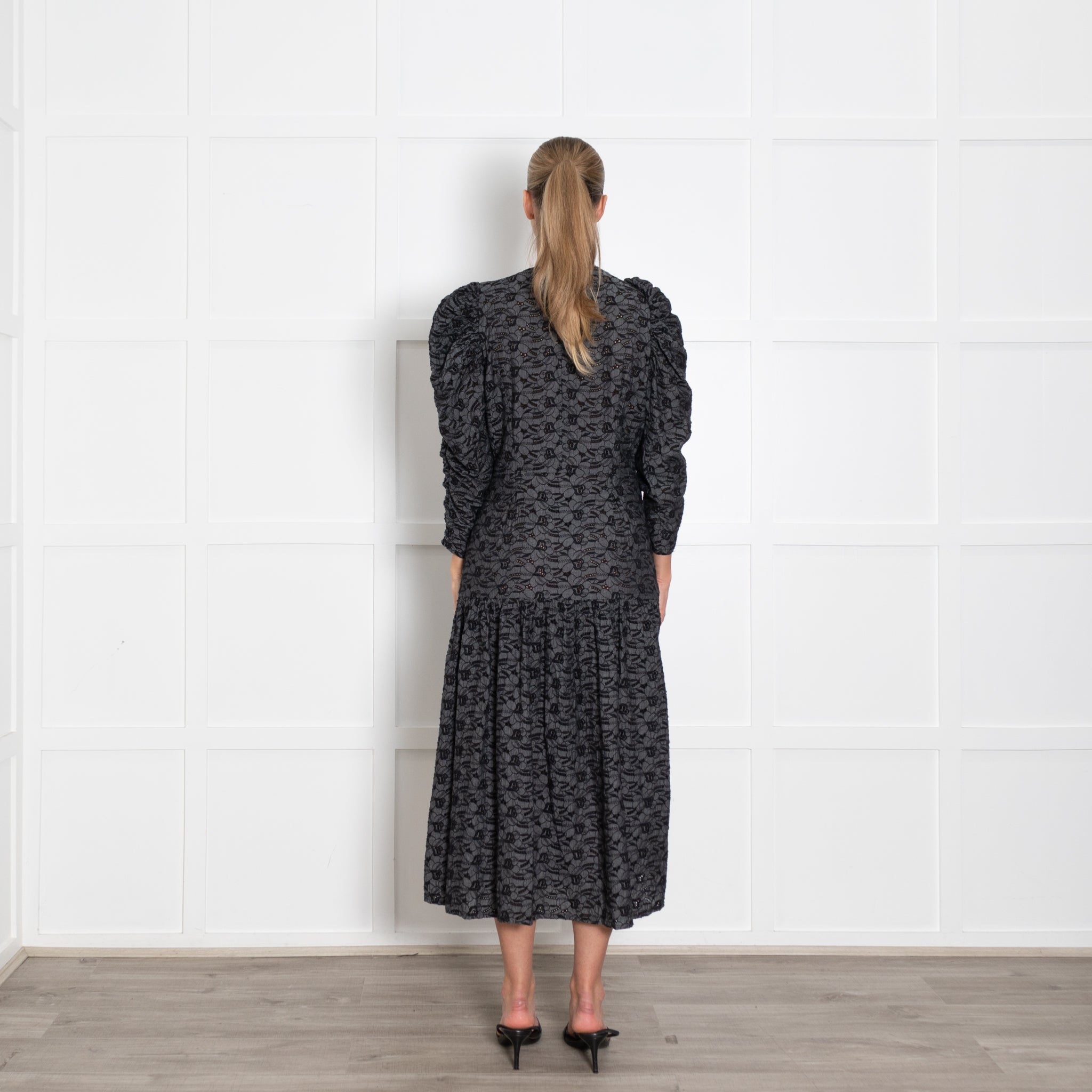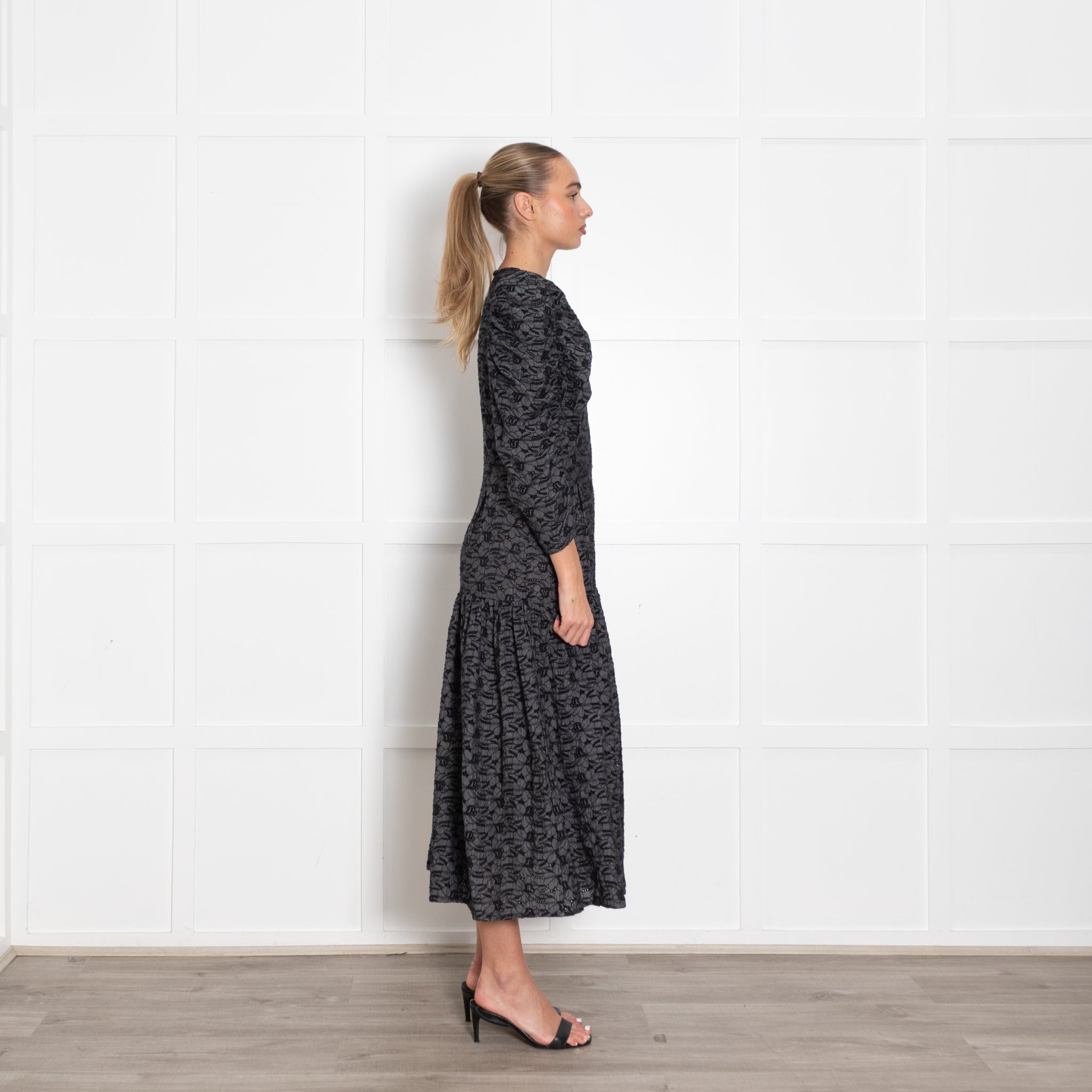 Stella Nova Blue And Black Broderie Anglais Puff Sleeve Dress