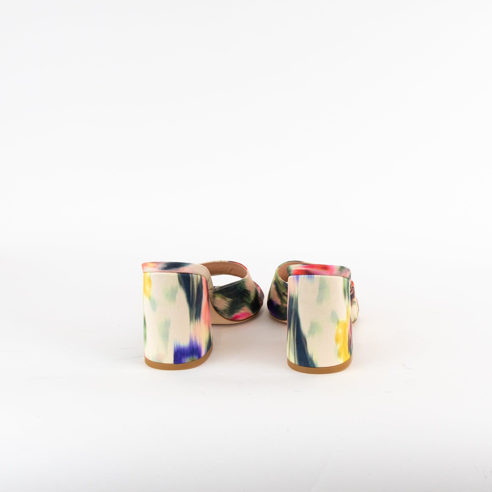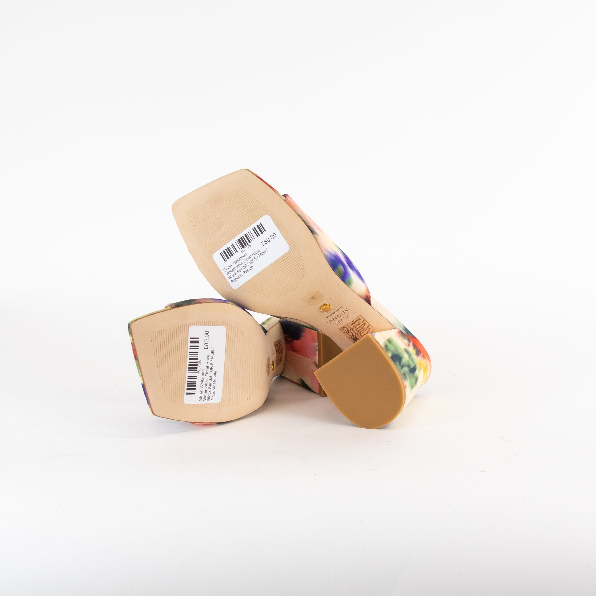 Stuart Weitzman watercolour floral haze satin block heel sandal with a square toe, single foot strap, leather soles, and branded leather footbeds. New with tags, accompanied by the original dust bag and box.