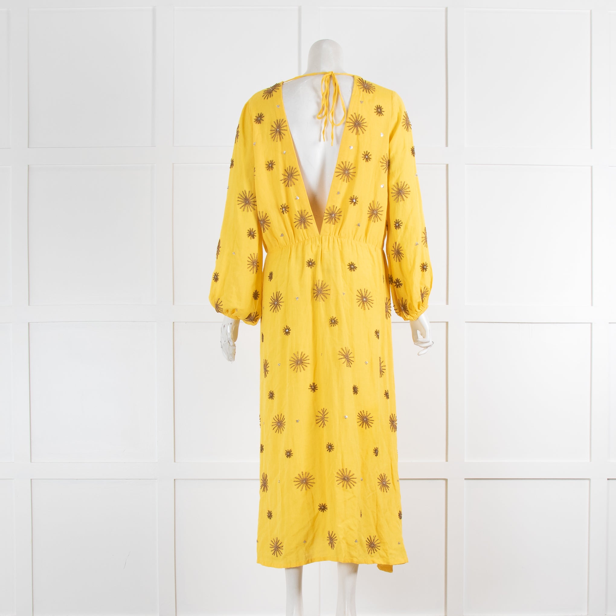 Sundress yellow 'Chicago' long-sleeve linen maxi dress with a copper beaded sunburst motif, deep V neckline front and back, long sleeves gathered into elasticated wrists, a lightly gathered skirt, and self-tie strings across the shoulder. New with tags.