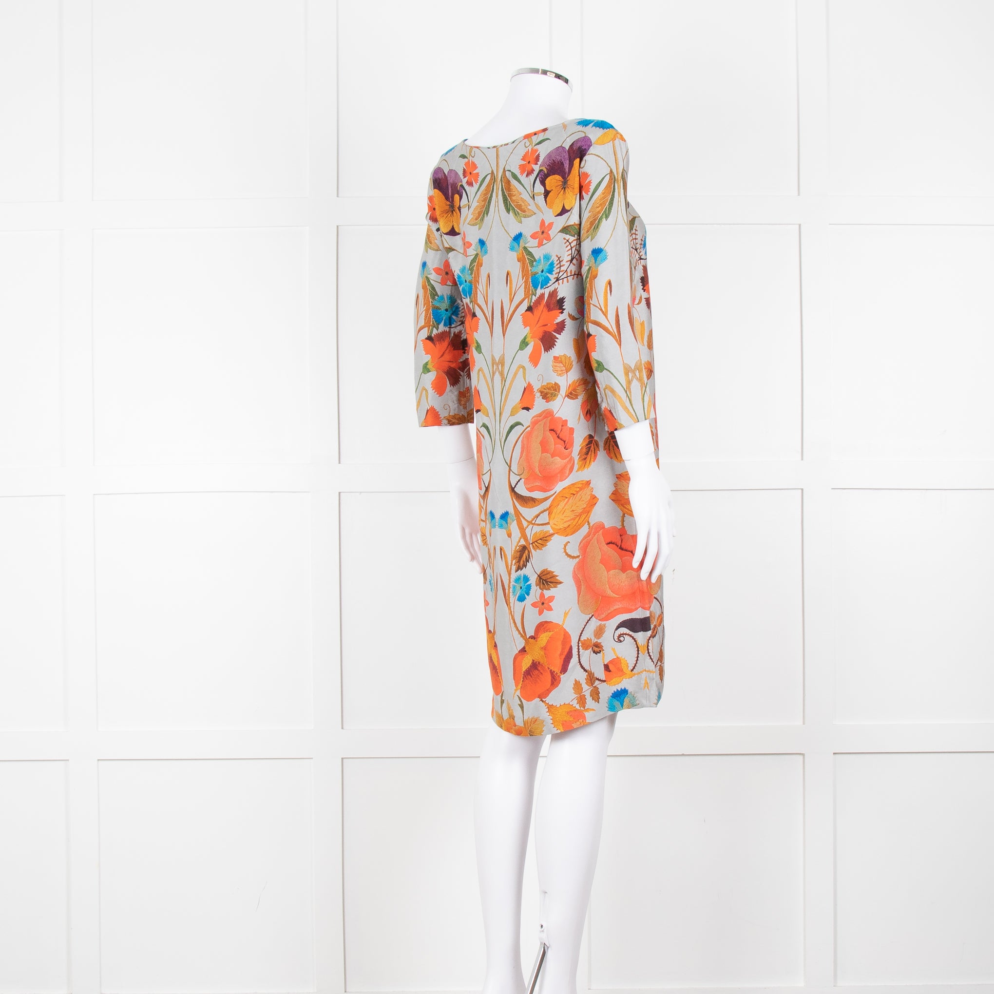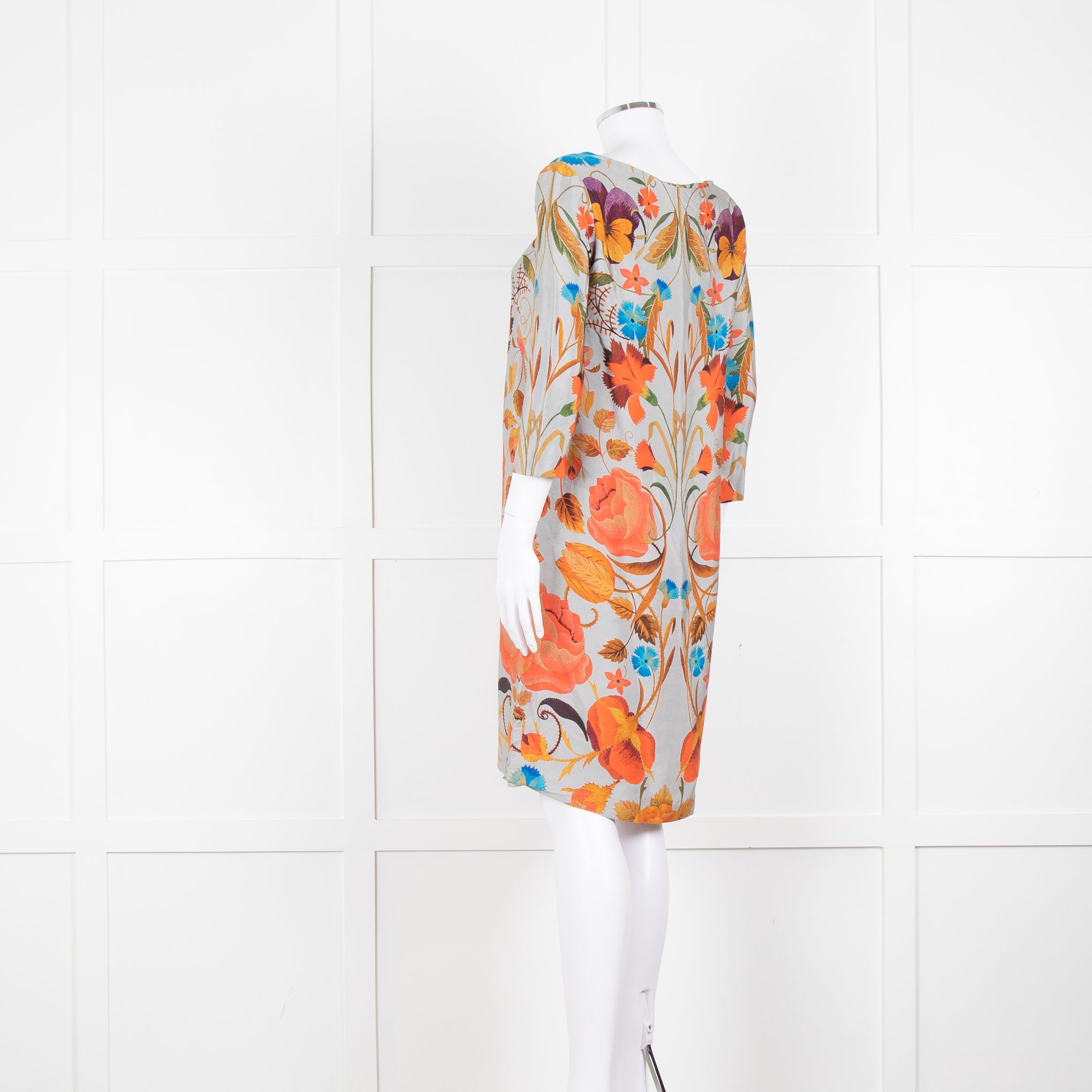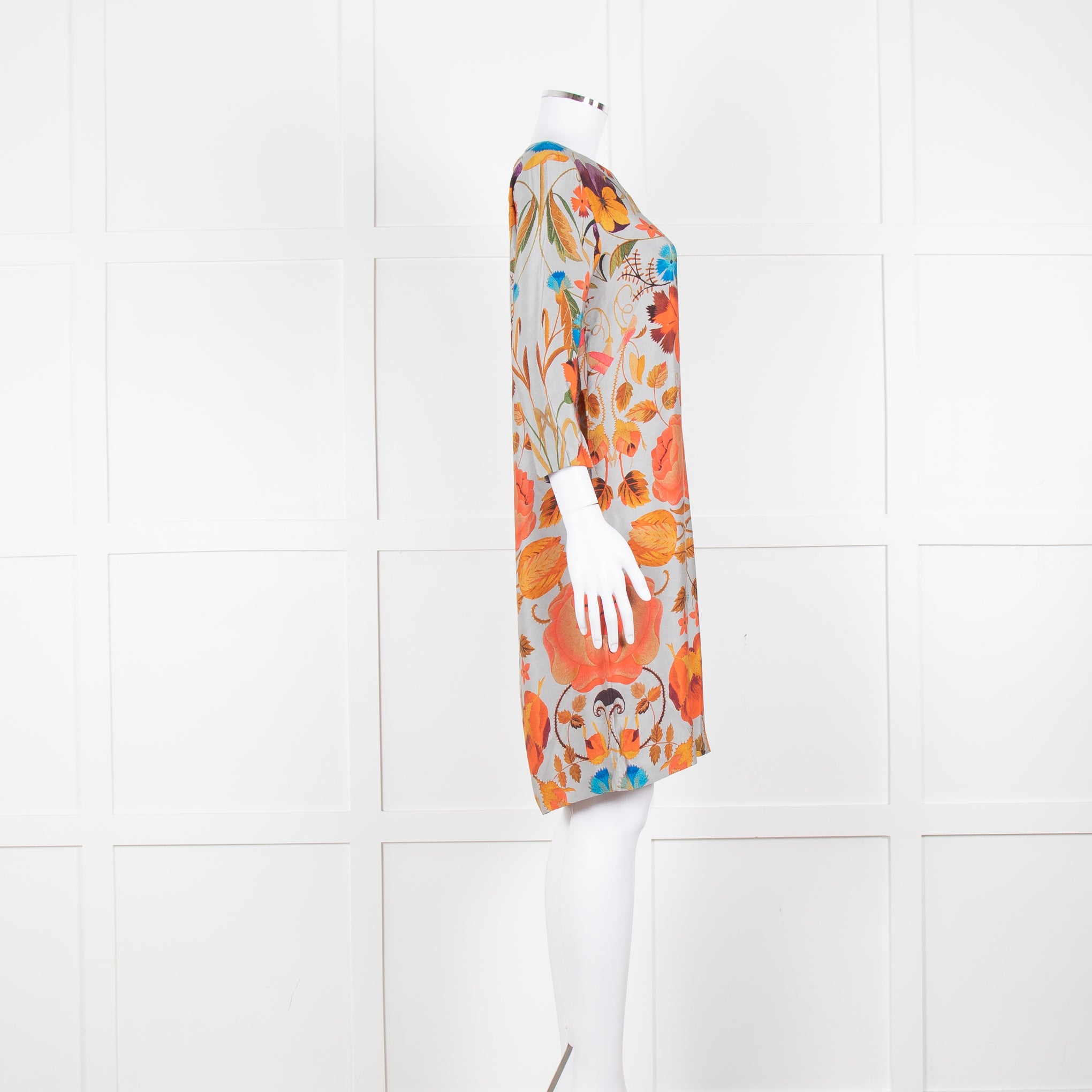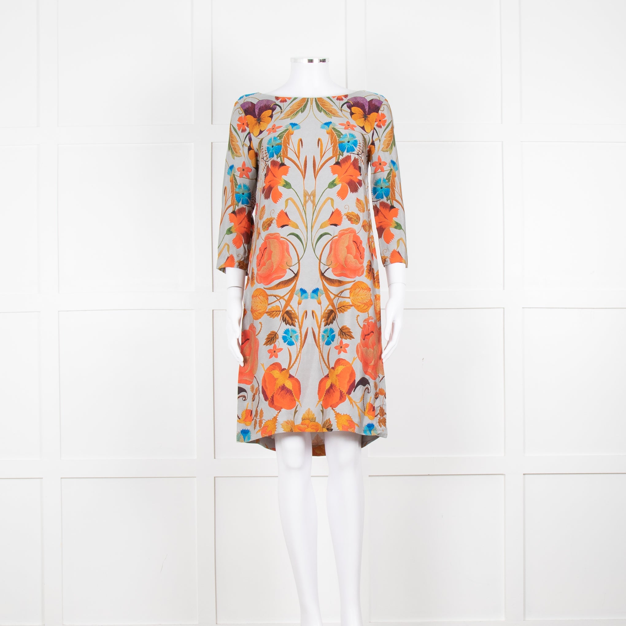 Temperley grey and orange floral silk tunic dress with a rounded neckline and 3/4 length sleeves.