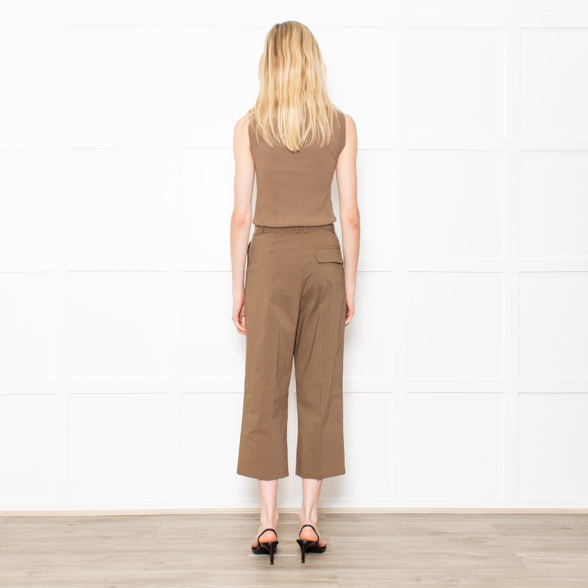 The Editor's Market khaki green pleated trousers with belt loops, a cropped leg, side slip pockets, a concealed zip fly, and a single rear flap pocket. The accompanying knitted vest is available separately. New with tags.