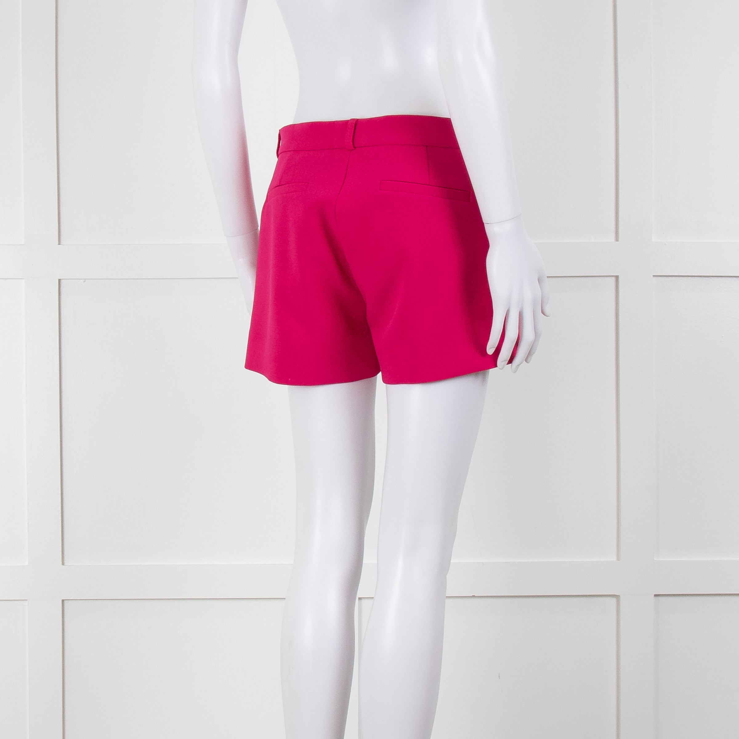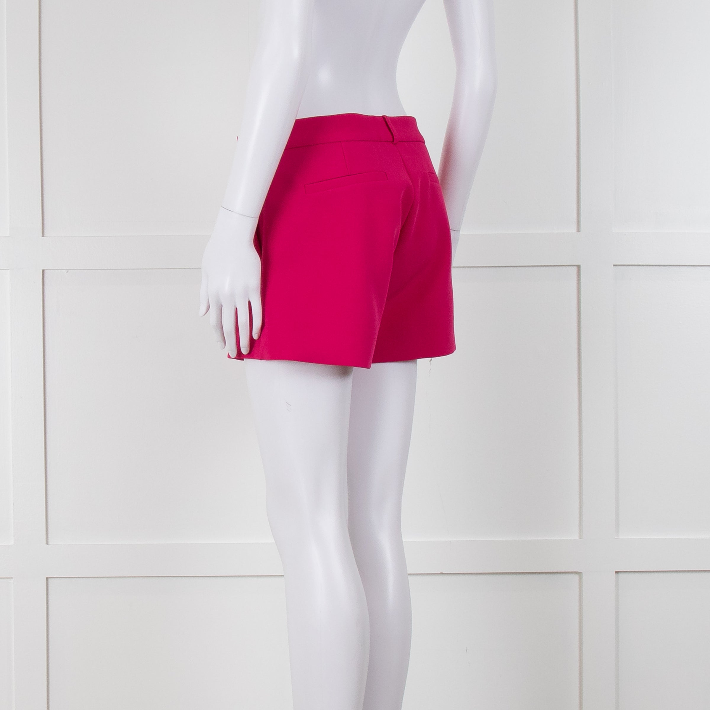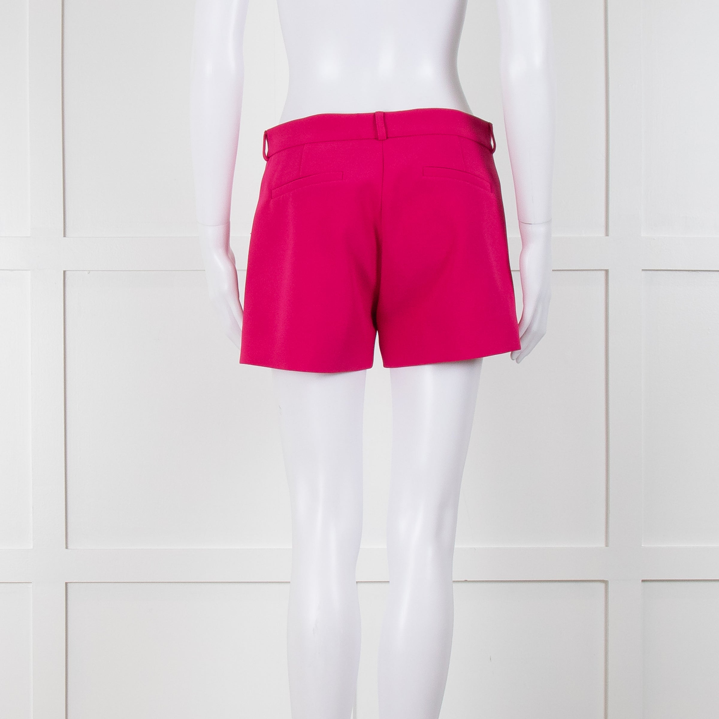 The Kooples bright pink shorts with concealed front zip and metal clip closure, belt loops, two side slip pockets, and two rear slip pockets.