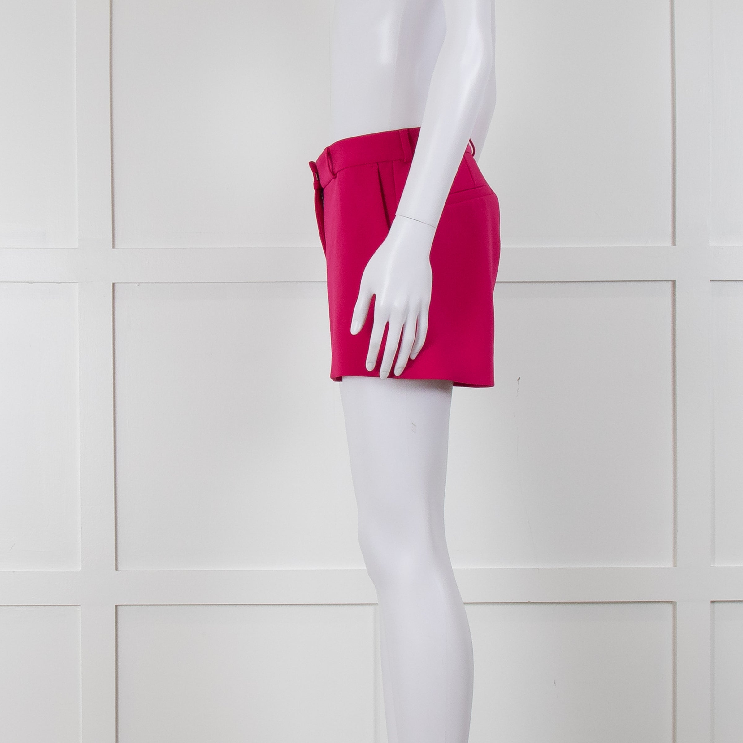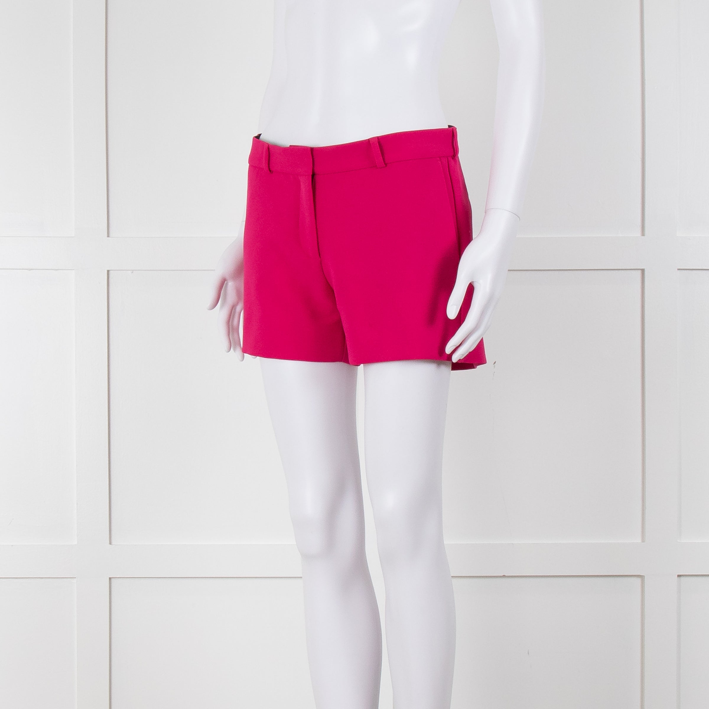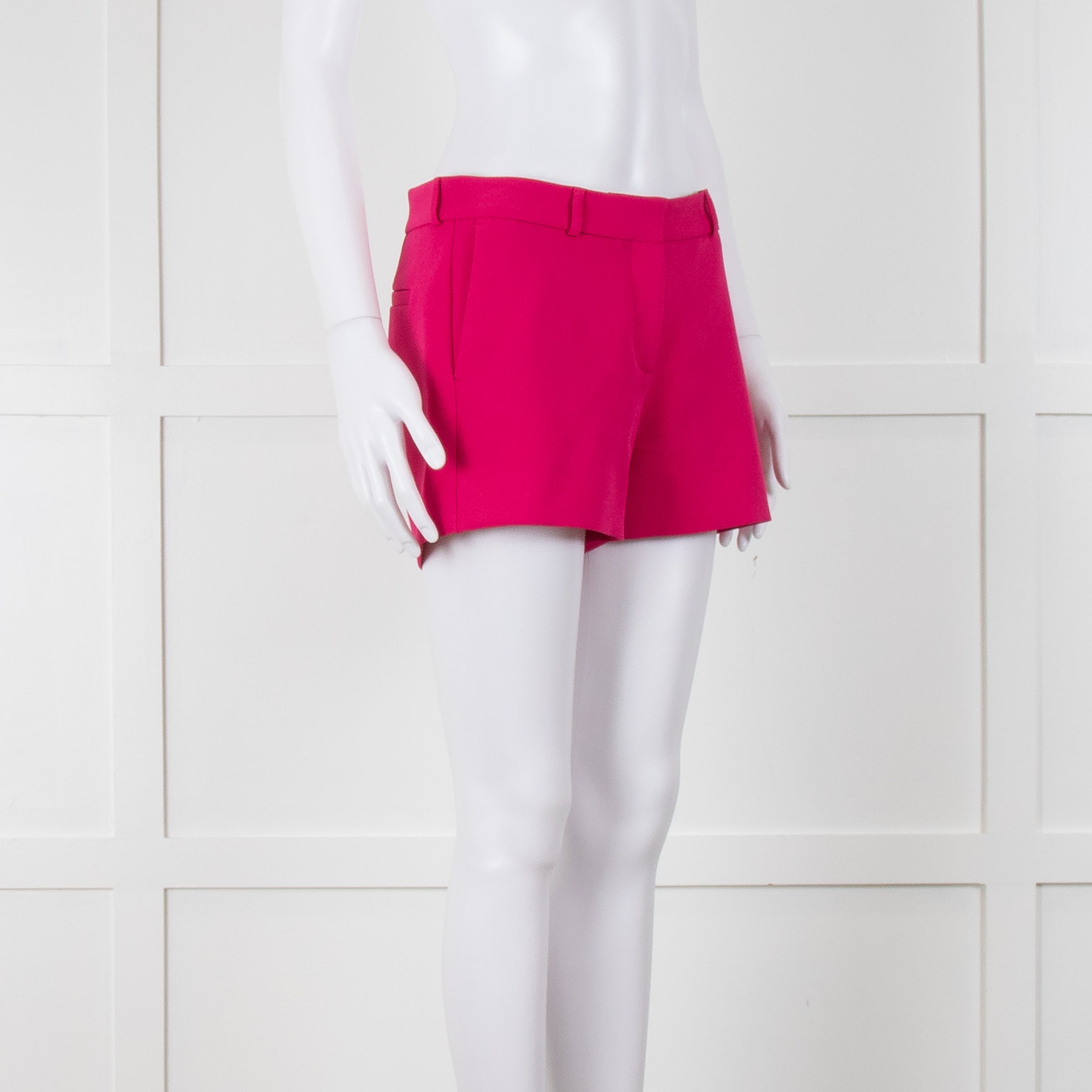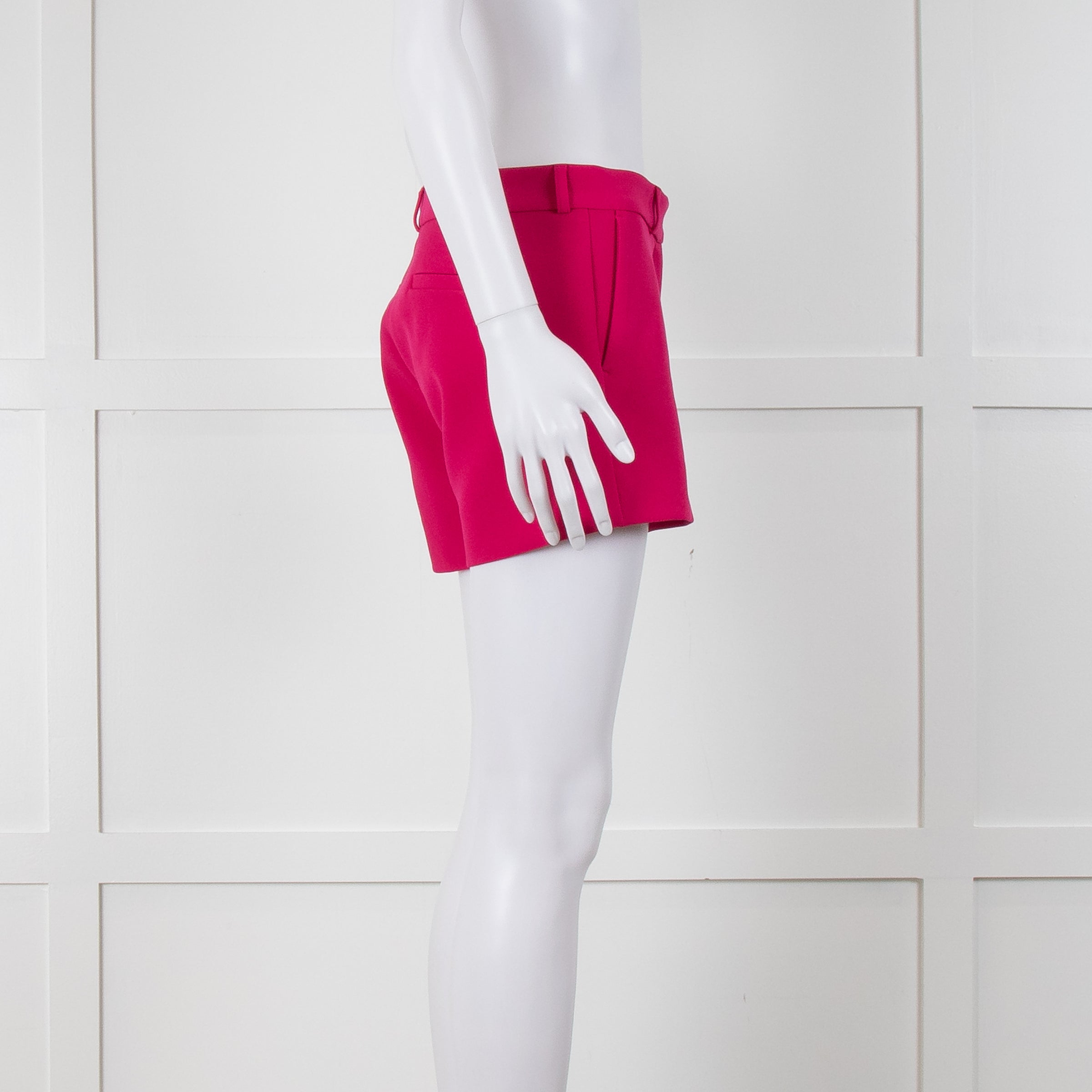 The Kooples bright pink shorts with concealed front zip and metal clip closure, belt loops, two side slip pockets, and two rear slip pockets.