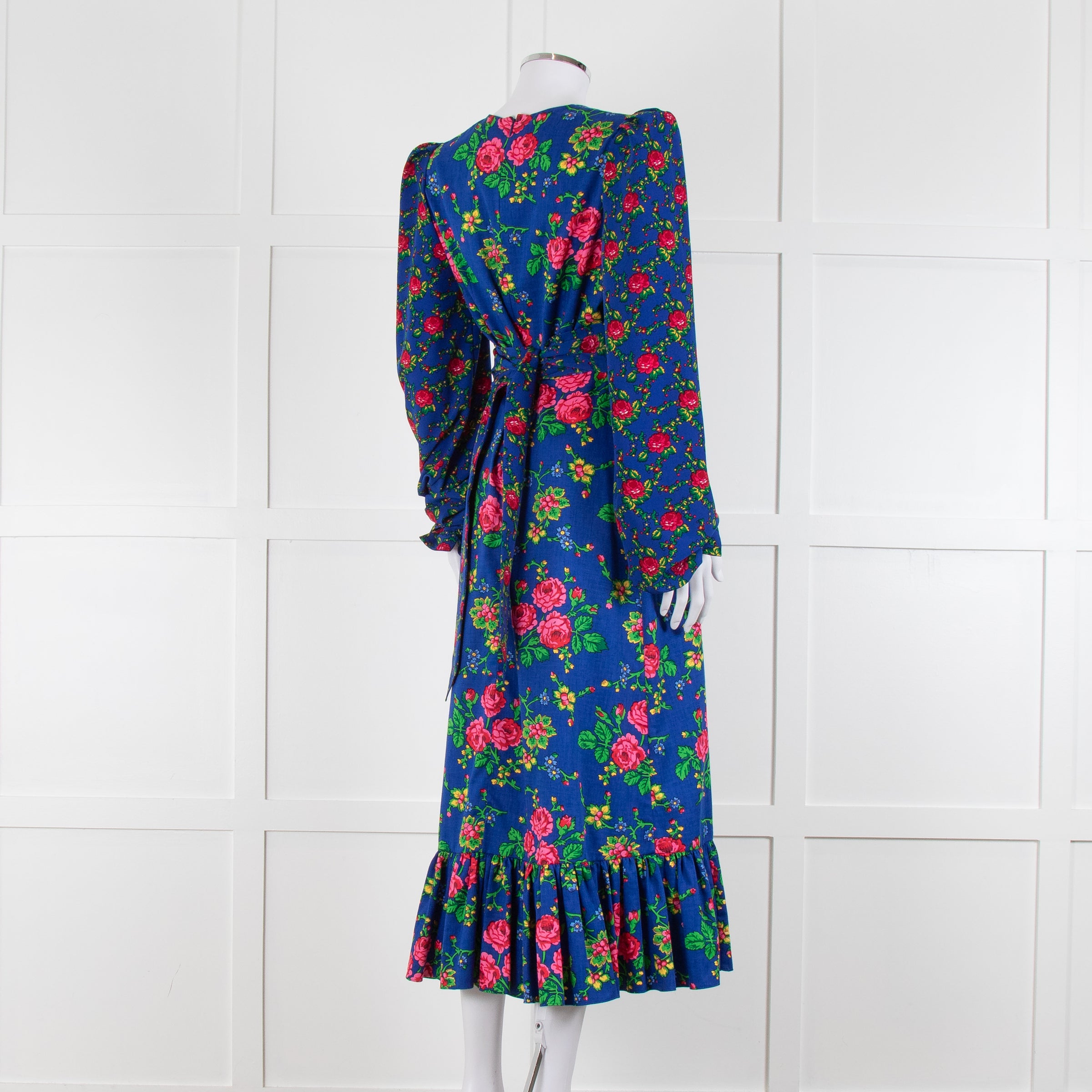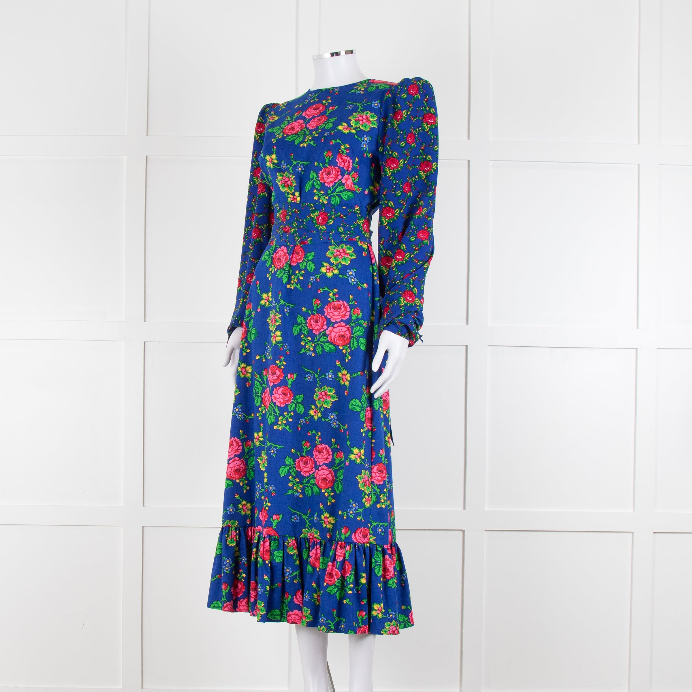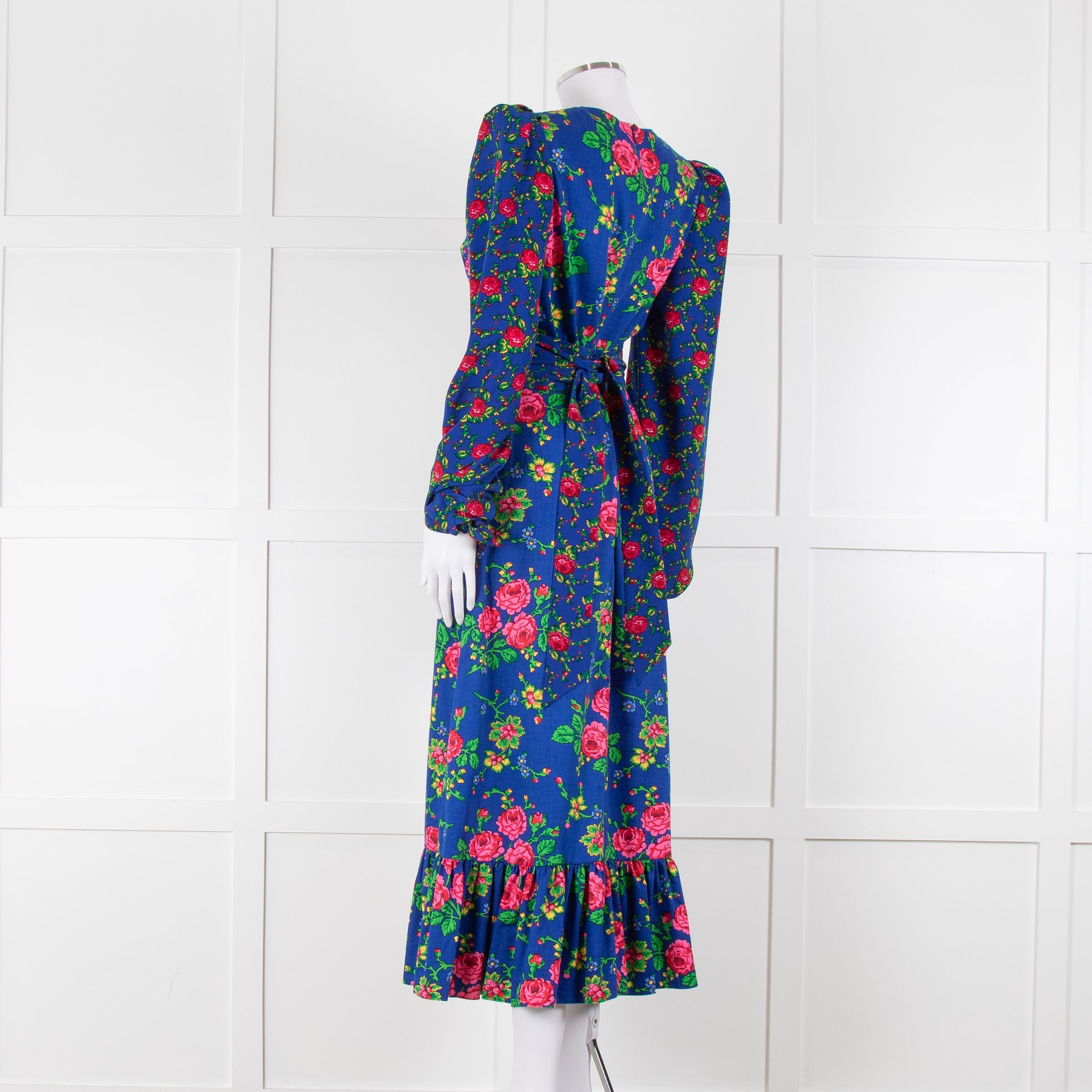 The Vampire's Wife hero 'Villanelle' dress in a gypsy blue floral rose print with a rounded neckline, a hand-tied half belt, and a deep gathered frill around the hem. This dress features long sleeves in a contrast fluid crepe fabric with puffed shoulders, and gathering into buttoned cuffs. New with tags RRP £750.