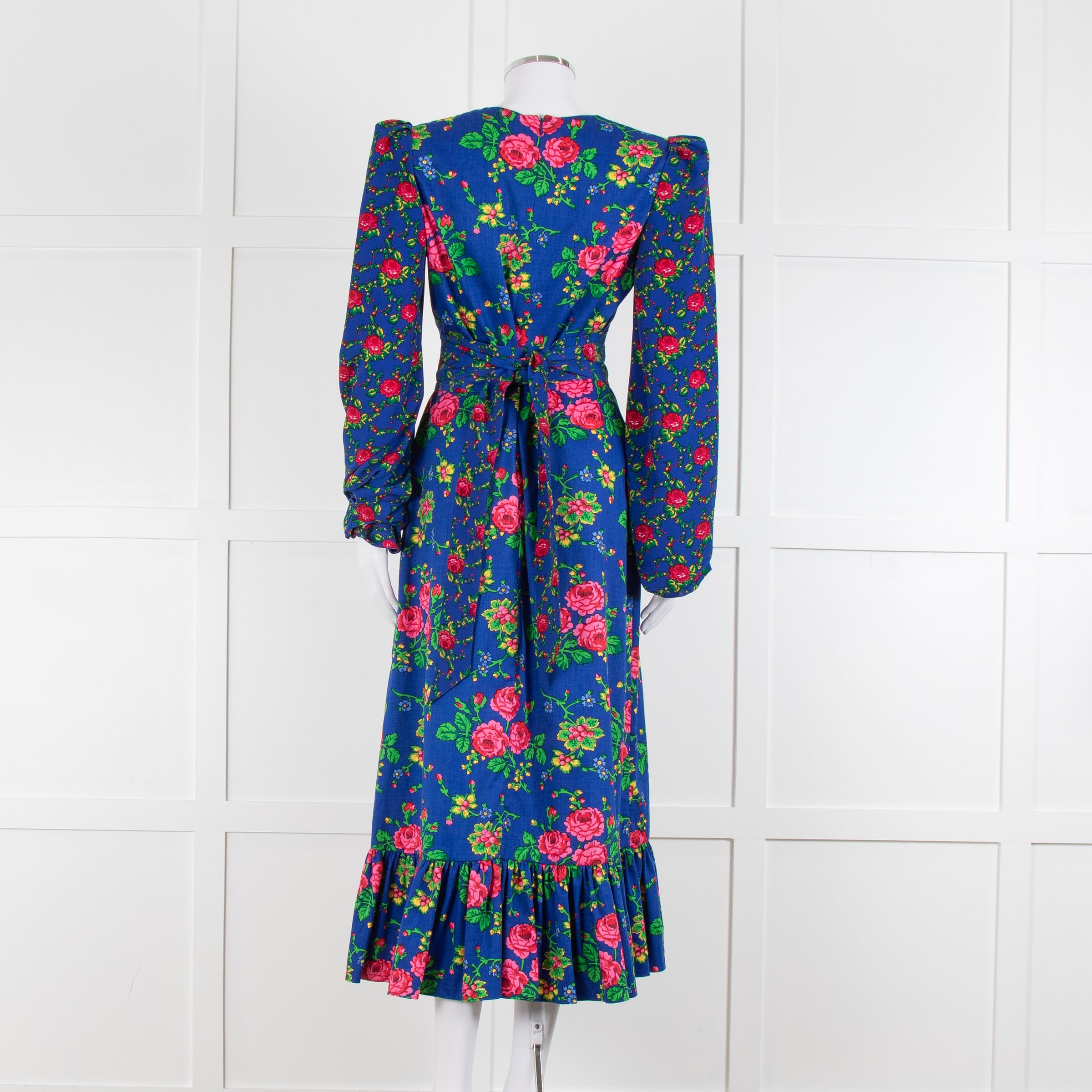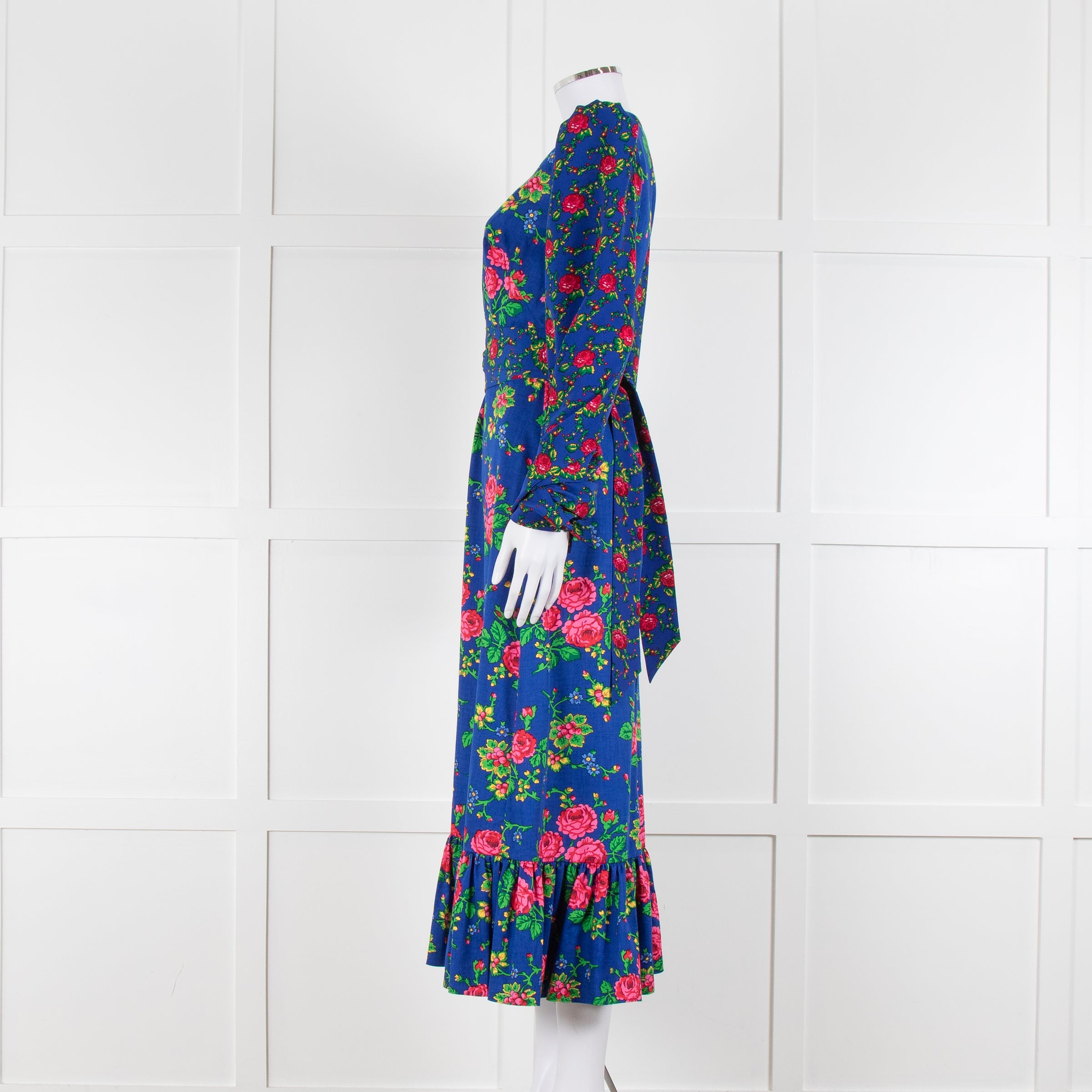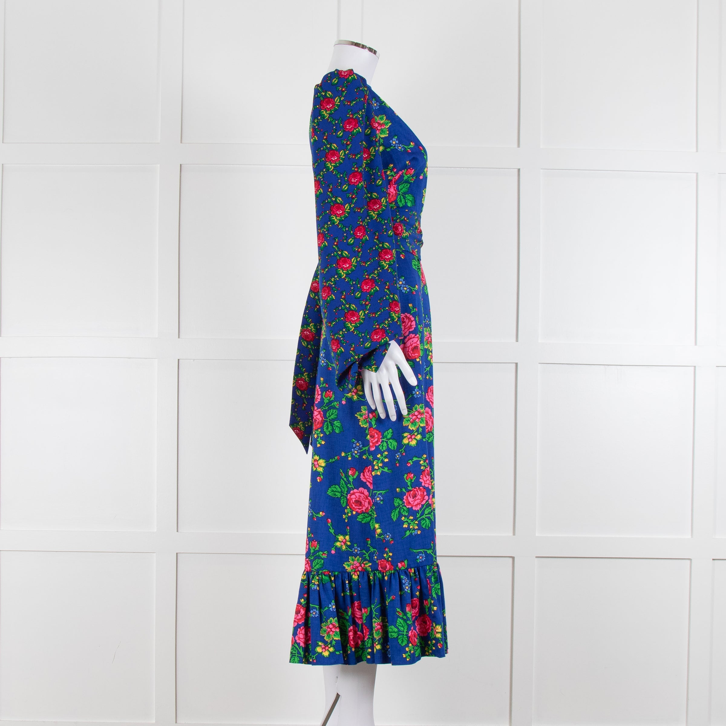 The Vampire's Wife hero 'Villanelle' dress in a gypsy blue floral rose print with a rounded neckline, a hand-tied half belt, and a deep gathered frill around the hem. This dress features long sleeves in a contrast fluid crepe fabric with puffed shoulders, and gathering into buttoned cuffs. New with tags RRP £750.