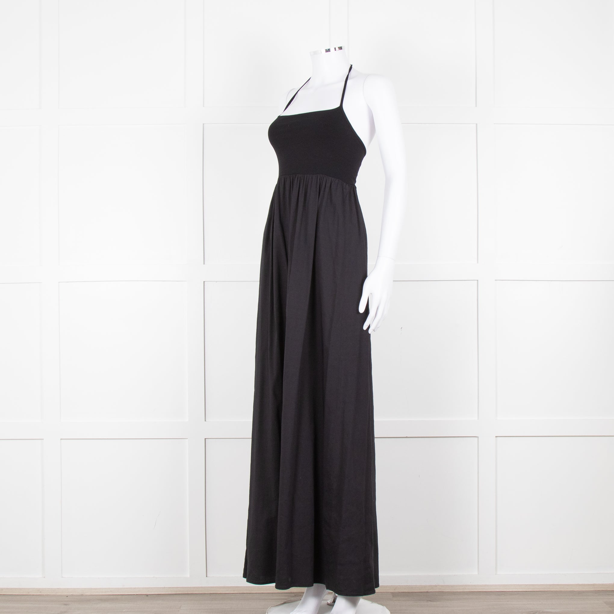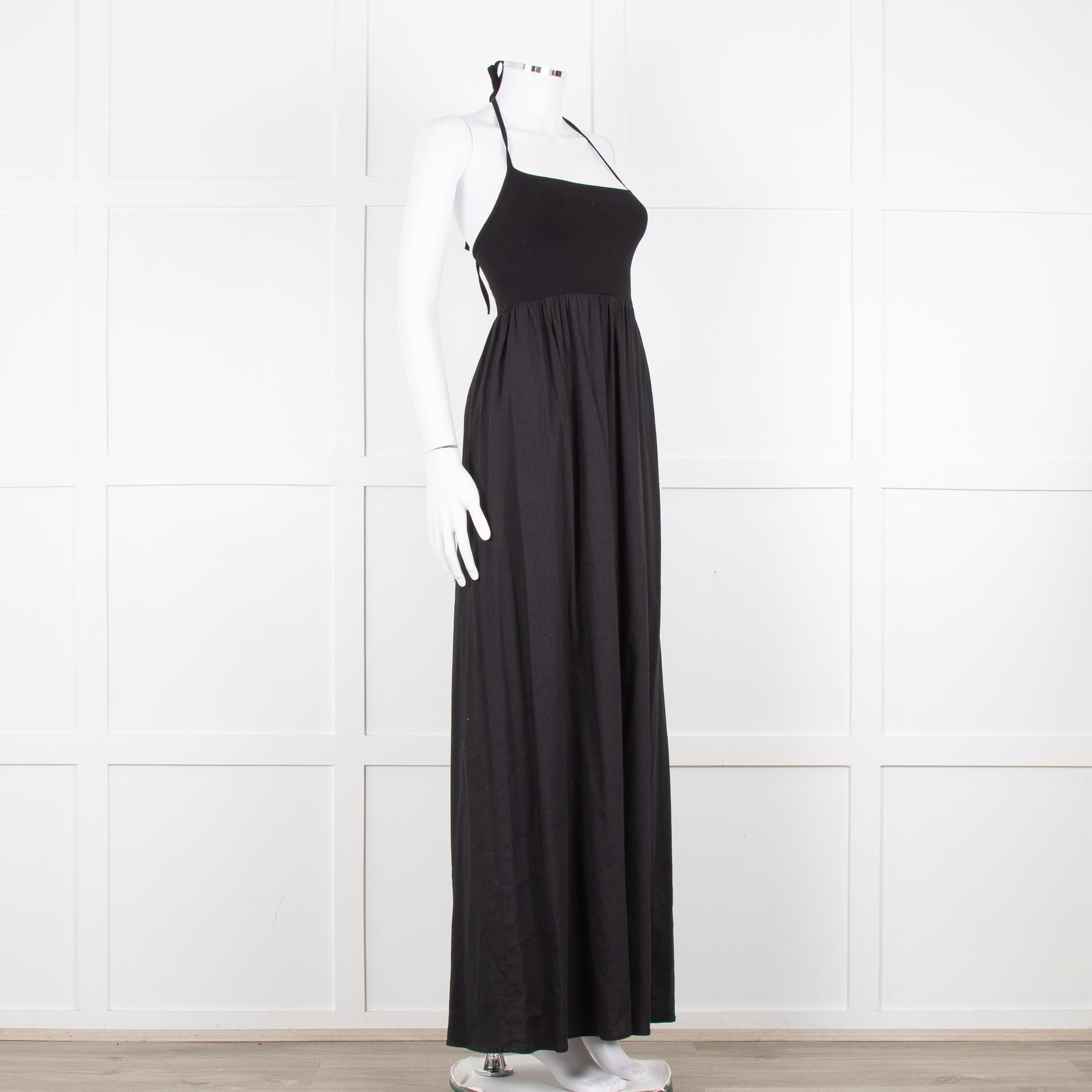 Theory black halter-neck maxi dress with a straight neckline and pleated skirt.