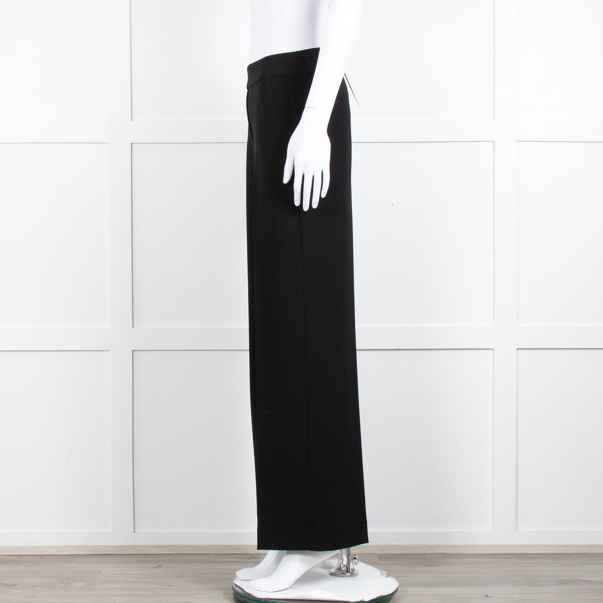 Theory black crepe straight leg trousers with an elasticated waistband, faux side pockets, and a faux fly front.