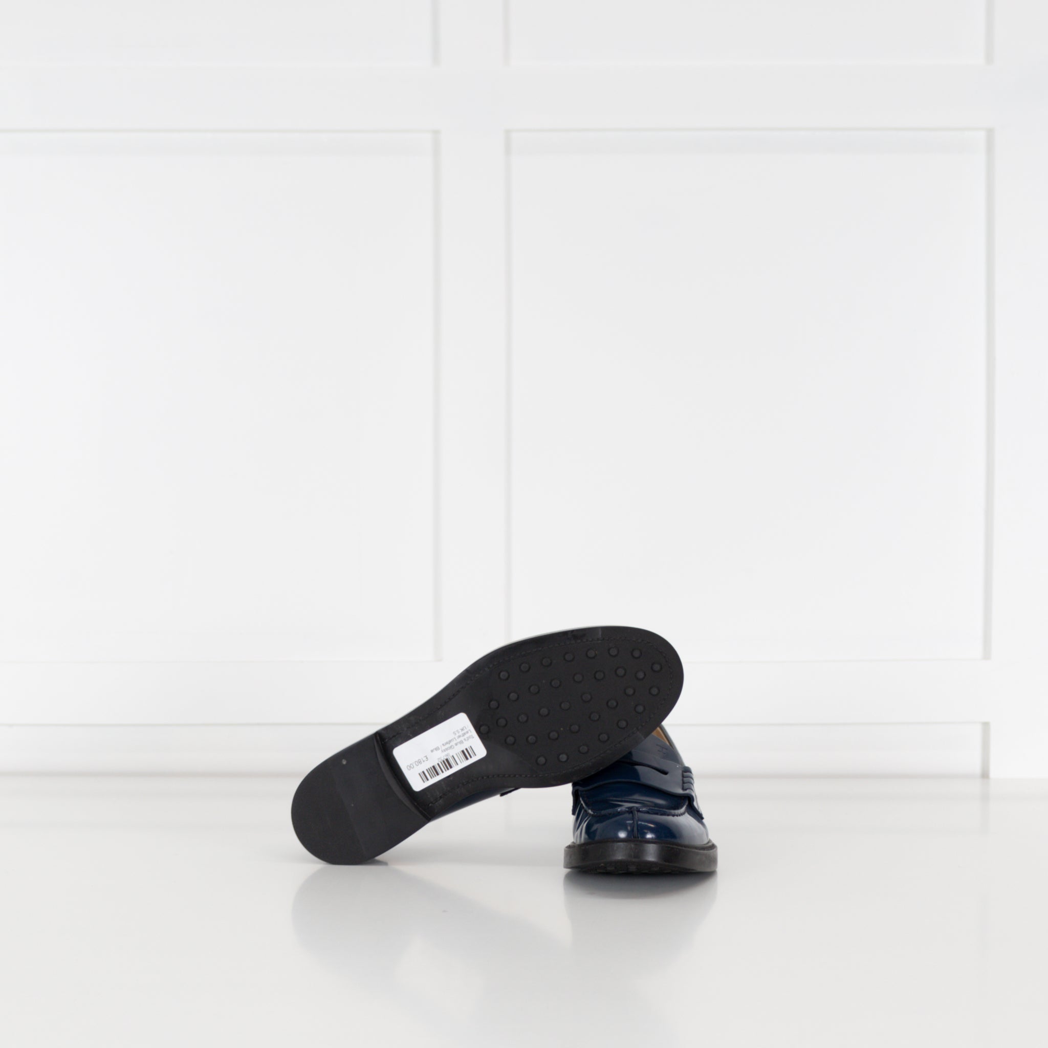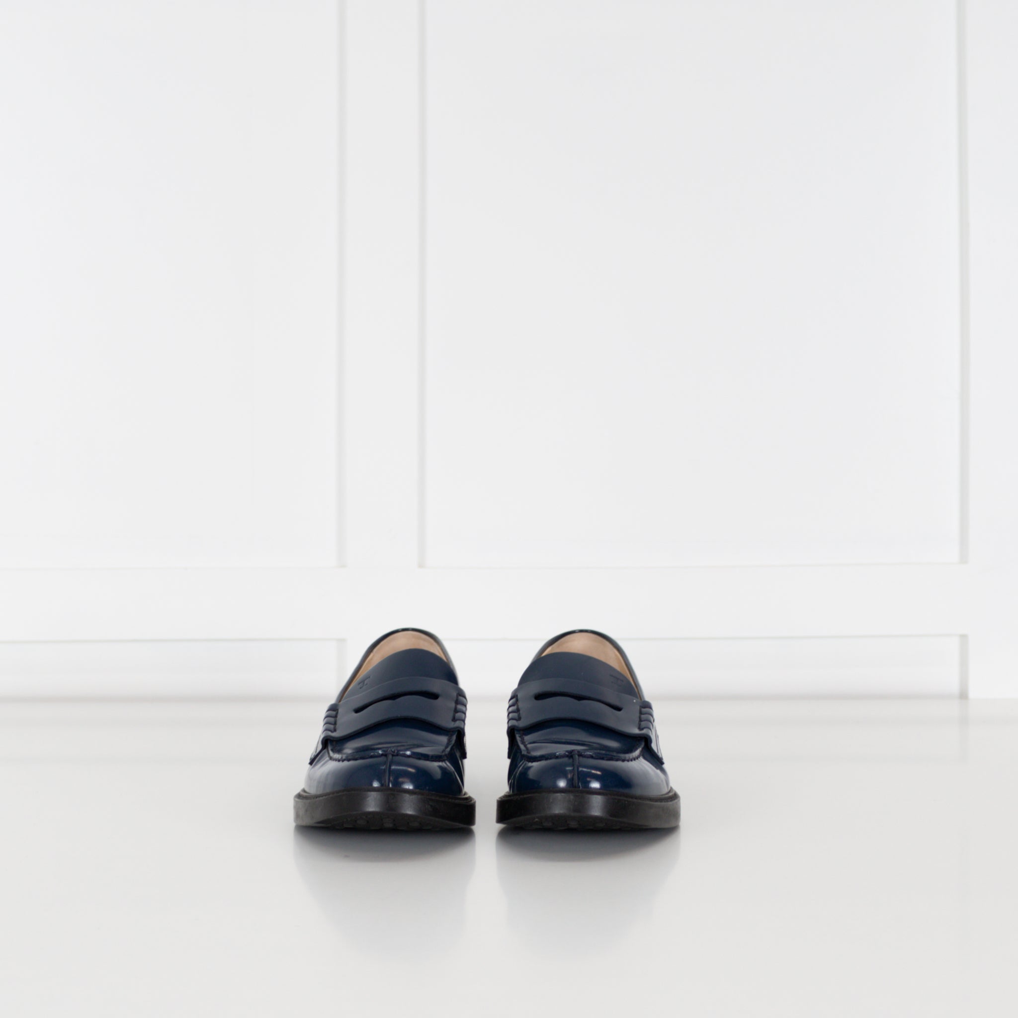 Tod's loafers, featuring a stunning blue glossy leather, with a gorgeous handcrafted front design, rounded toe, and a rubber sole with a 3cm block heel.