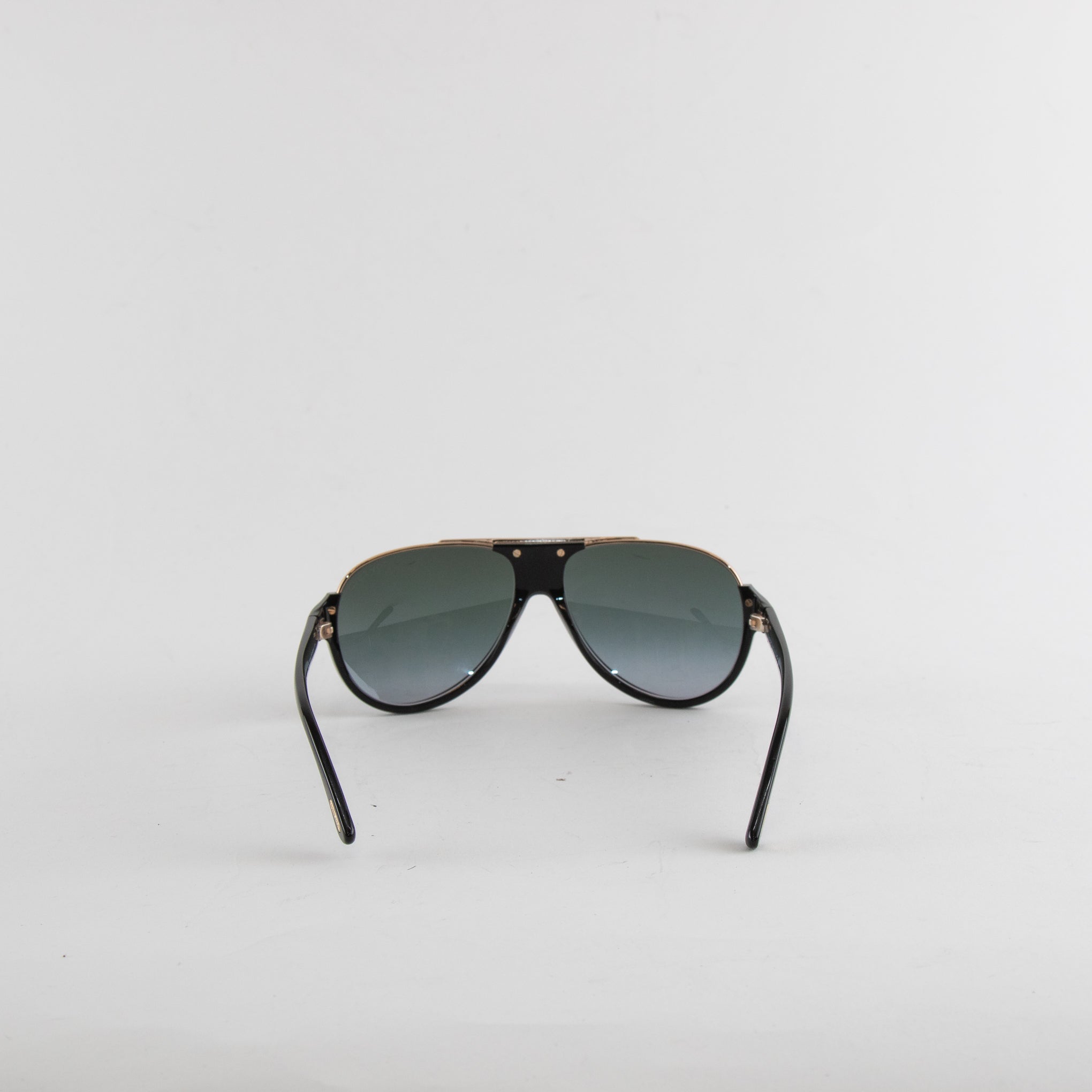 Tom Ford Dimitry black and gold aviator sunglasses with half acetate, half wire frames. Finished with gradient-tinted lenses and subtle gold-tone T branding on the corners. Accompanied by the original case.