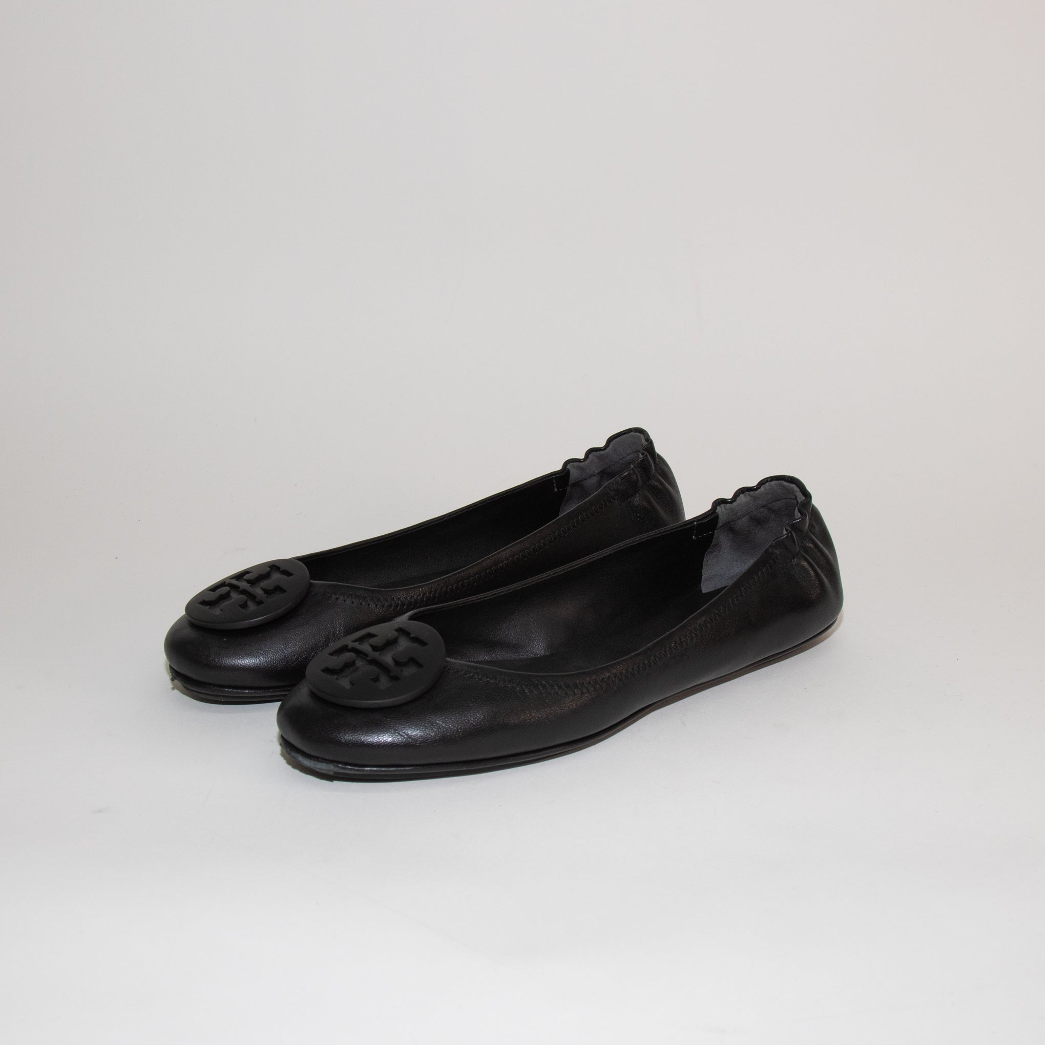 Tory Burch black leather Minnie Travel Ballet flats with a matte black T logo plaque on the front of the foot, a rounded toe, rubber insert soles, and slightly elasticated heel backs for a snug fit. Accompanied by the original box.