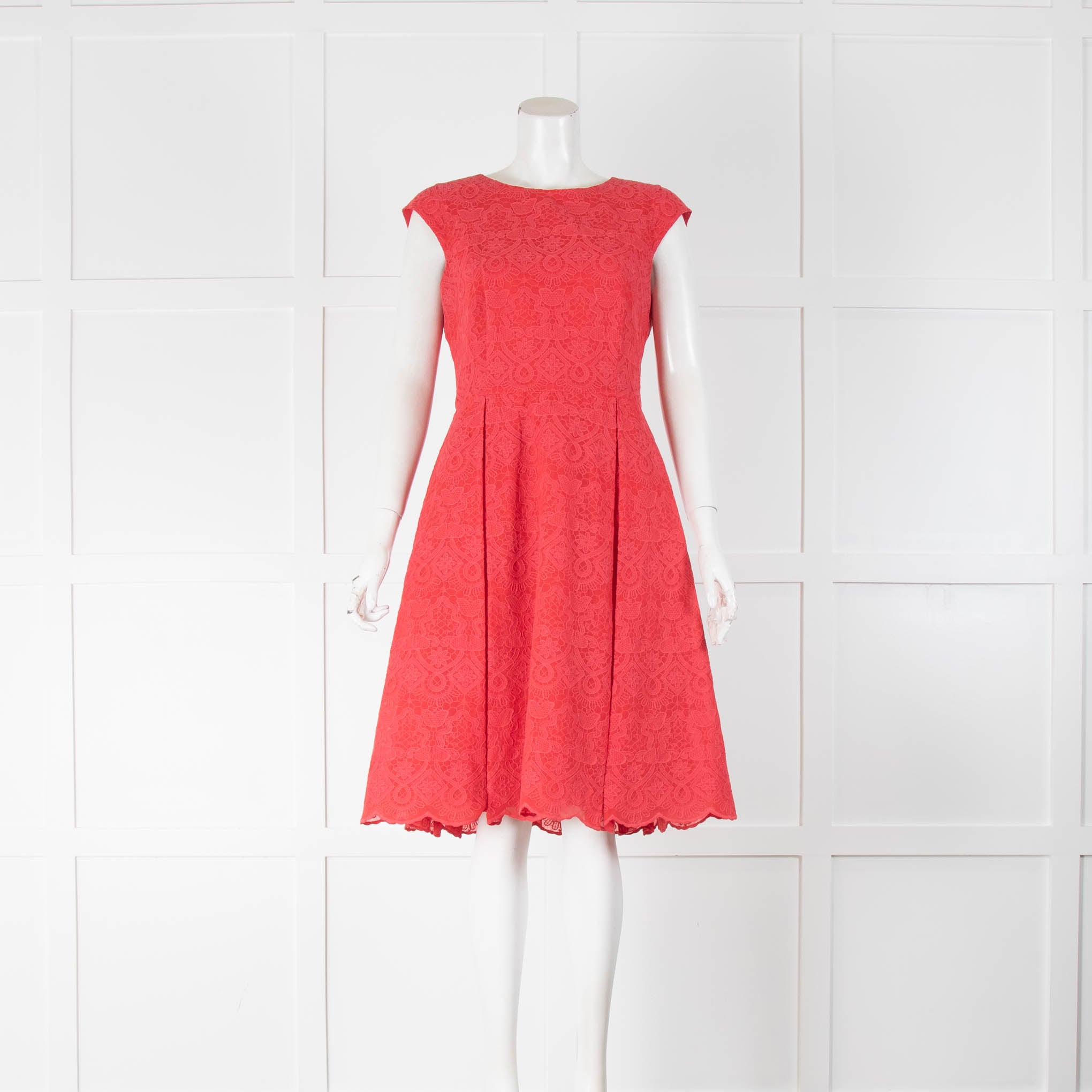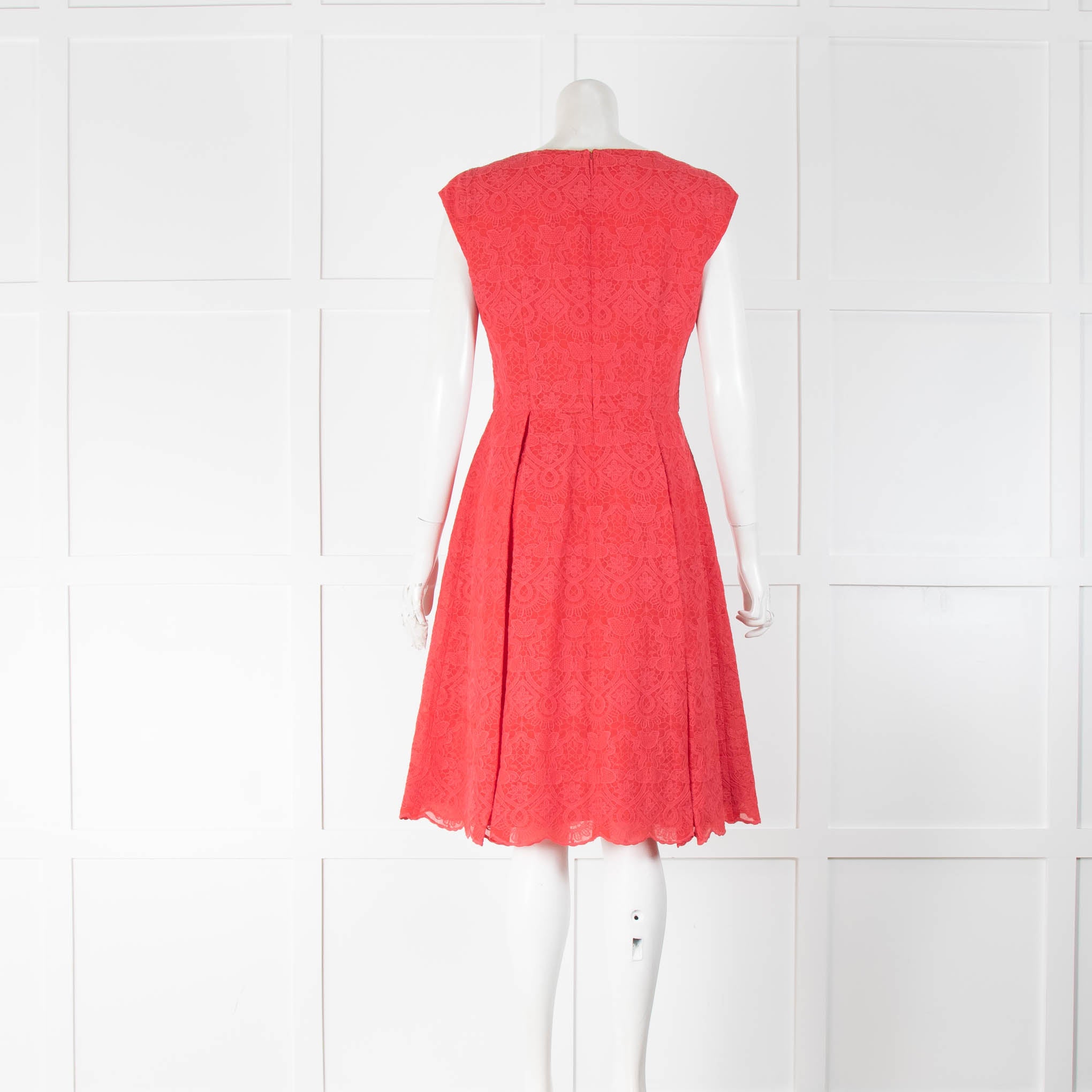 Tory Burch coral cotton dress with lace embroidery detail. Features a round neckline, cap sleeves, and a pleated A-line skirt. Has a concealed zip back fastening and is lined for addiotnal coverage.