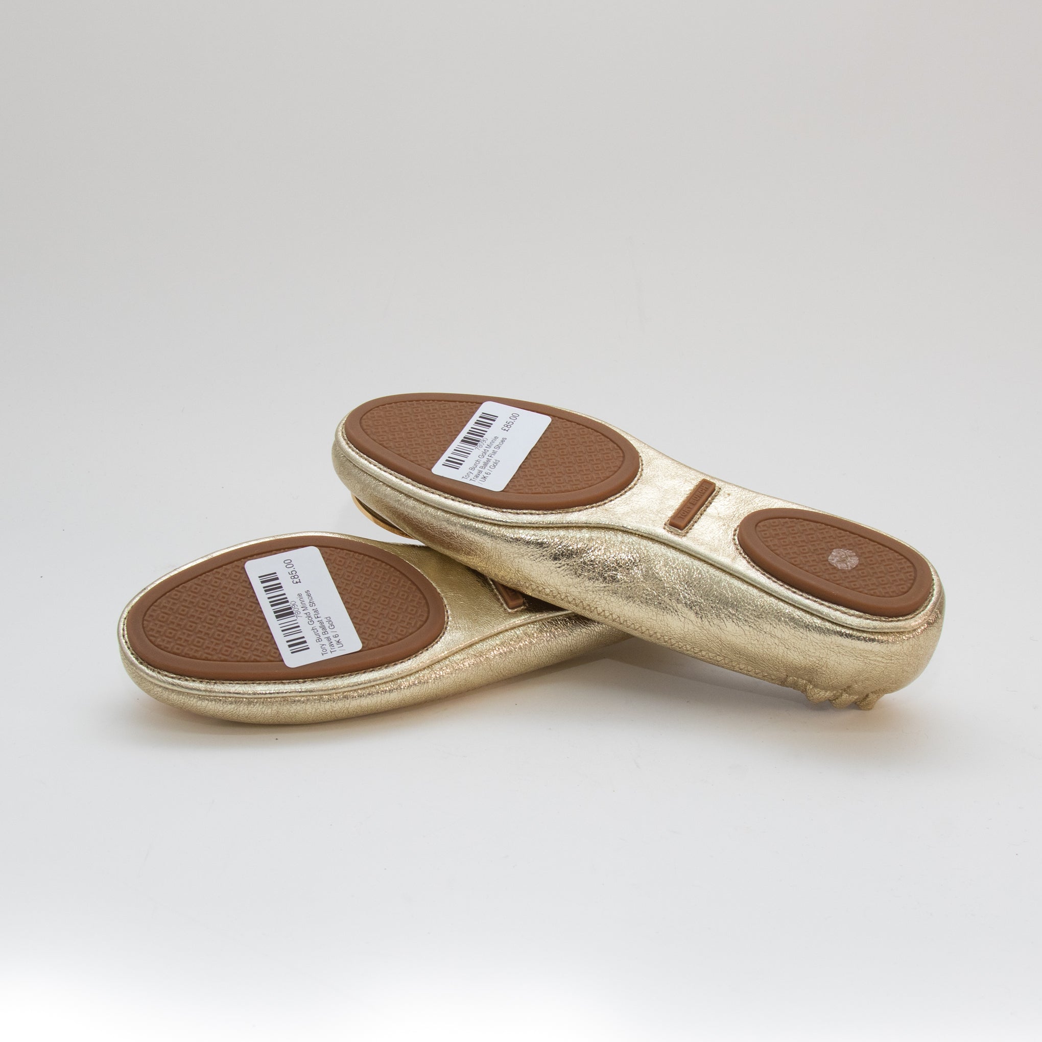 Tory Burch gold crinkle leather Minnie Travel Ballet flats with a gold-tone metal T logo plaque on the front of the foot, a rounded toe, rubber insert soles, and slightly elasticated heel backs for a snug fit. Accompanied by the original box.