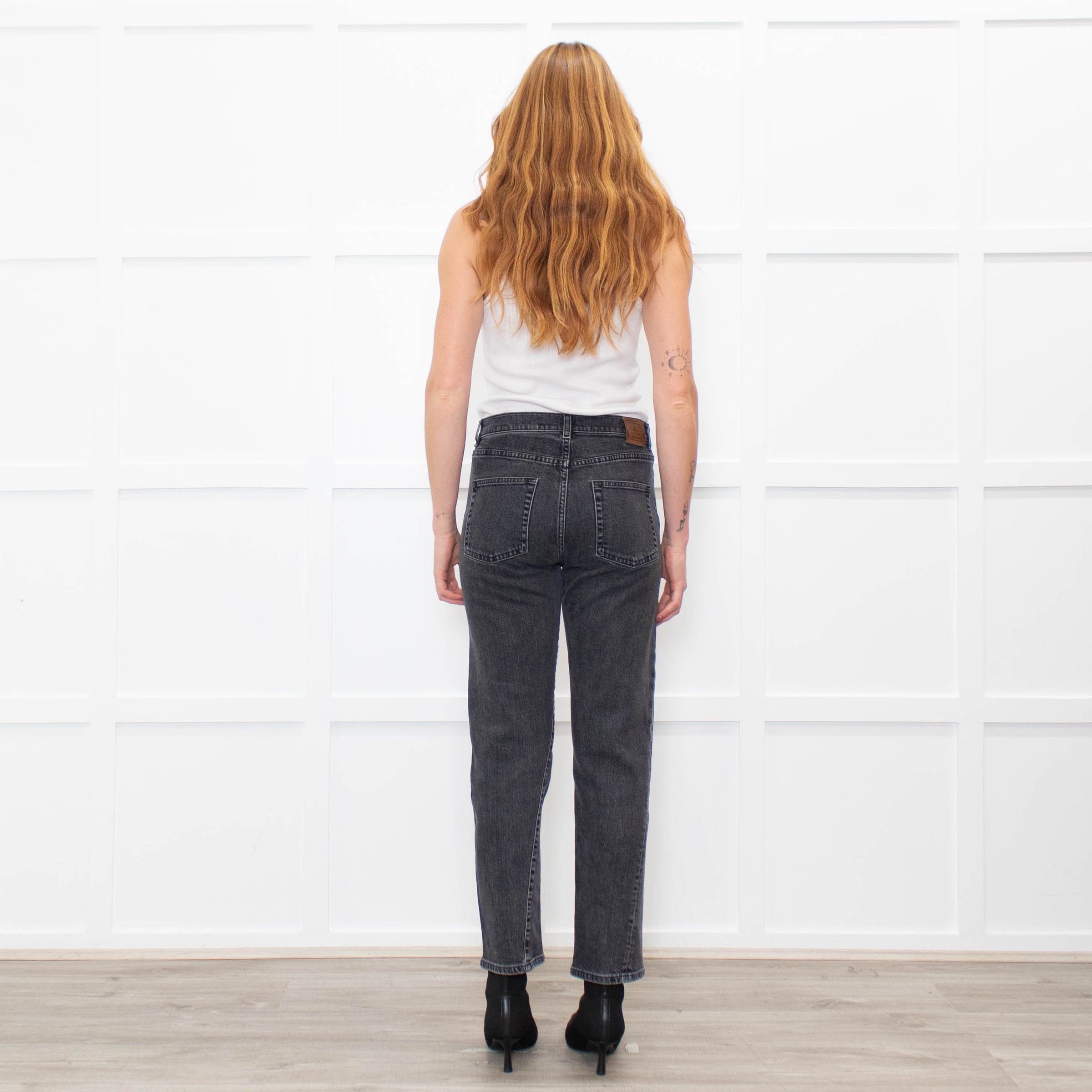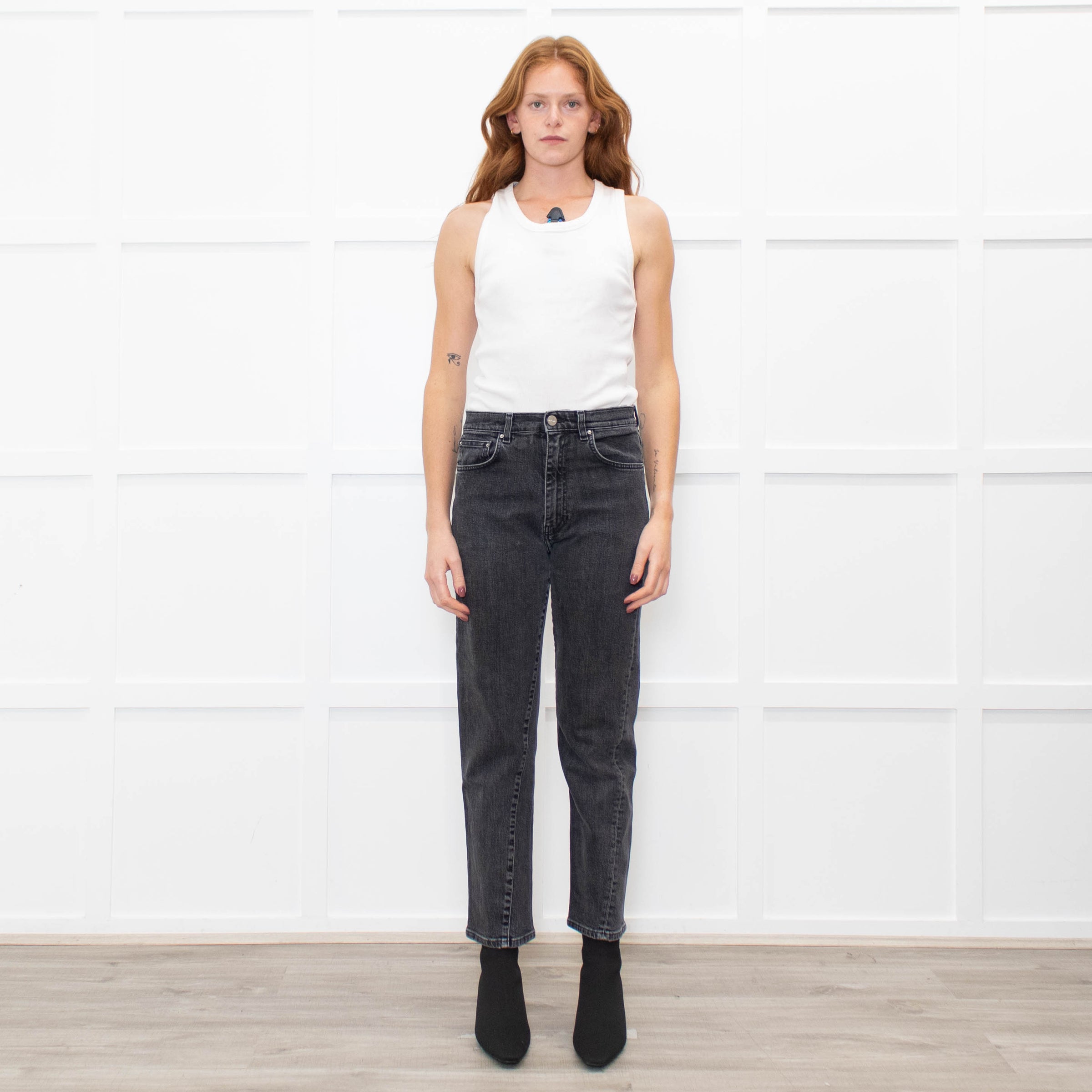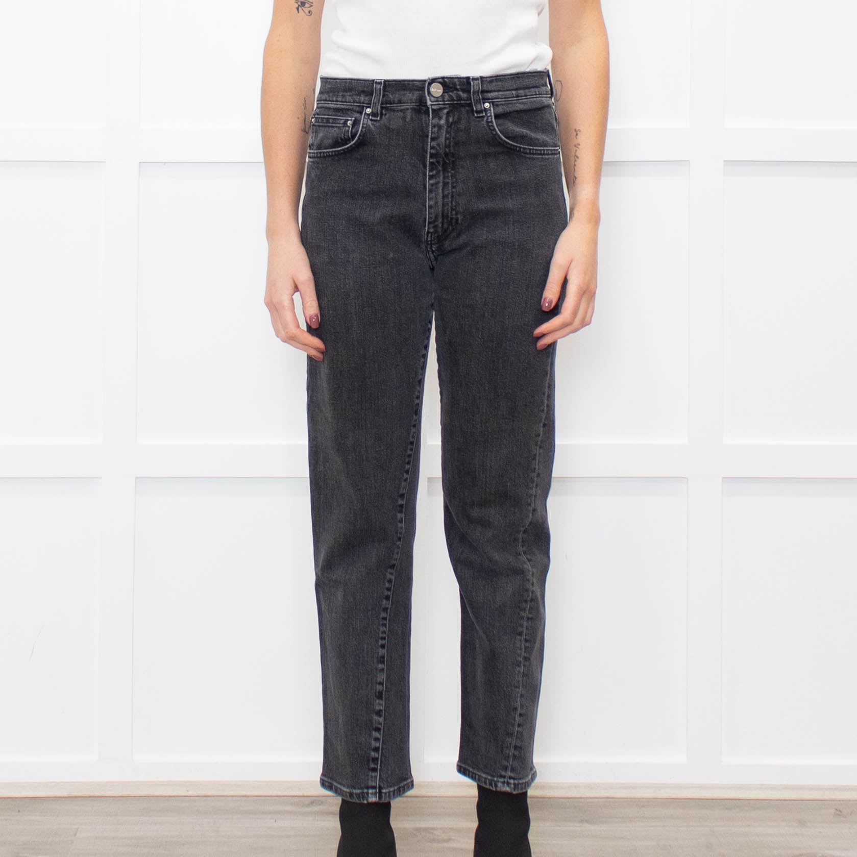 Toteme black/ grey wash denim twisted seam jeans with belt loops, five pockets, tonal topstitching, and a concealed zip fly.