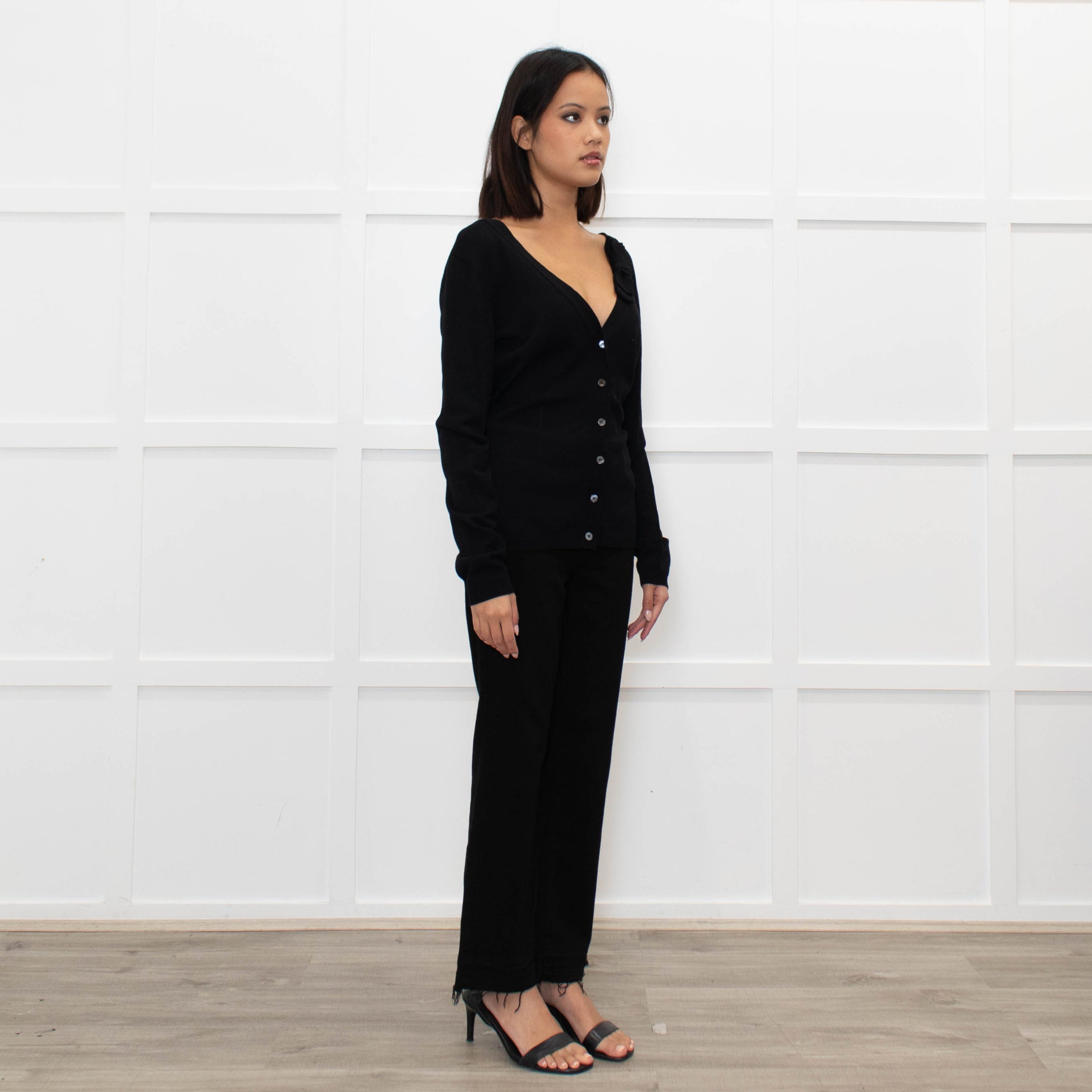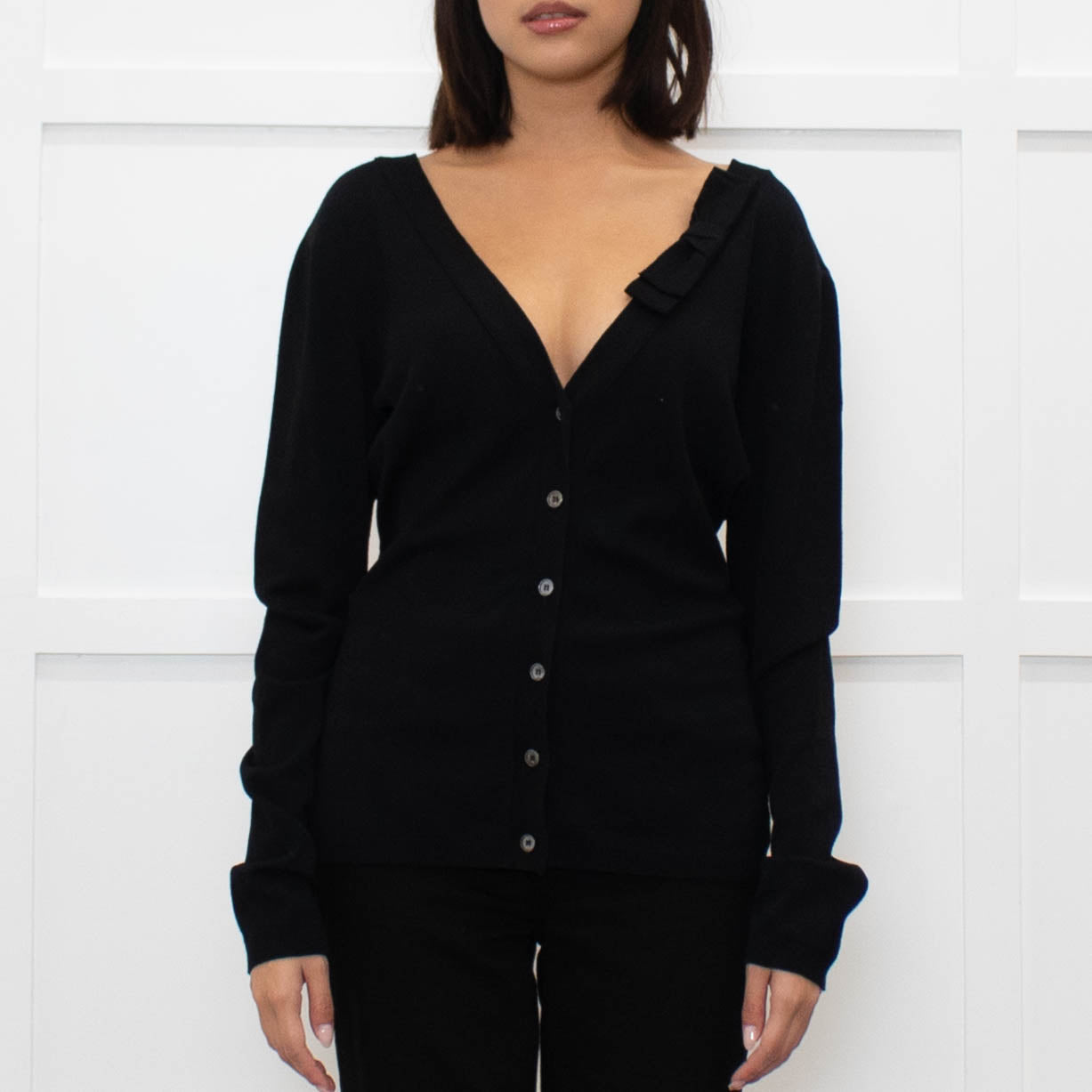 Valentino button-up V-neck black cardigan with the most elegant black lace and front bow.