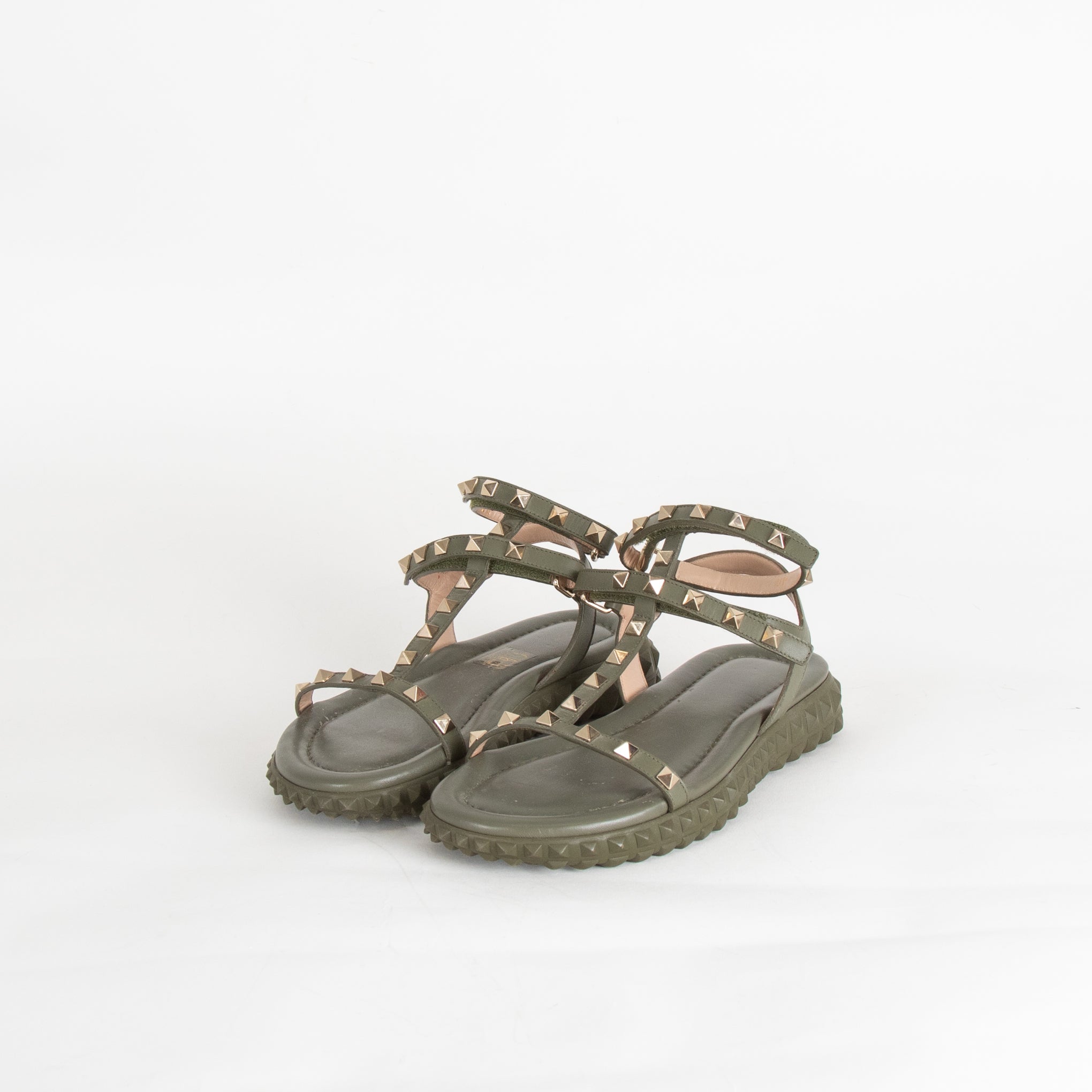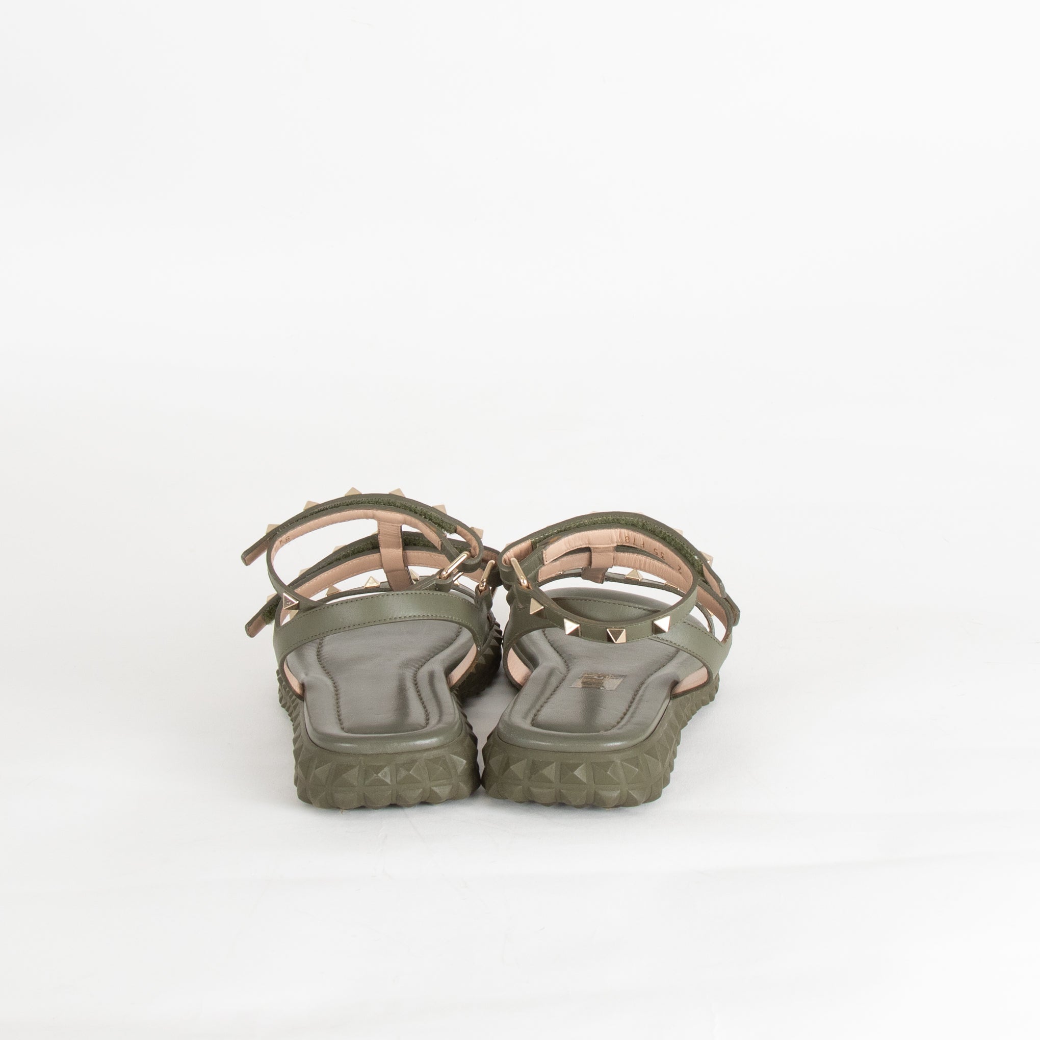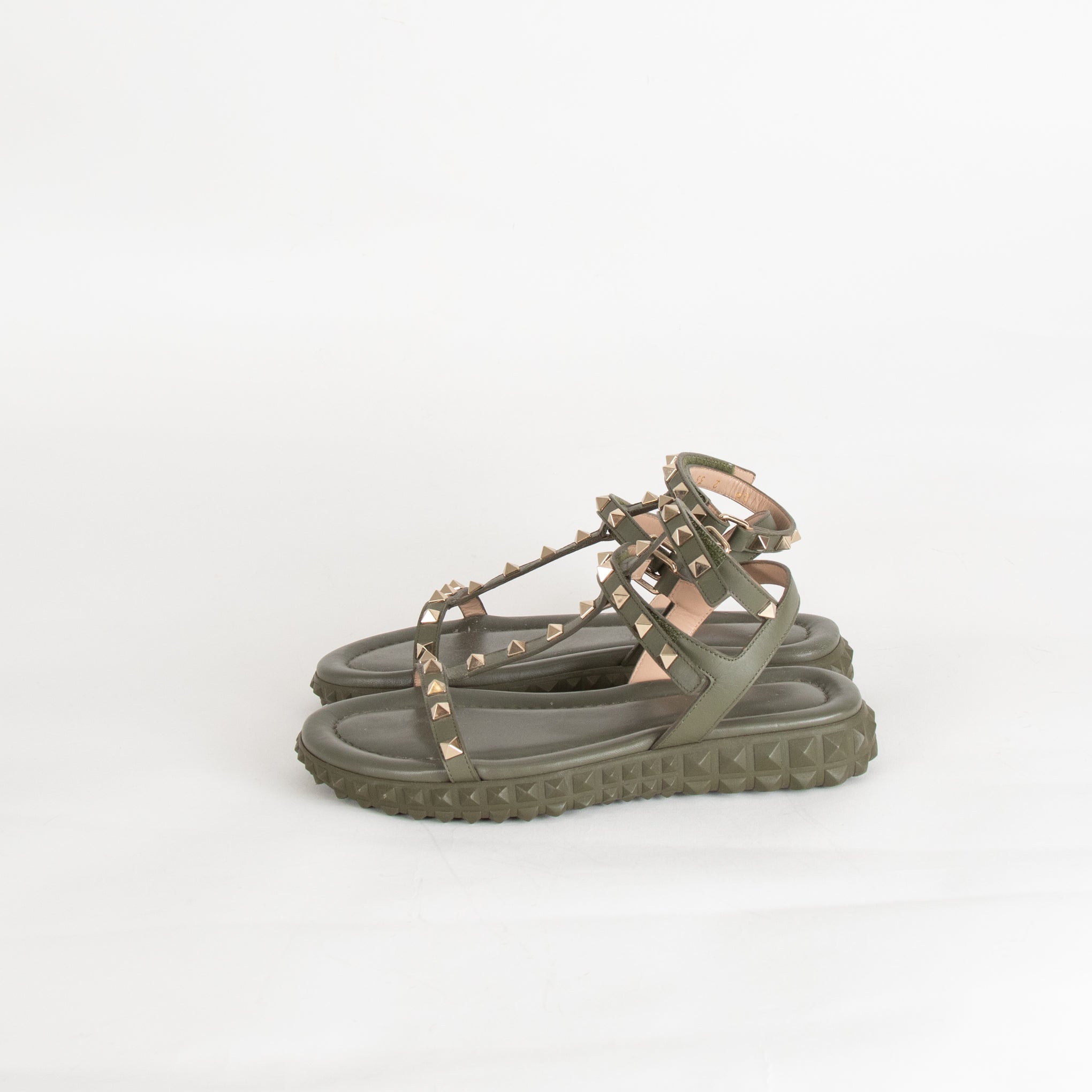 Valentino rockstud Gladiator sandals with chunky rubber sole, a rounded toe, and velcro strap closure.