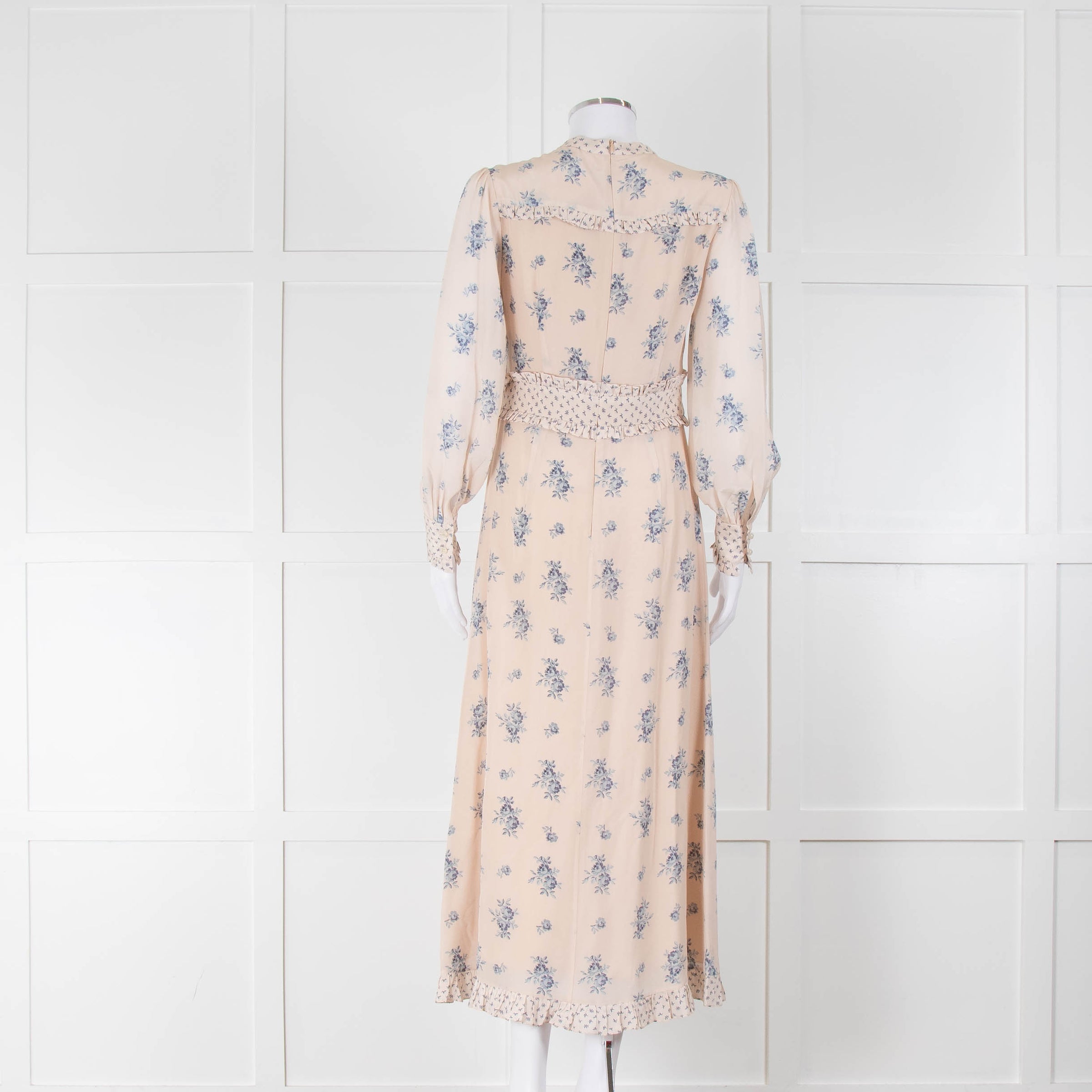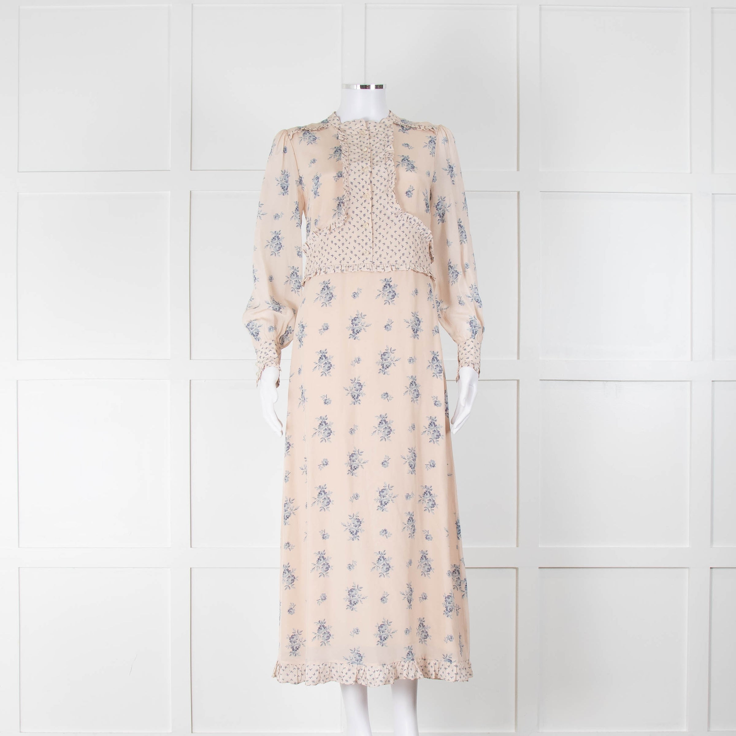 Vilshenko light beige long-sleeve maxi silk dress with blue floral print. This dress features front button closure, frilled detailing, and rear concealed zip closure.