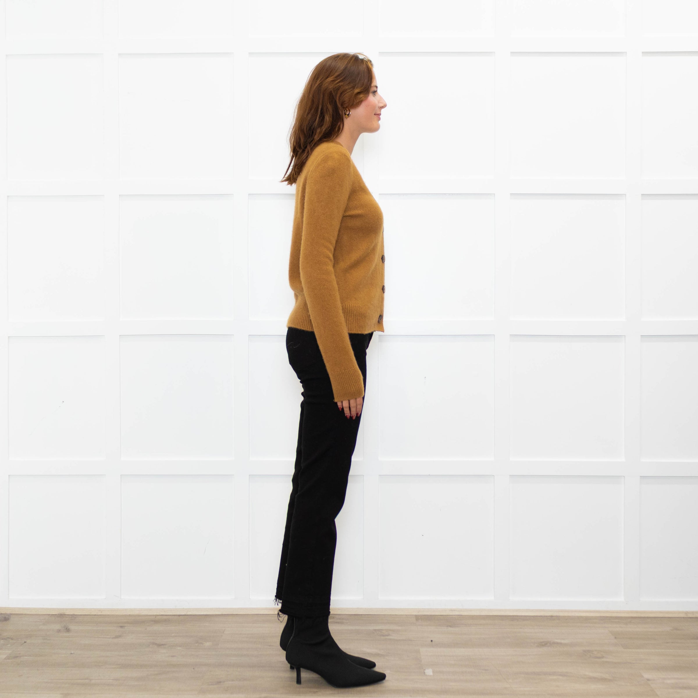 Vince camel brown cashmere cardigan with a button-up front, V-shaped neckline, long sleeves, and ribbed trims.