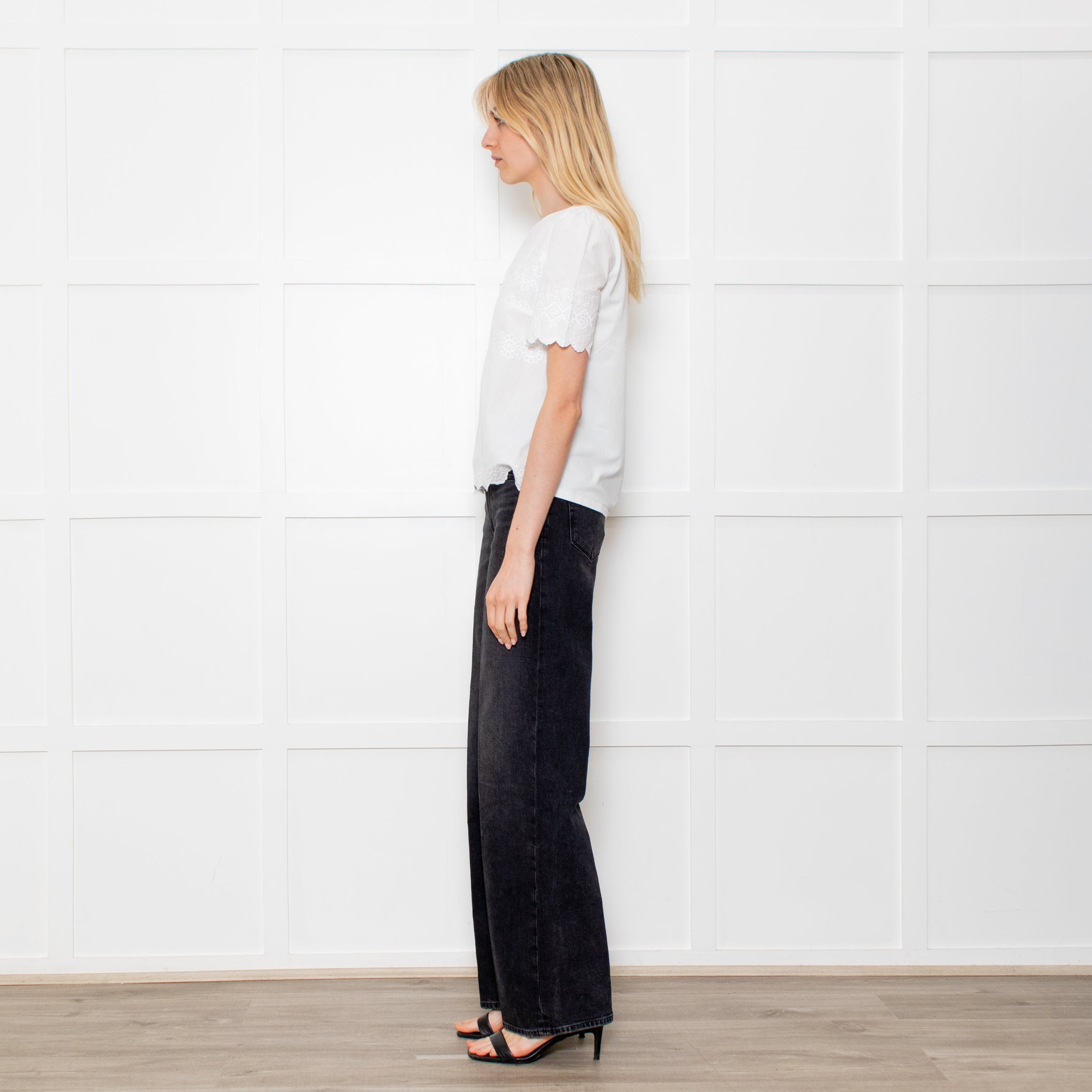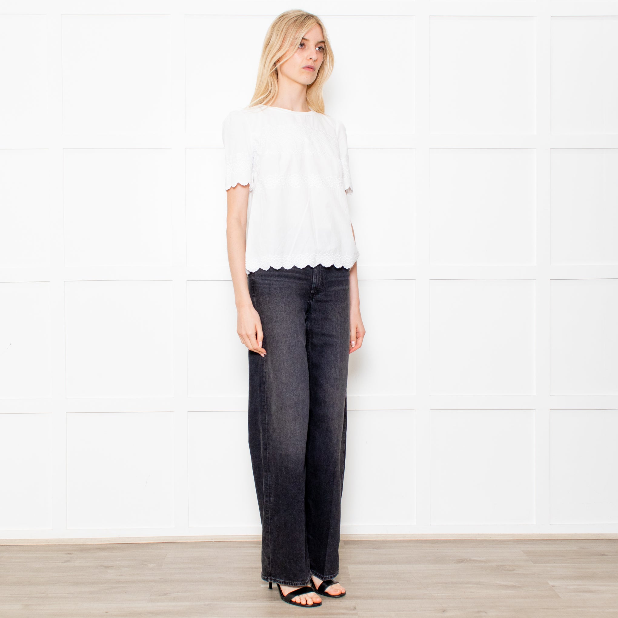 Weekend Max Mara white cotton top with tonal embroidered detailing on the front and sleeves. With a cotton front and sleeves, this top is finished with a jersey back panel and scalloped edge detailing.