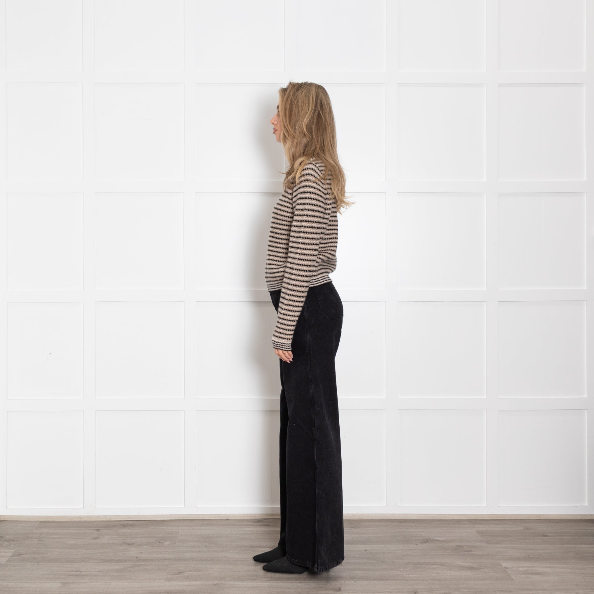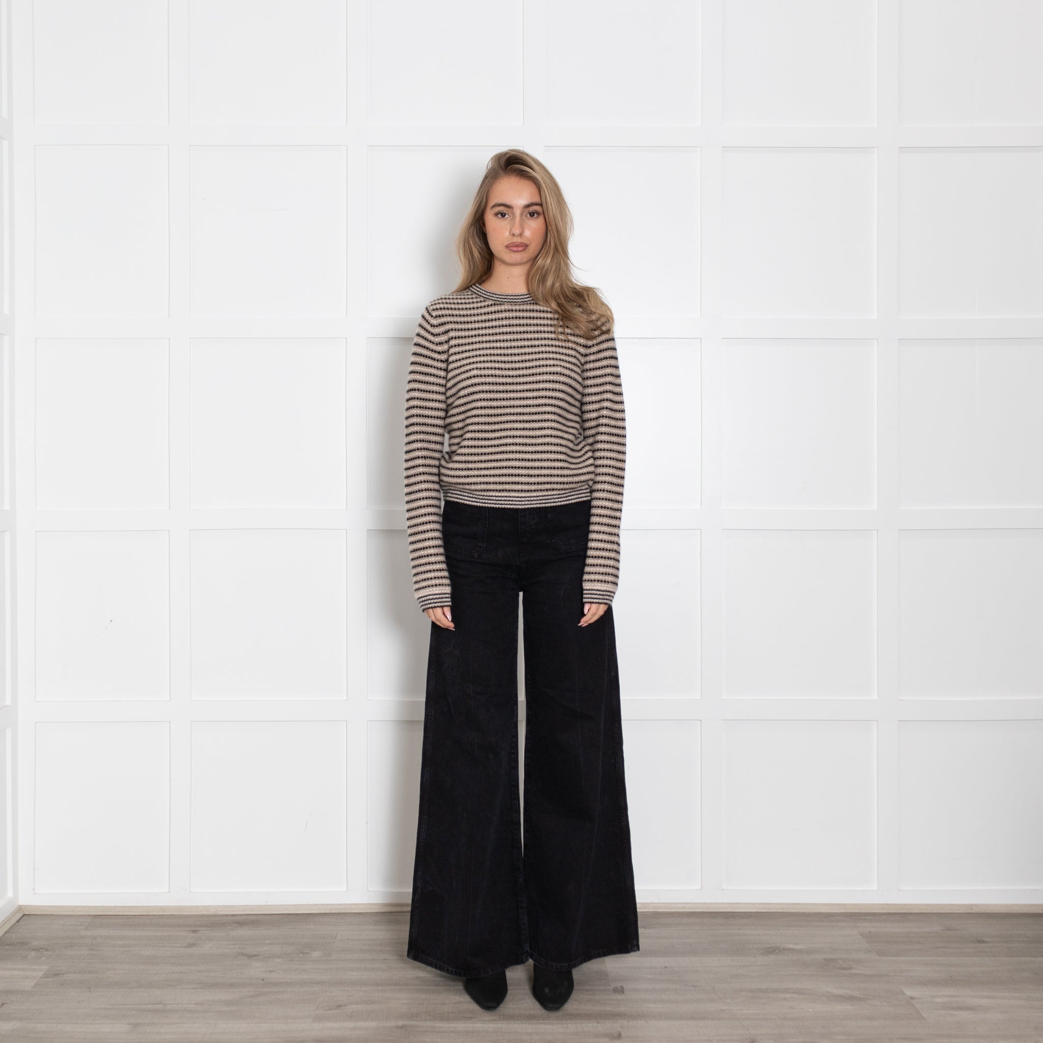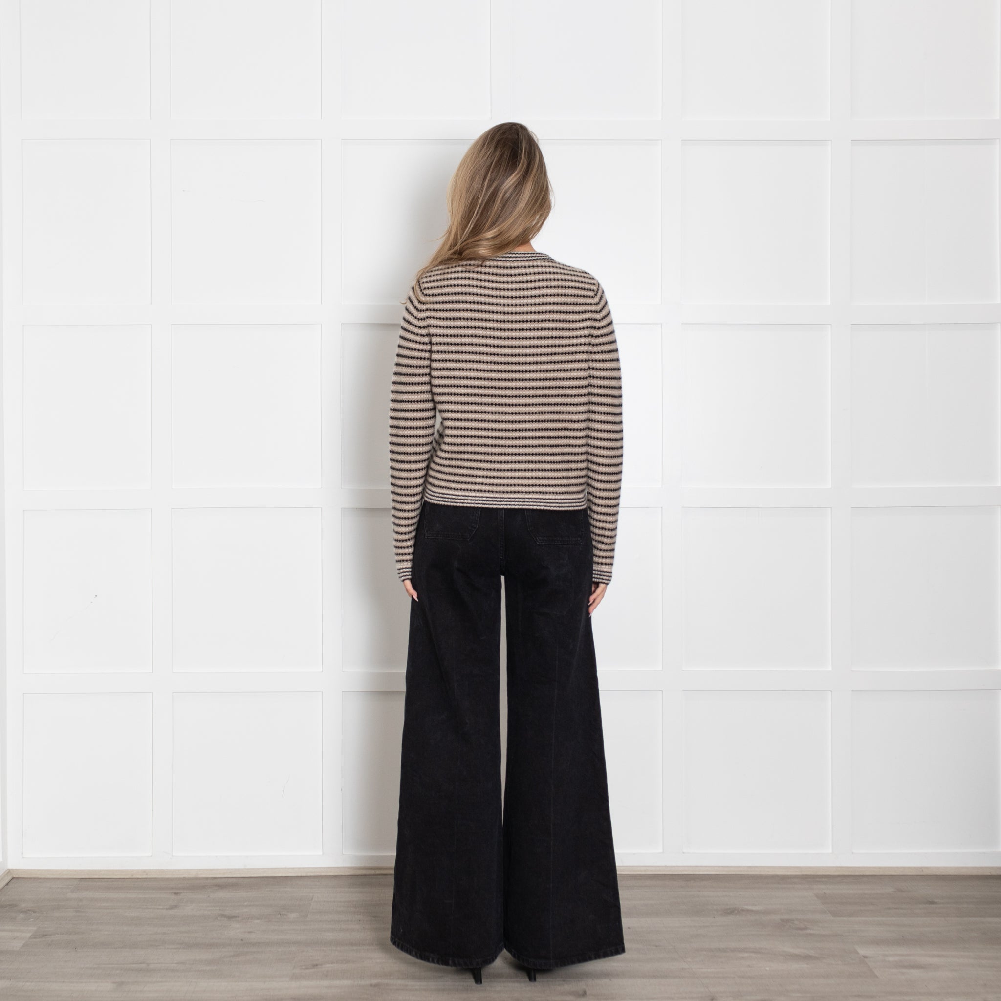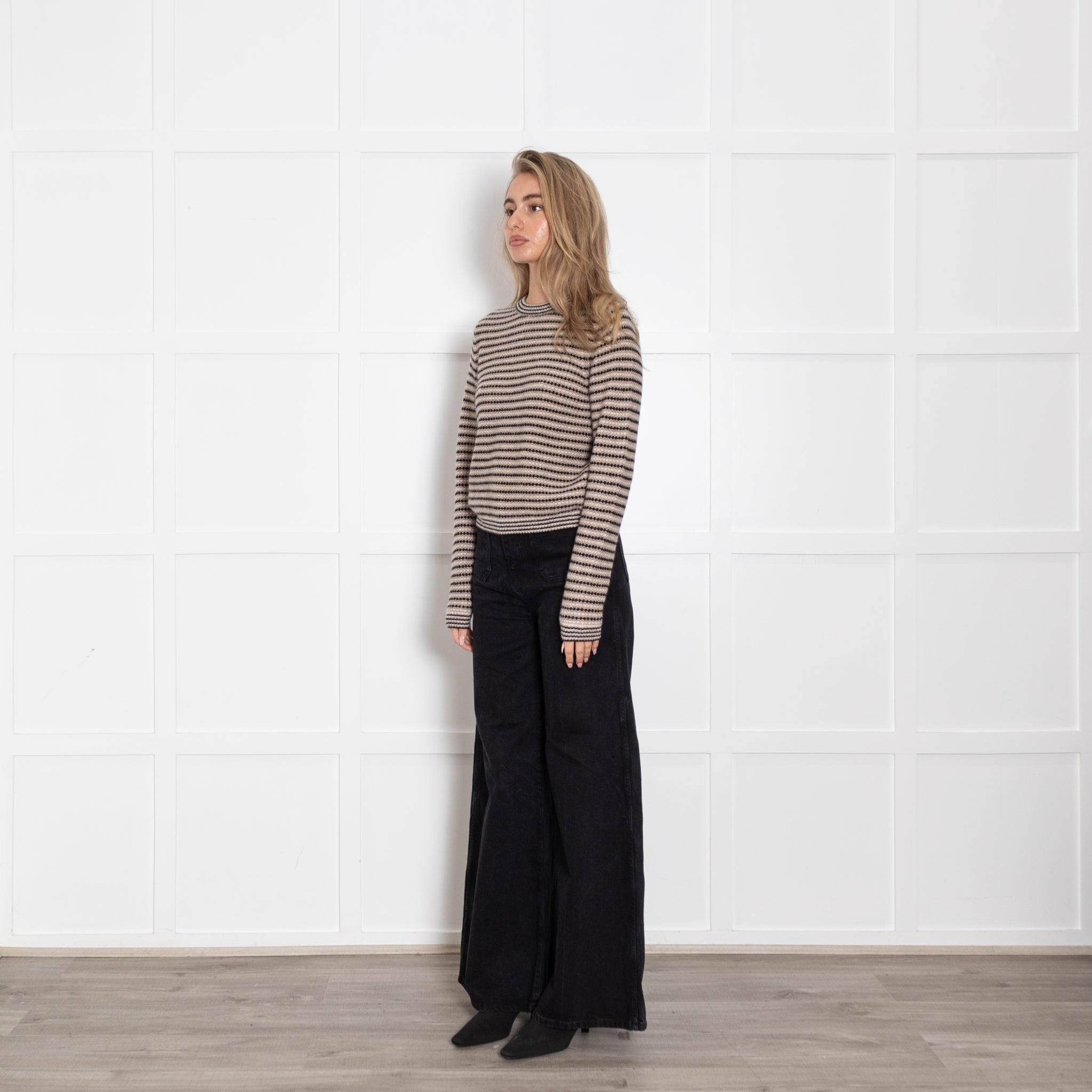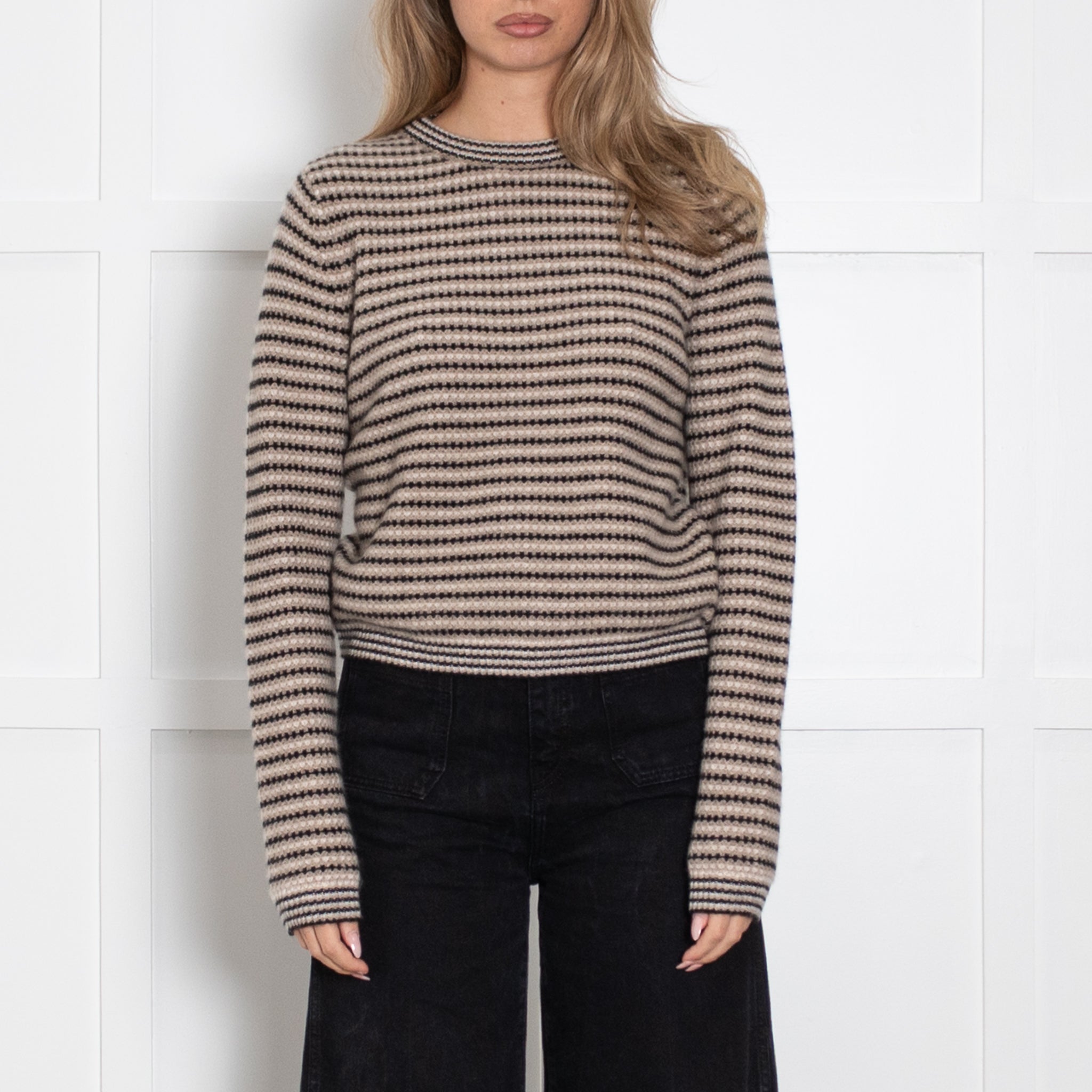 White + Warren long-sleeve black and beige striped jumper, crafted with a soft cashmere fabric, and a classic rounded neckline.