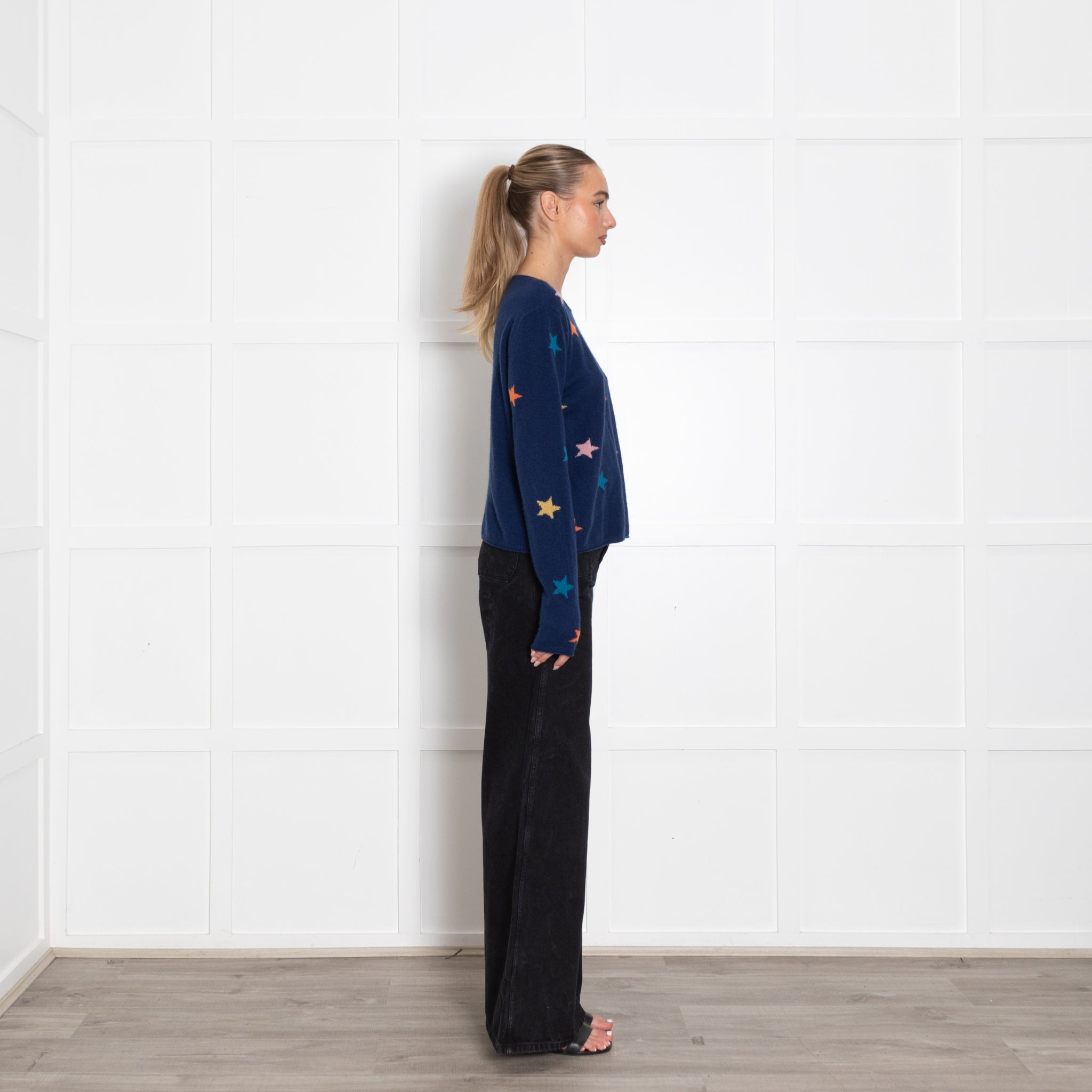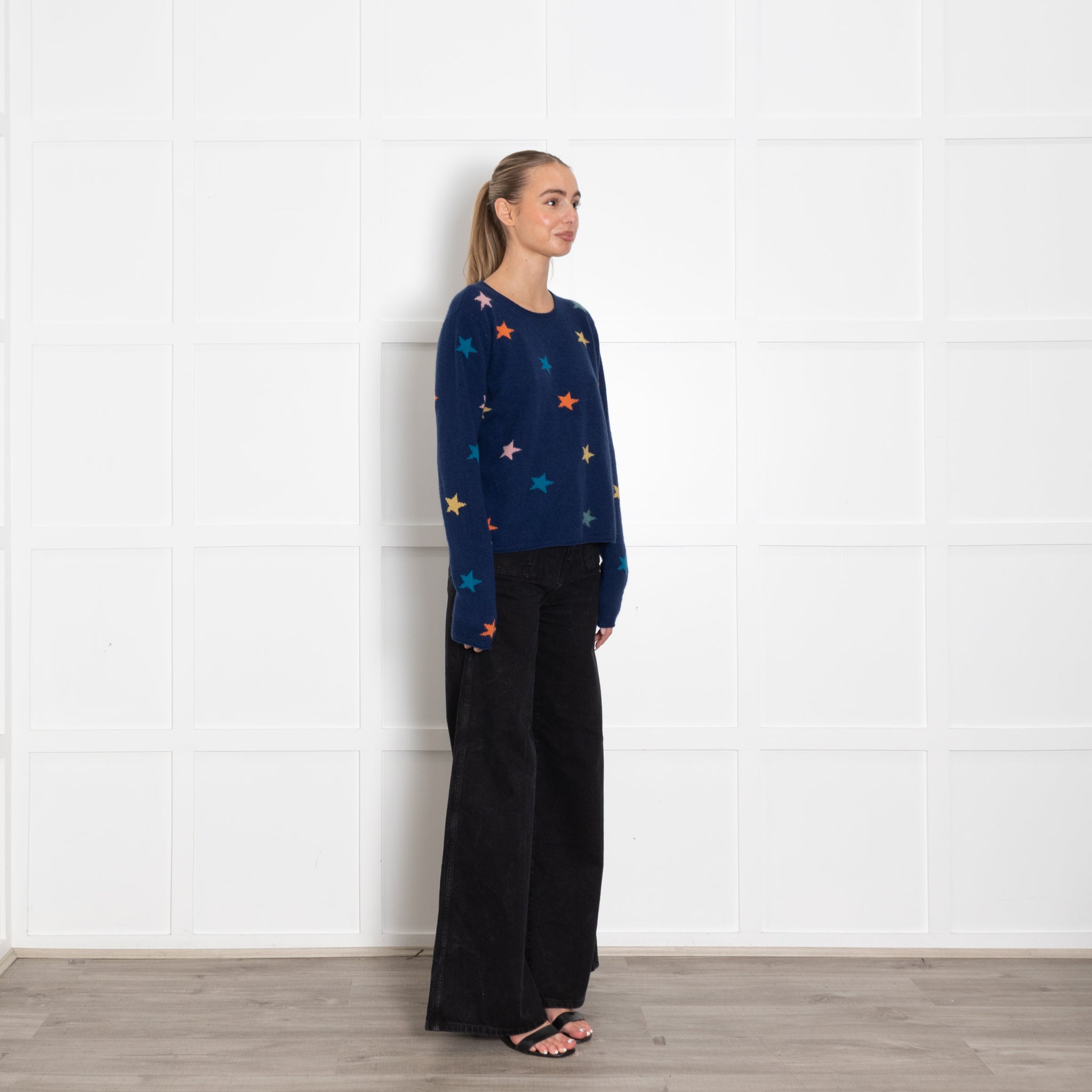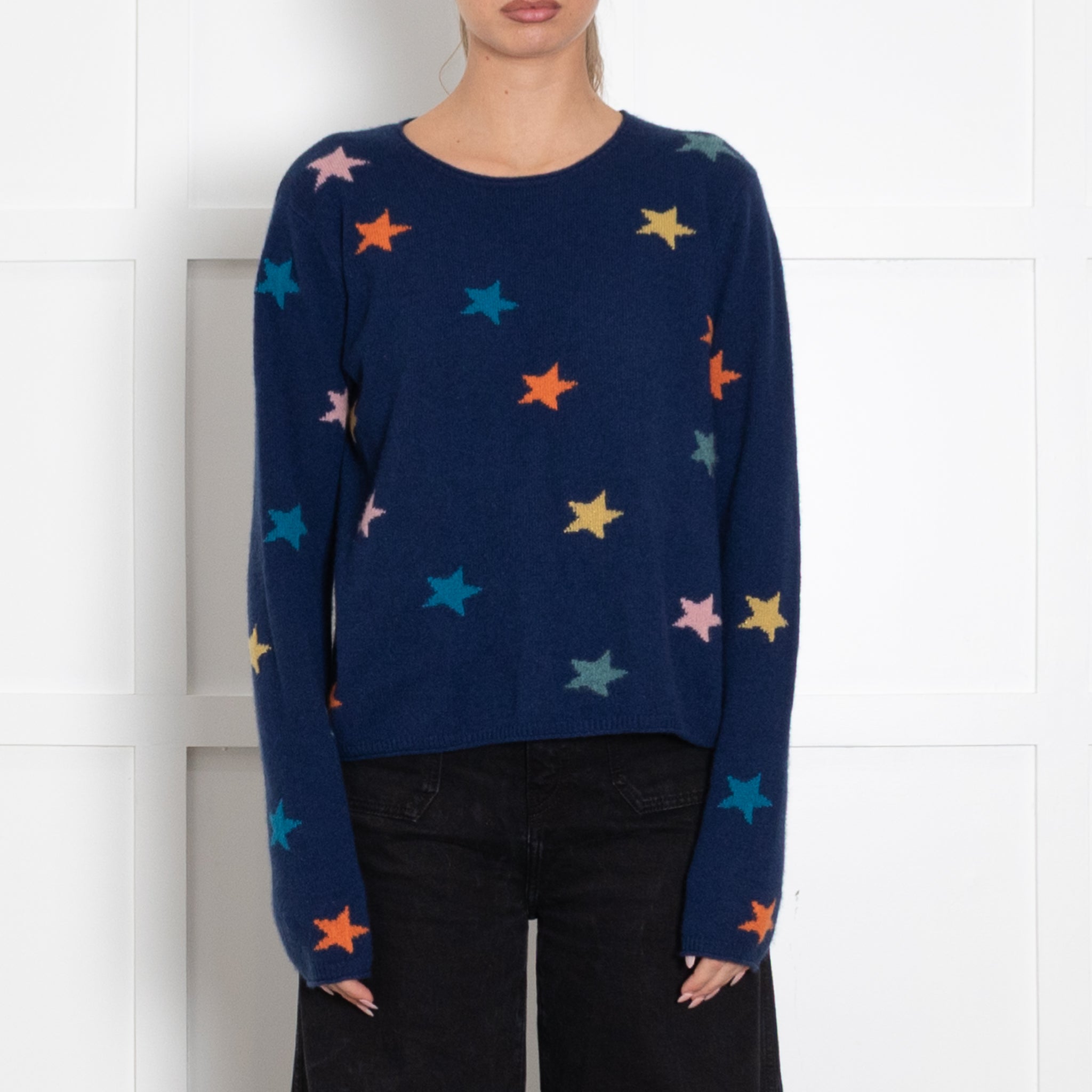 Wyse blue long-sleeve sweater, featuring a multi-star design, crafted with a soft cashmere fabric, and a classic rounded neckline.