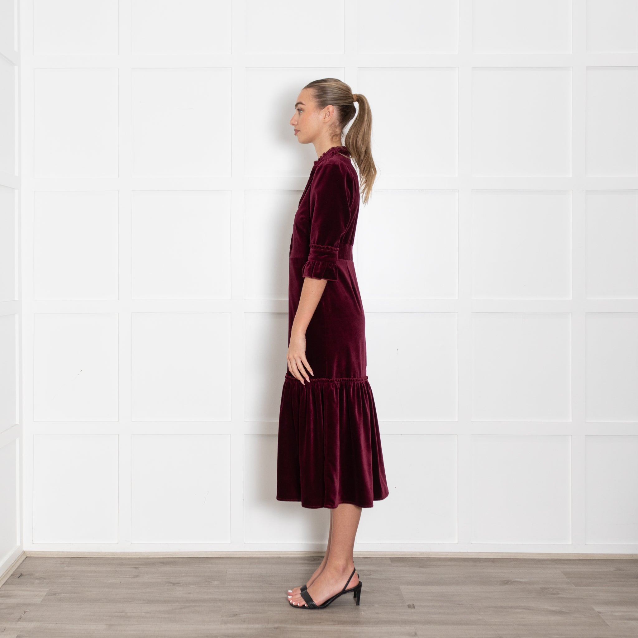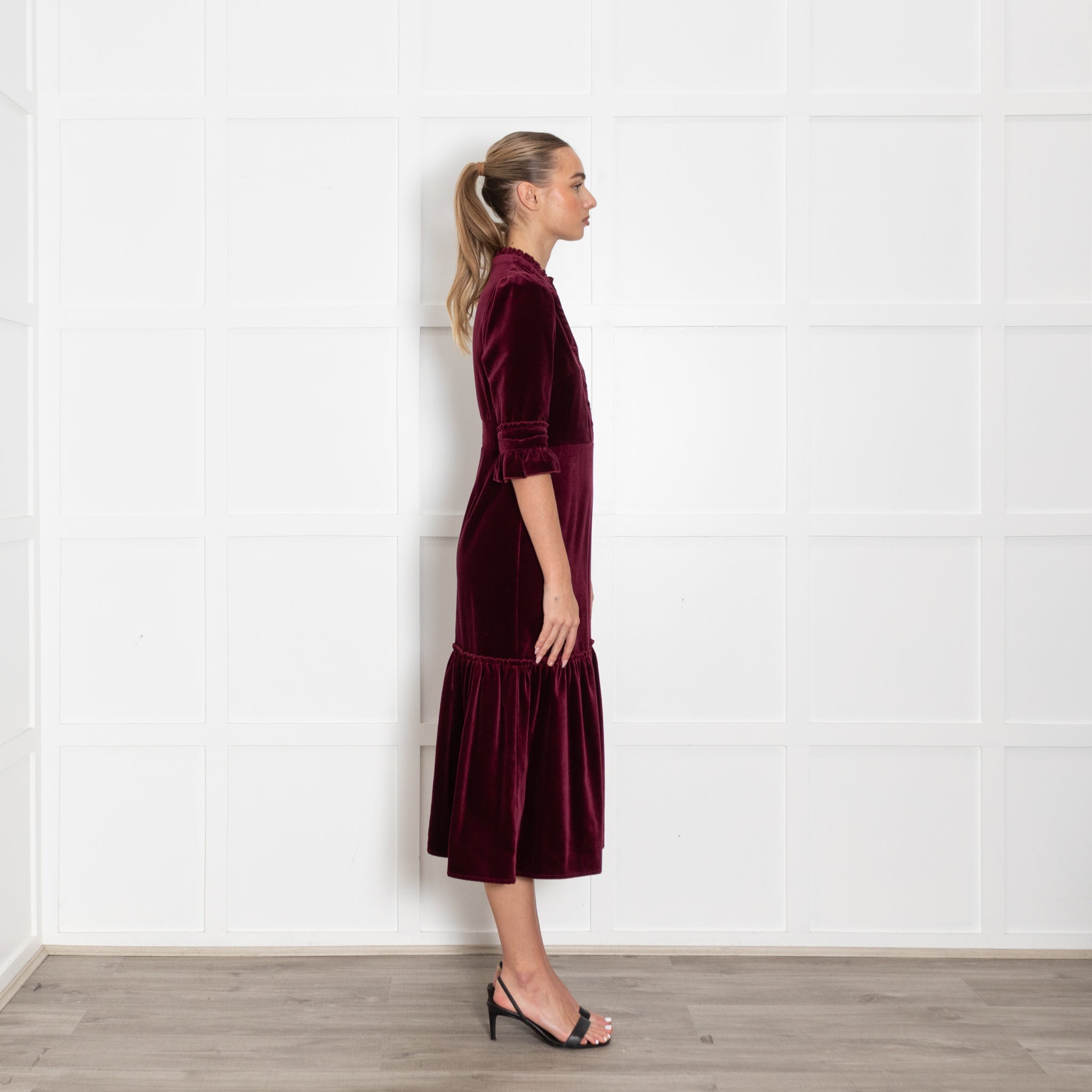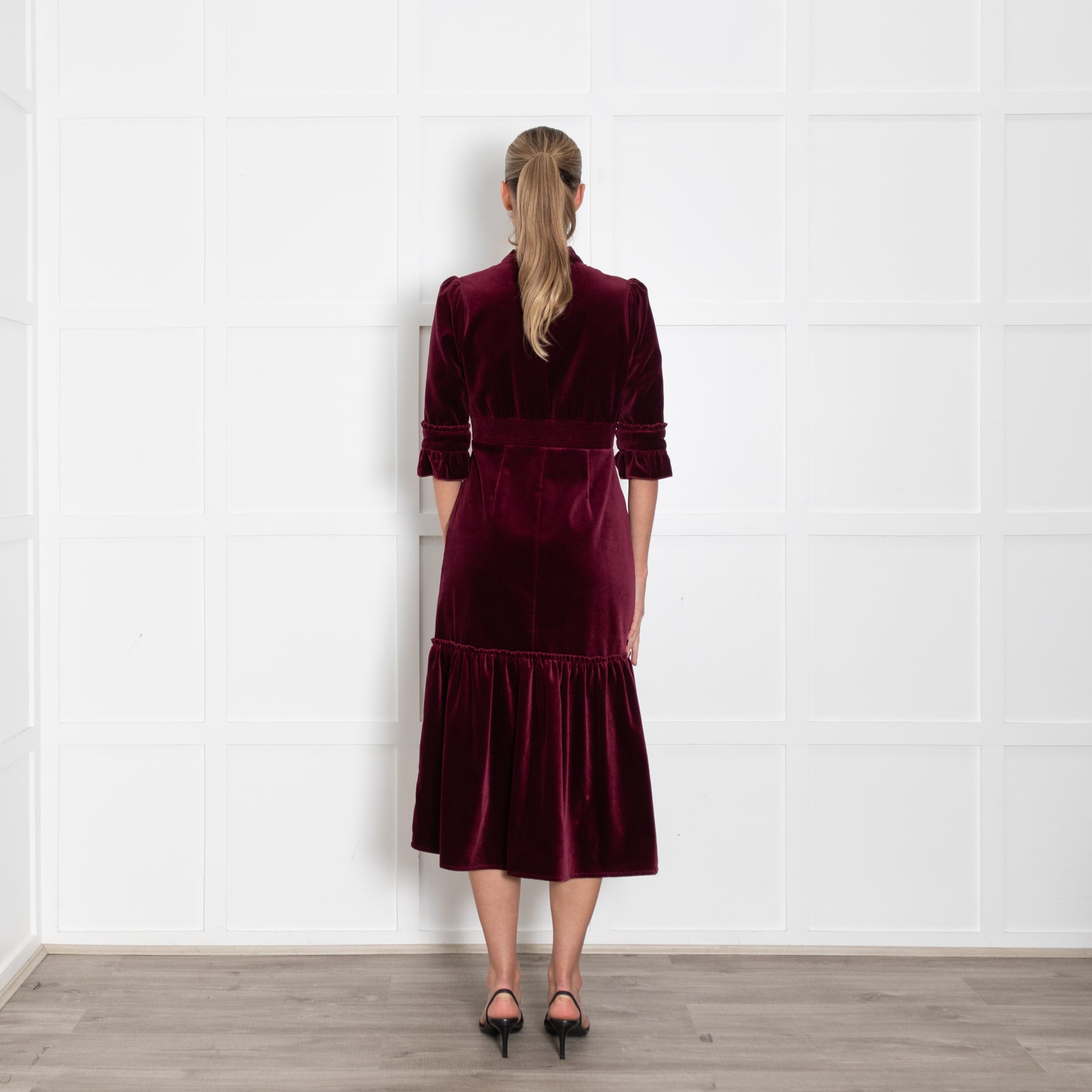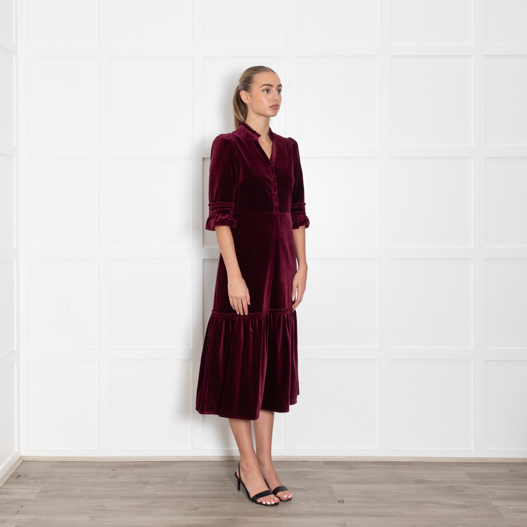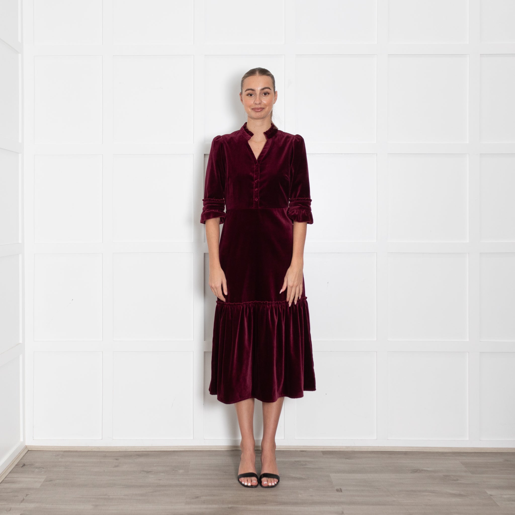 Wyse long-sleeve dark burgundy dress, crafted with a velvet exterior, crafted with a soft cotton fabric, with pleat detailing, and a button-up front closure.