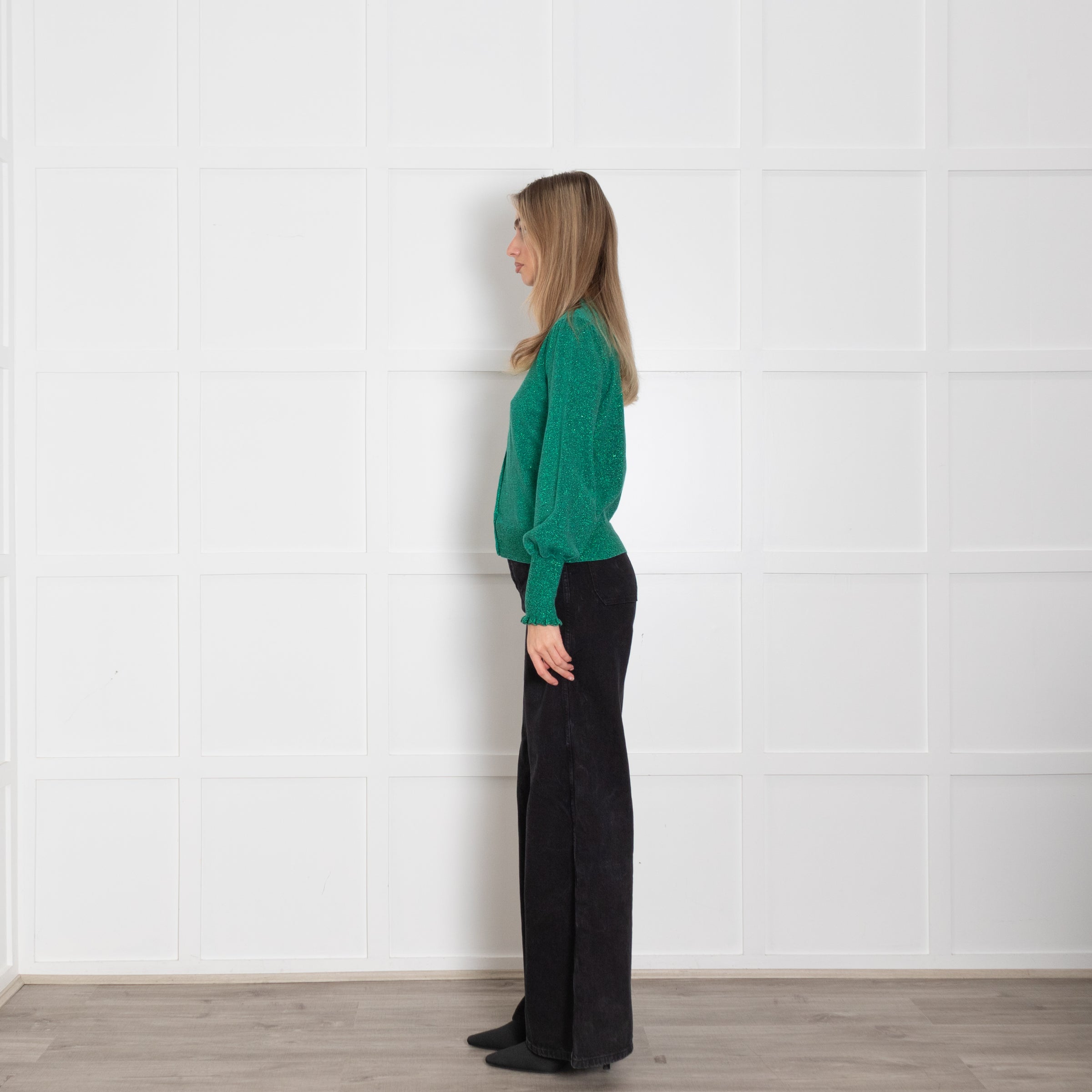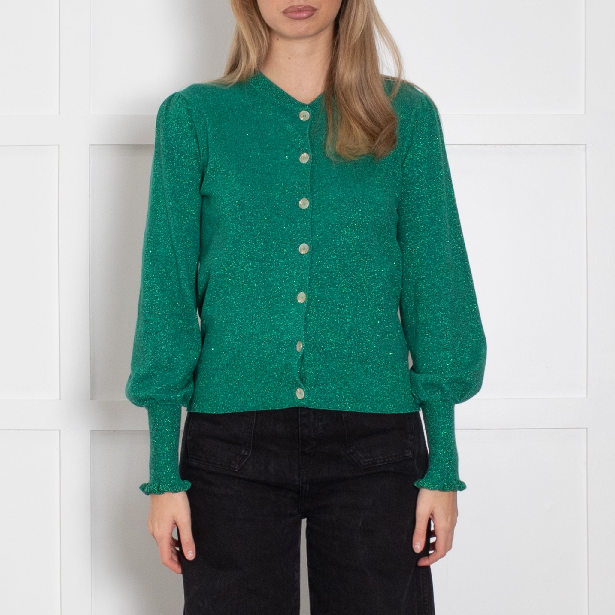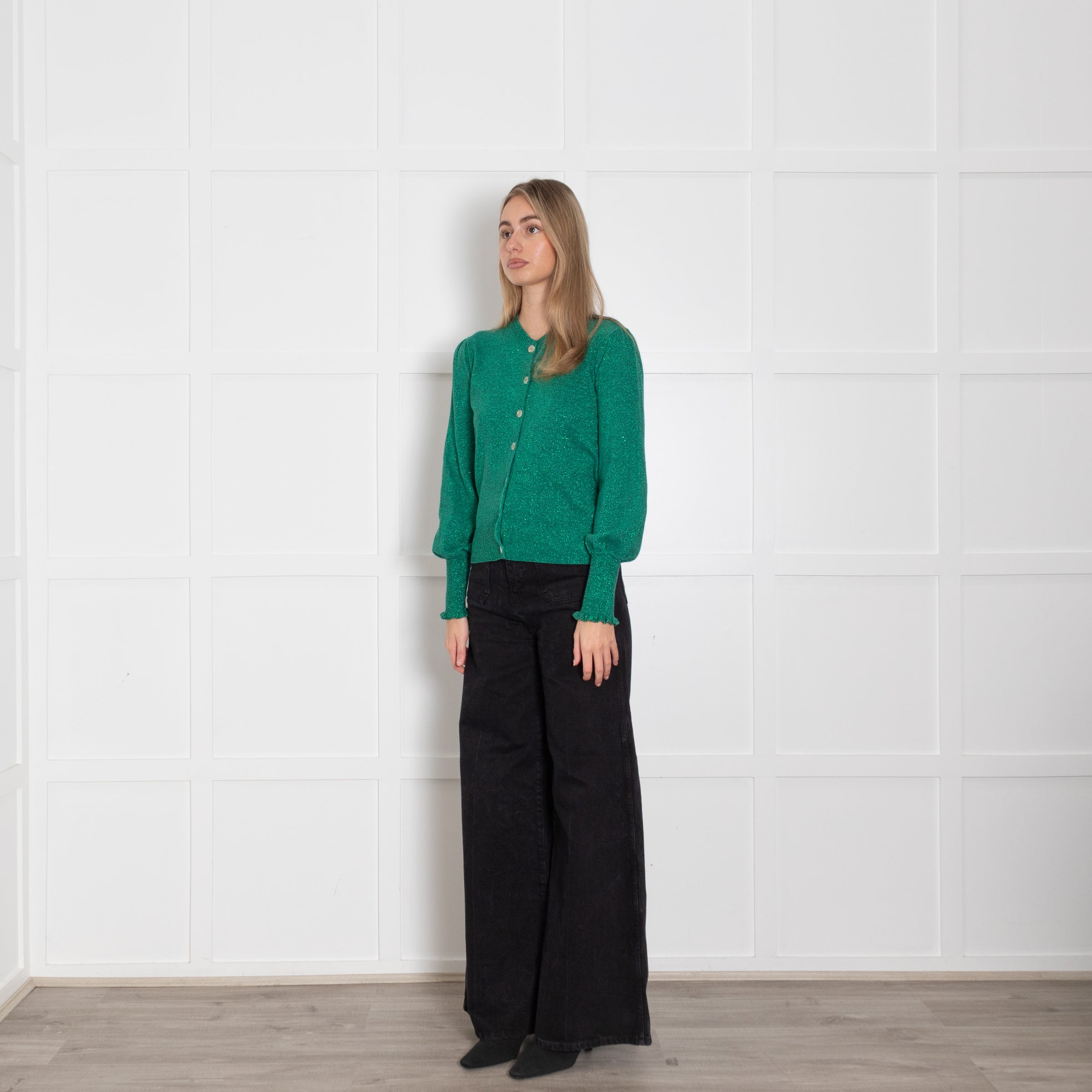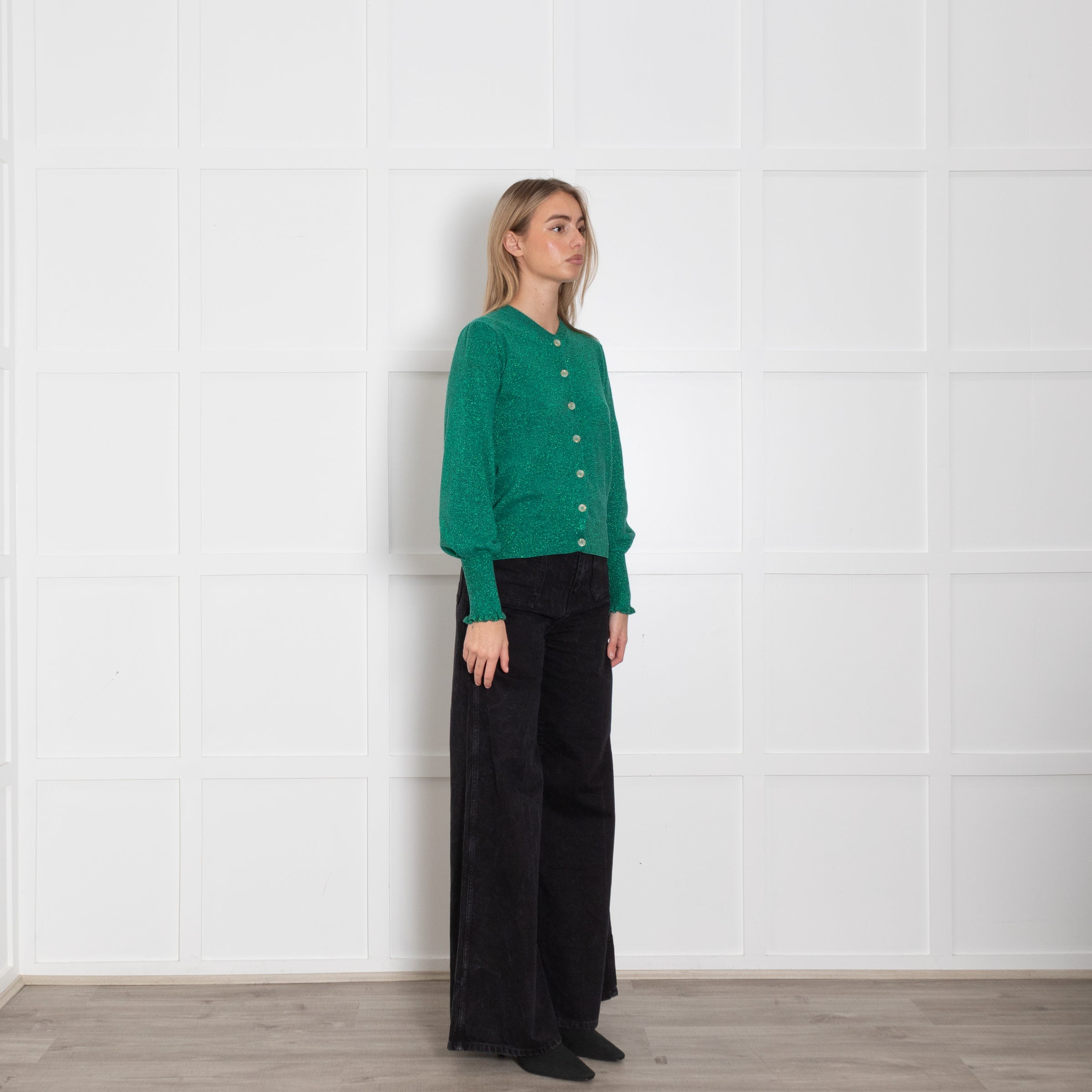 Wyse green long-sleeve cardigan, featuring a button-up front closure, crafted with a stunning shimmery exterior design, with a classic rounded neckline.