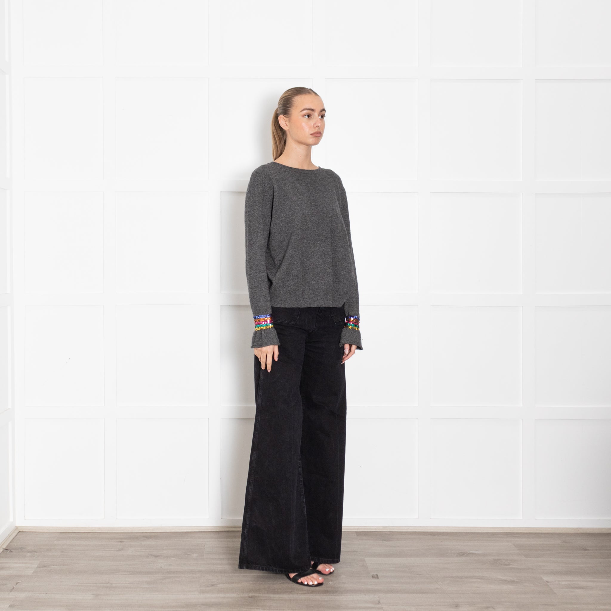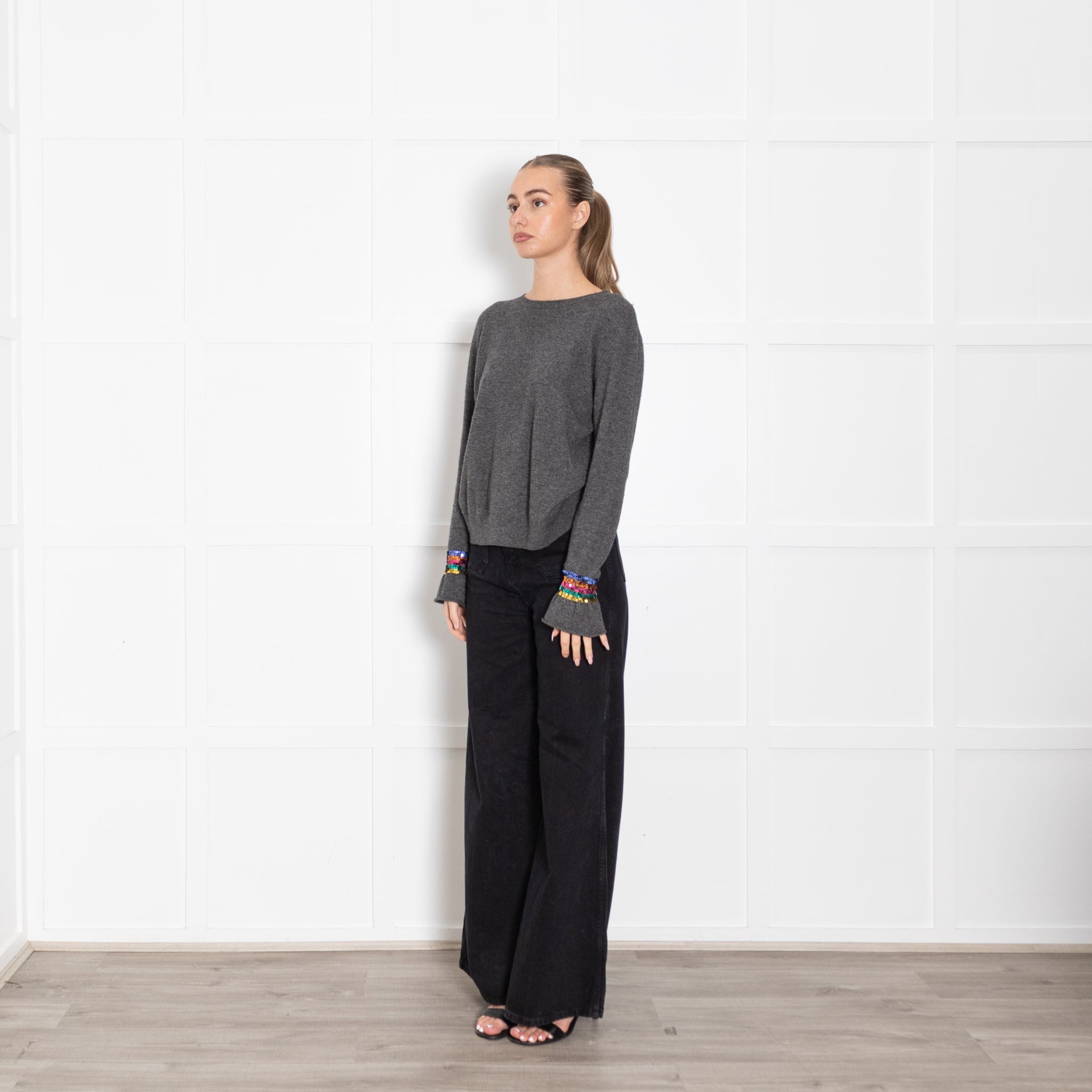 Wyse grey long sleeve jumper, crafted with a soft wool fabric, featuring a classic rounded neckline, and stunning multi-coloured sequin wrists
