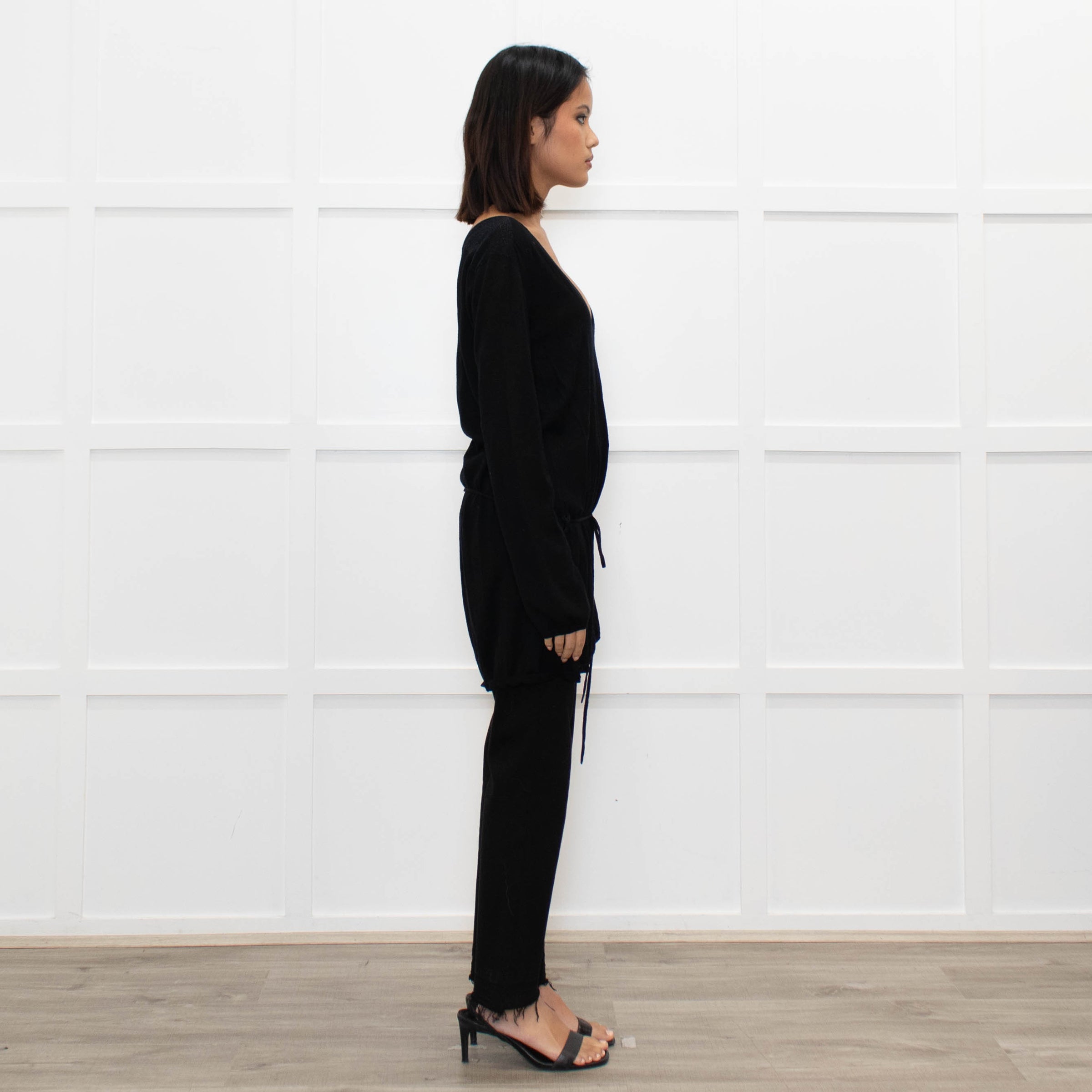Zadig & Voltaire lux black fine knit belted sweater with a V-shaped neckline.